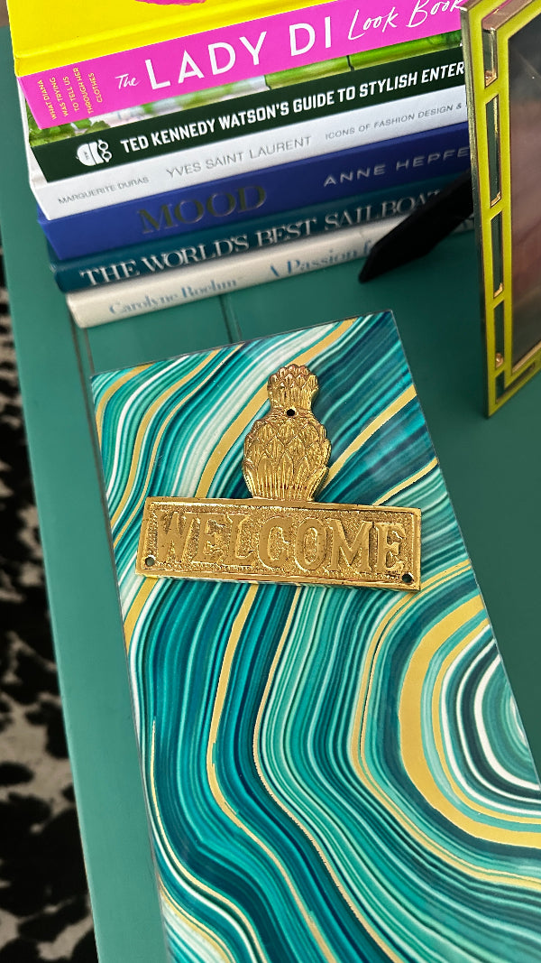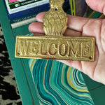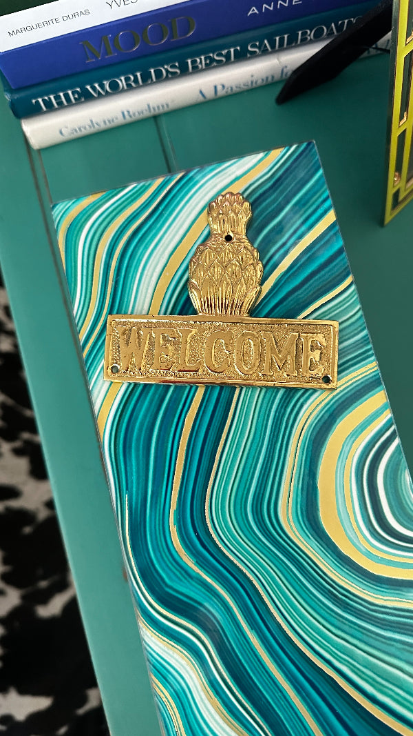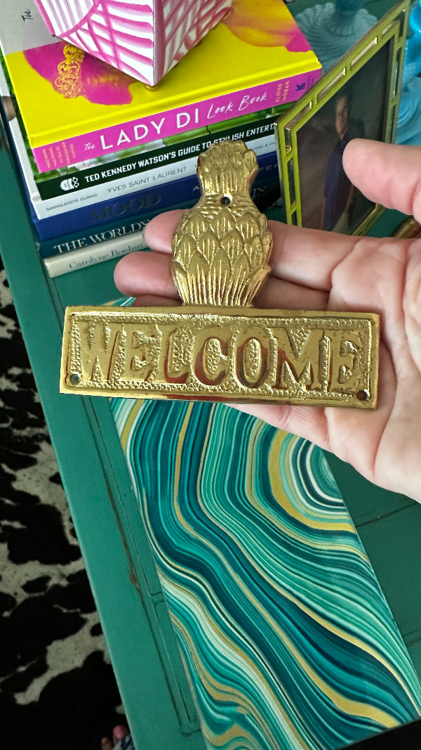 Enhance your entryway with this Vintage Brass Welcome Sign featuring a classic pineapple motif. Crafted with timeless elegance, this piece invites warmth and hospitality into your home, making it a perfect blend of style and tradition. Great as a gift for the bride and groom or new home owner.