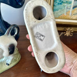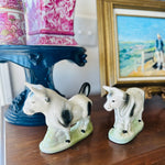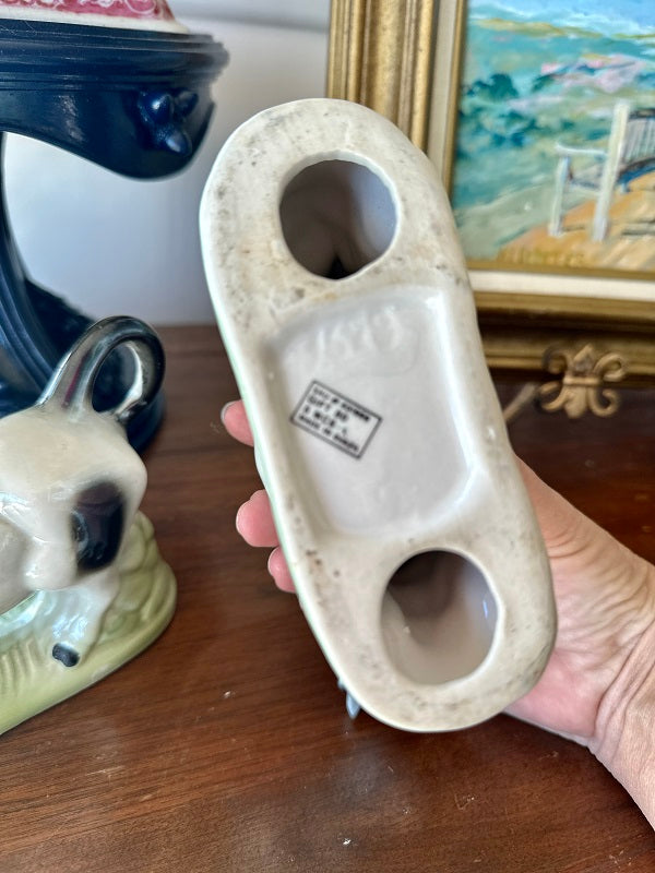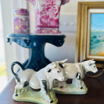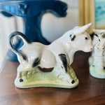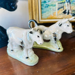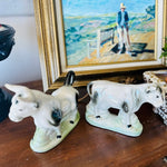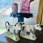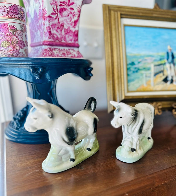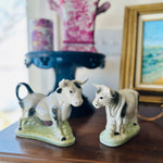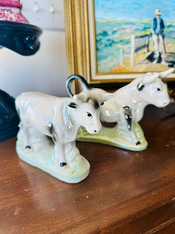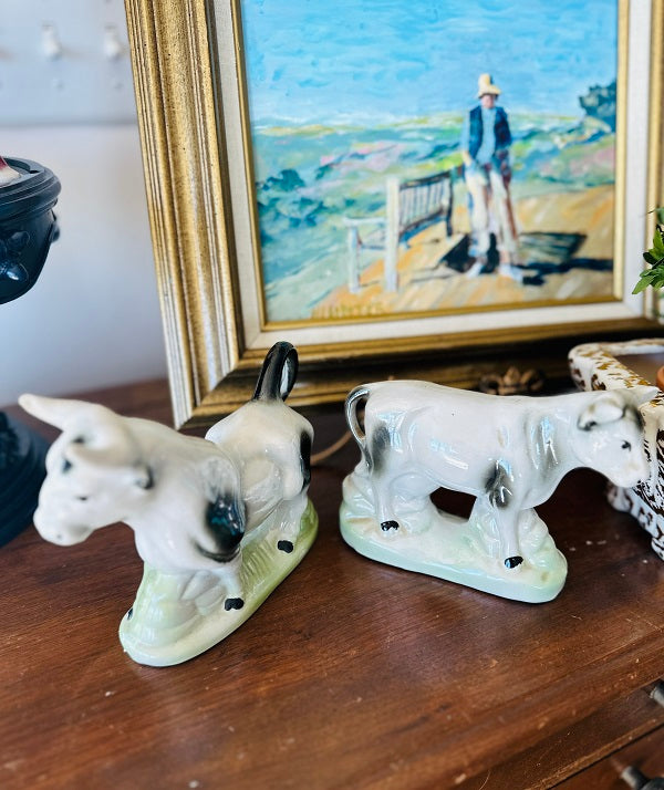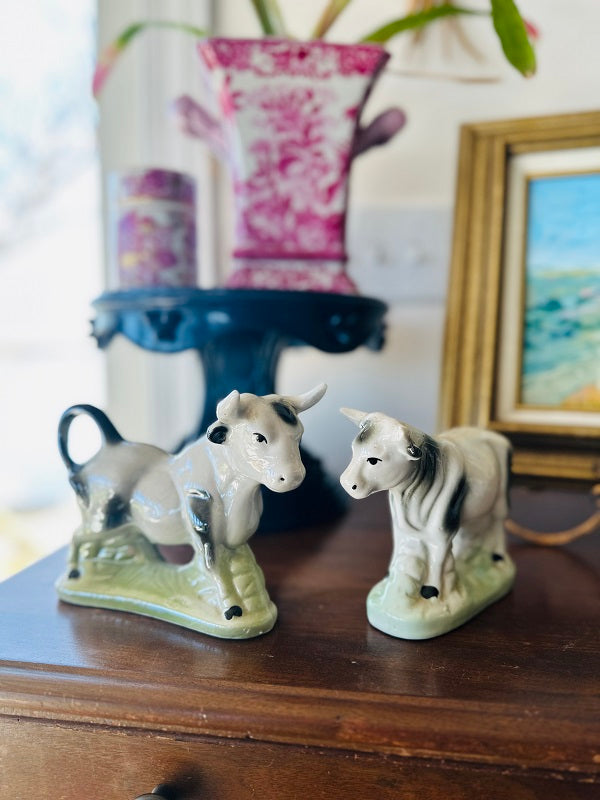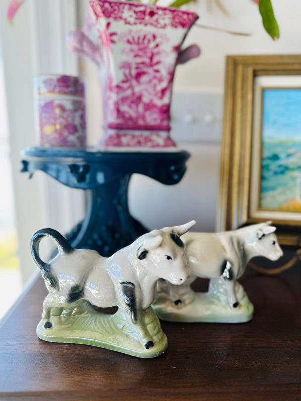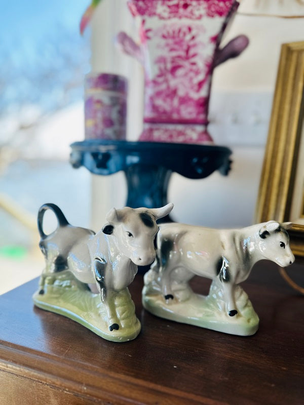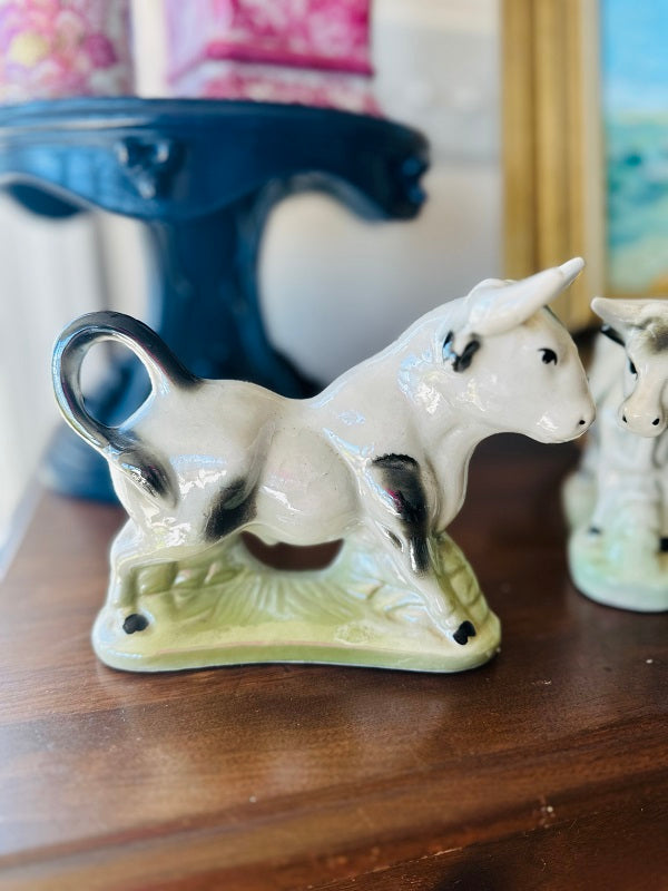 This is no bull! These fun figurines will make a perfect pair on a shelf, table or stack of books. They have that shiny look that makes lusterware so special. Black and white bulls walking in the grass together.One is slightly larger than the other. Made in Brazil and stamped on the bottom. Collecting pairs of animal figures is a fun way to add a feeling of whimsy to any space. Great vintage condition.