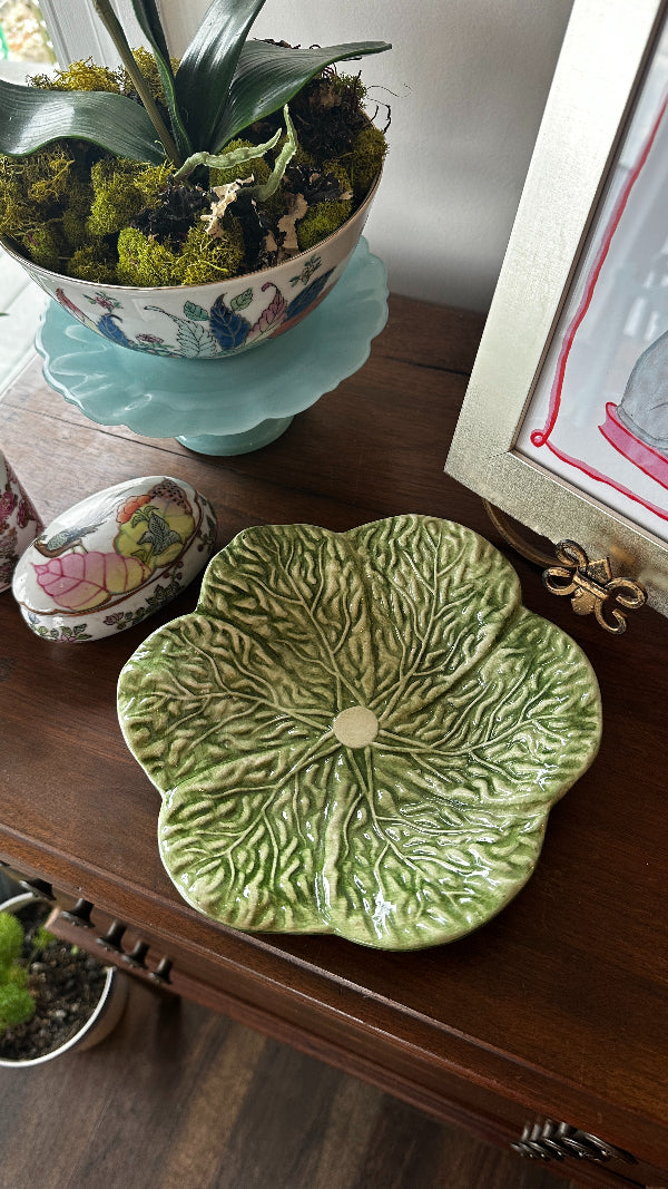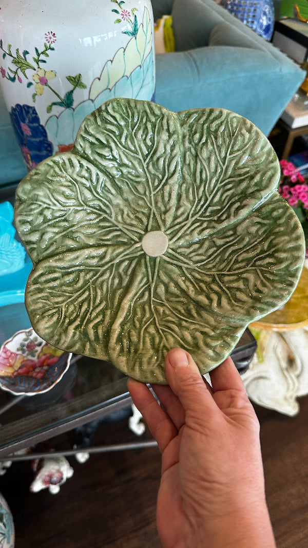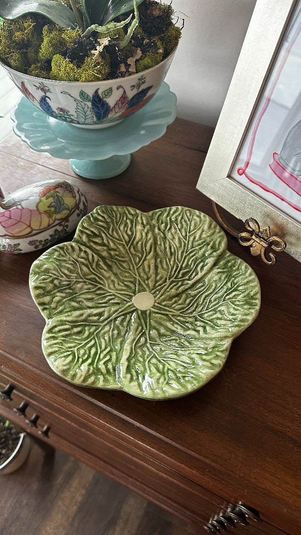Adorn your table with the charming appeal of our Vintage Cabbage Leaf Plate – a delightful shallow bowl in vibrant green, crafted in Portugal. This unique piece showcases the intricate detail of cabbage leaf design, adding a touch of nature-inspired elegance to your dining experience. A highly popular and collectible pattern that's perfect year round.