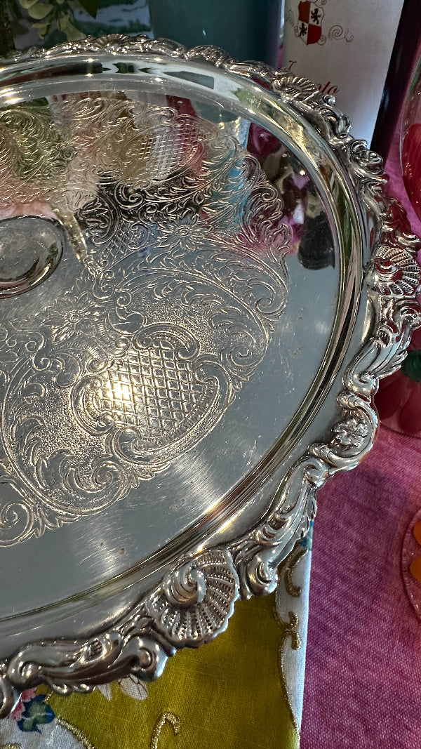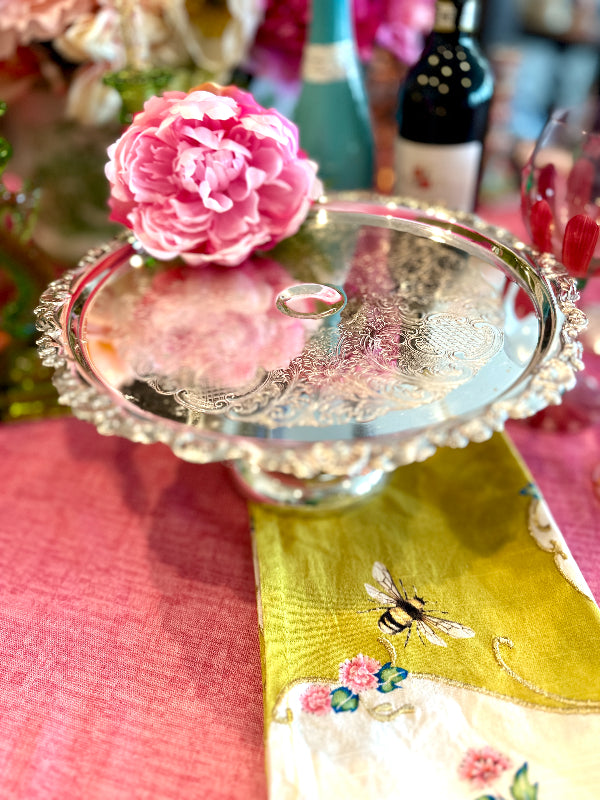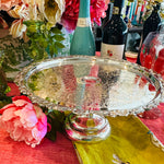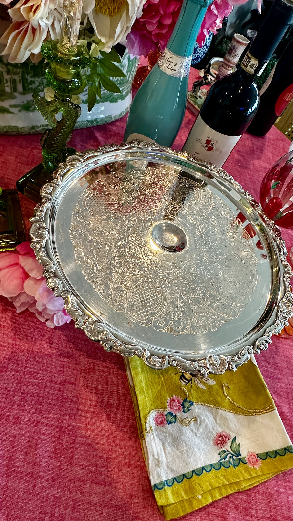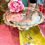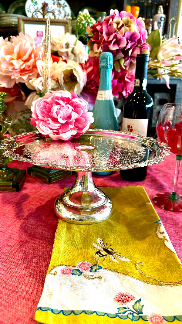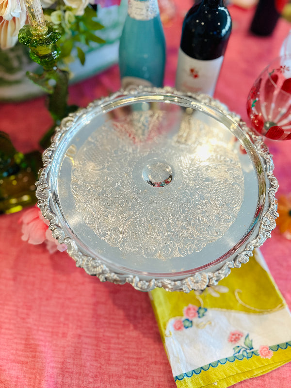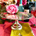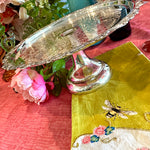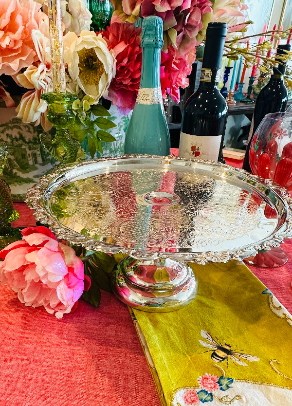 Vintage Cake Plate Stand crafted in elegant Silverplate, adorned with ornate scrollwork. Elevate your culinary presentation with these exquisite pieces, perfect for showcasing delectable desserts and treats. Explore our curated collection to add a touch of vintage sophistication to your table.
