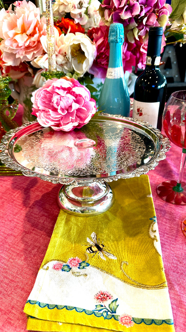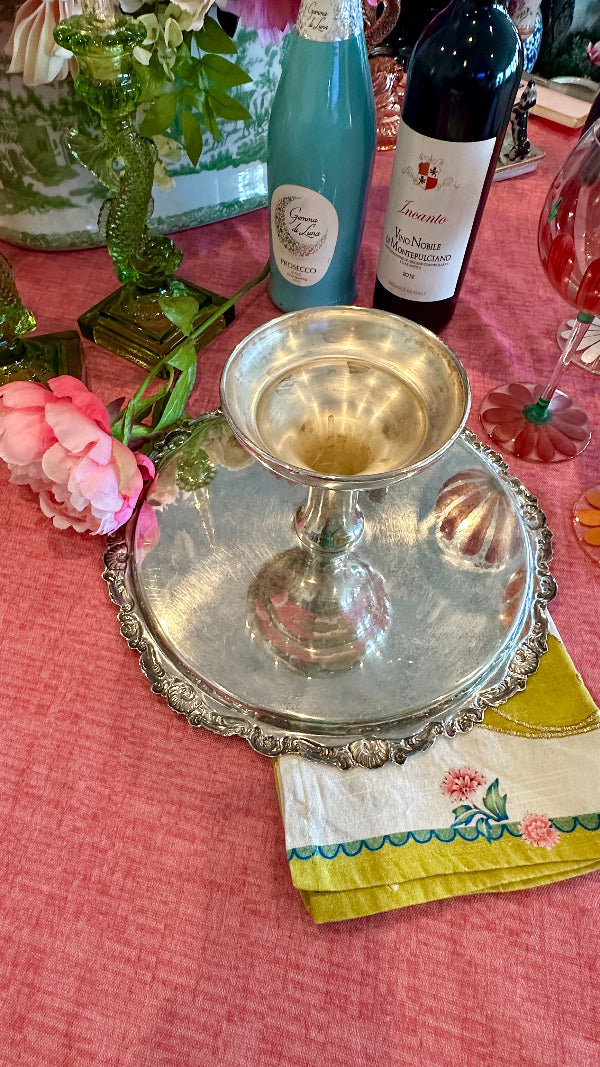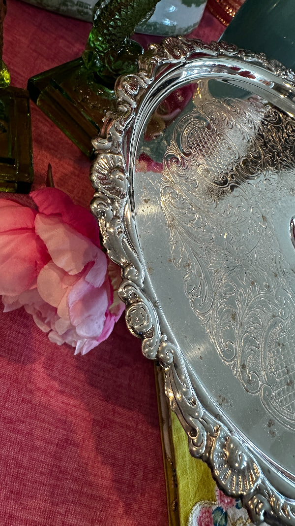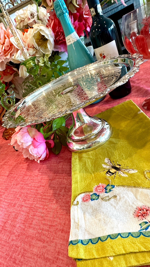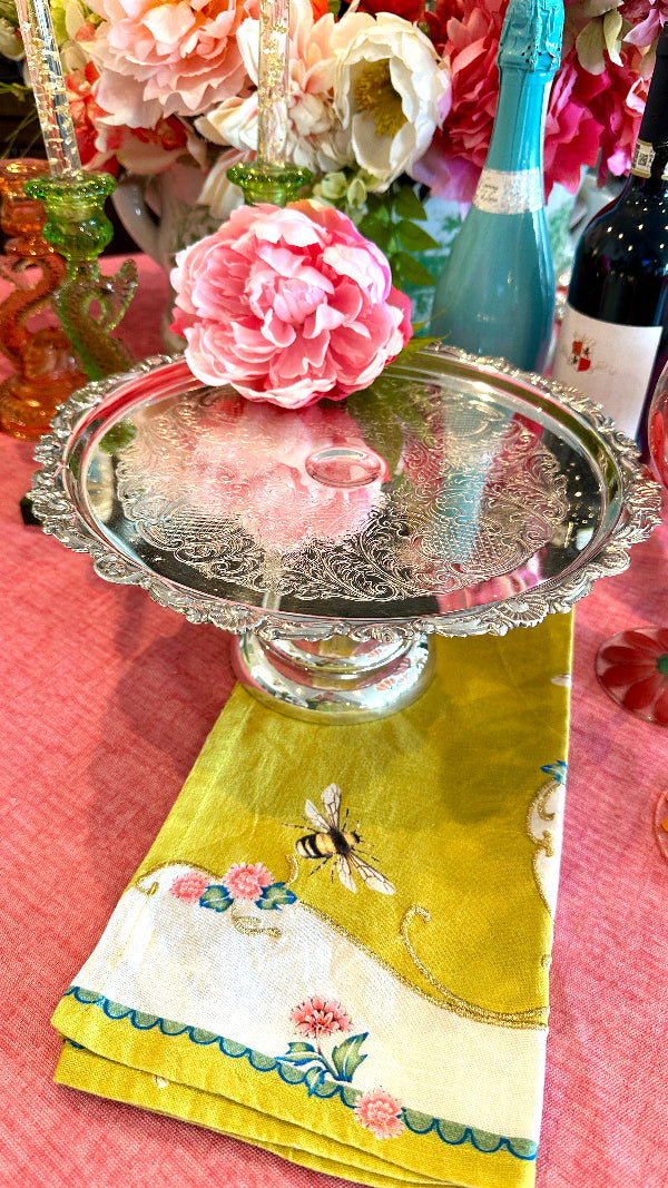 Vintage Cake Plate Stand crafted in elegant Silverplate, adorned with ornate scrollwork. Elevate your culinary presentation with these exquisite pieces, perfect for showcasing delectable desserts and treats. Explore our curated collection to add a touch of vintage sophistication to your table.