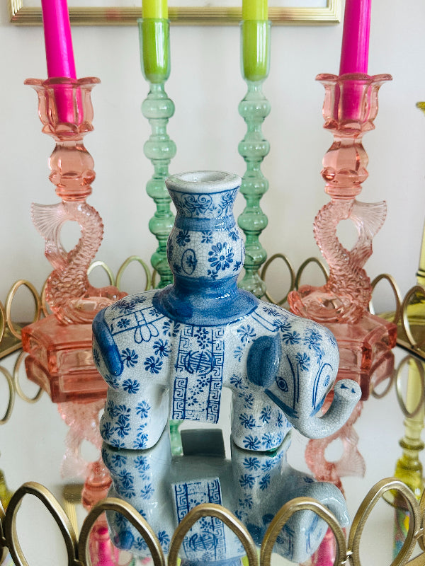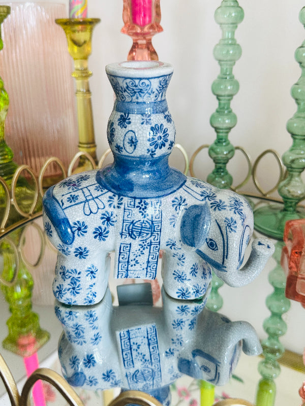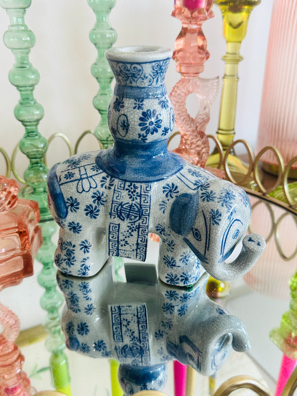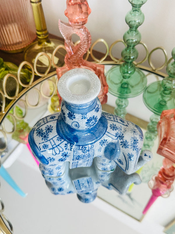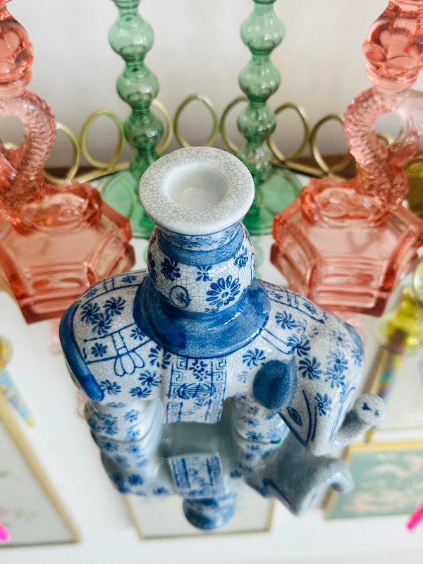Trunks up! This amazing elephant candle holder will ad that perfect touch of whimsy to your space. Display it on a table or shelf for that classic blue and white look. The elephant's ead is turned with it's trunk raised. It has floral and greek key details. Great vintage condition.