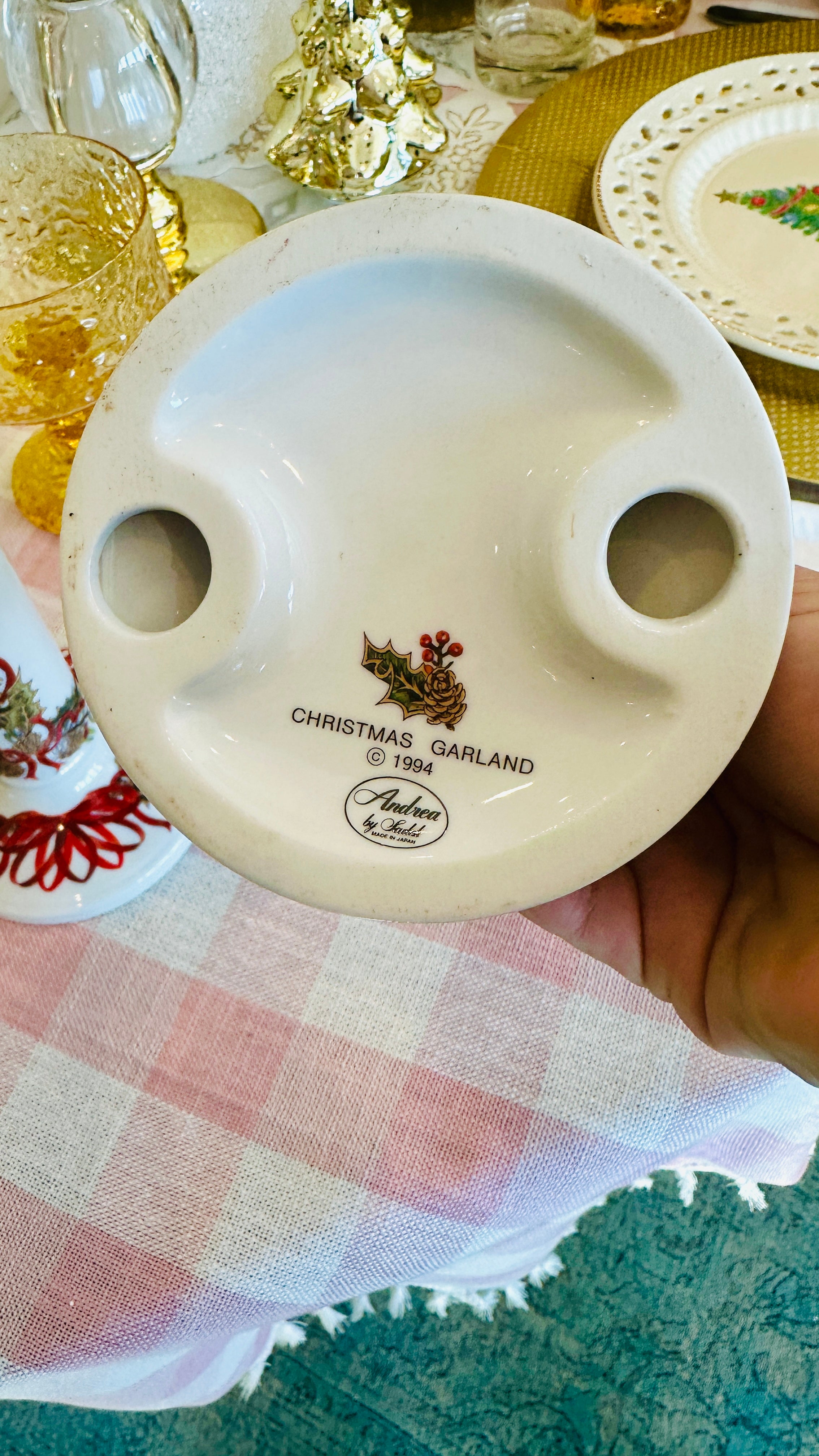 Celebrate the season with the Vintage Candle Holders made in 1994 by Andrea by Sadek, featuring a beautiful Christmas Garland design. Crafted with exquisite detail, these candle holders add a festive touch to your holiday decor. Perfect for creating a warm, inviting atmosphere during the holidays, they bring timeless elegance to any setting.