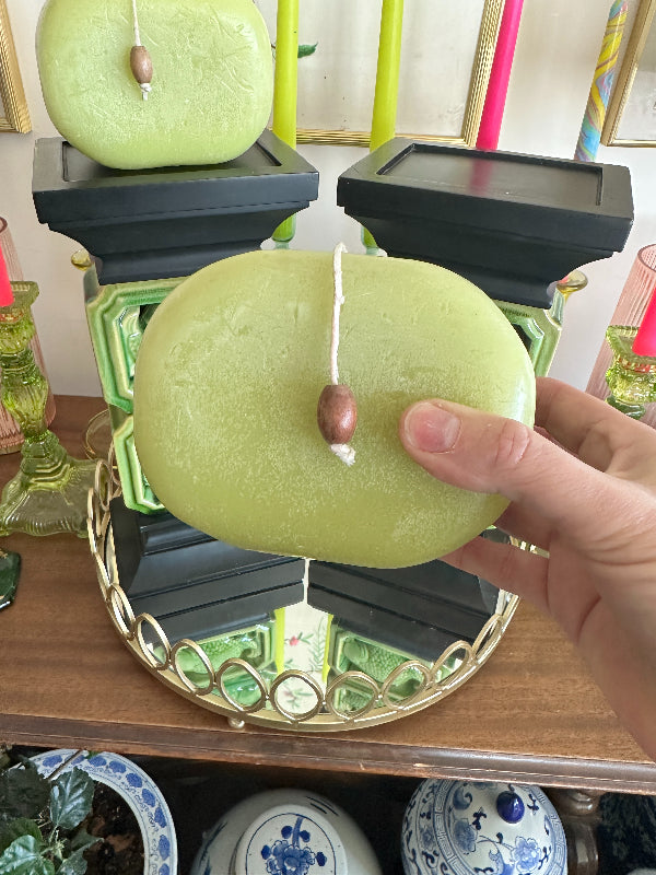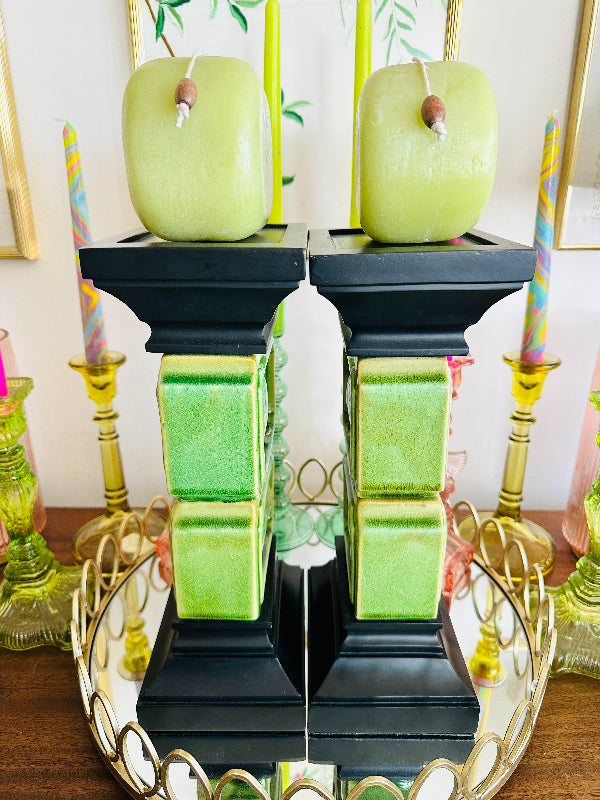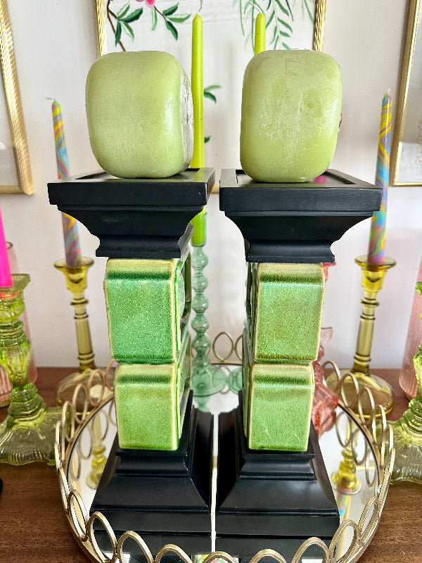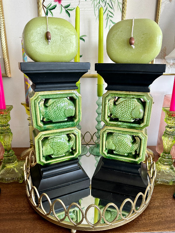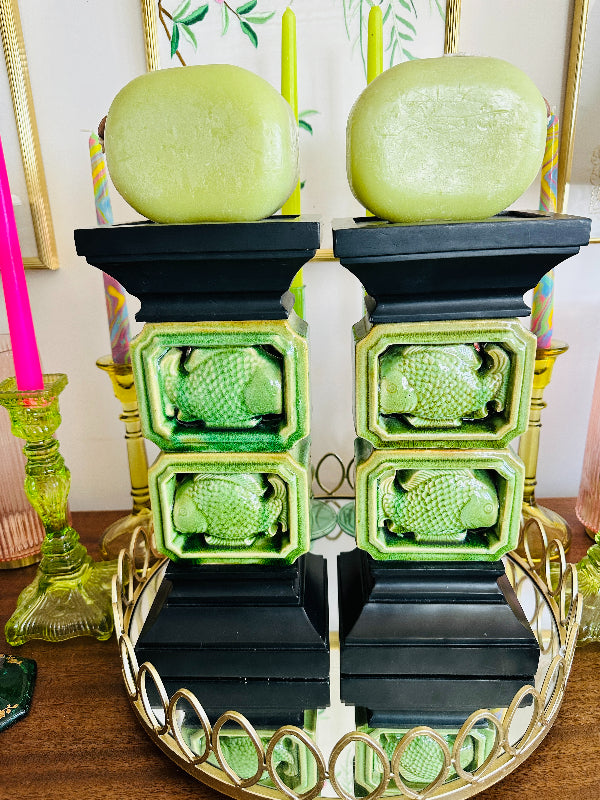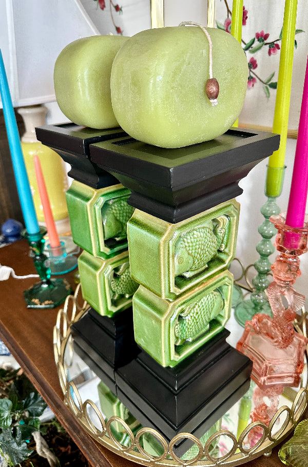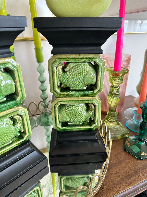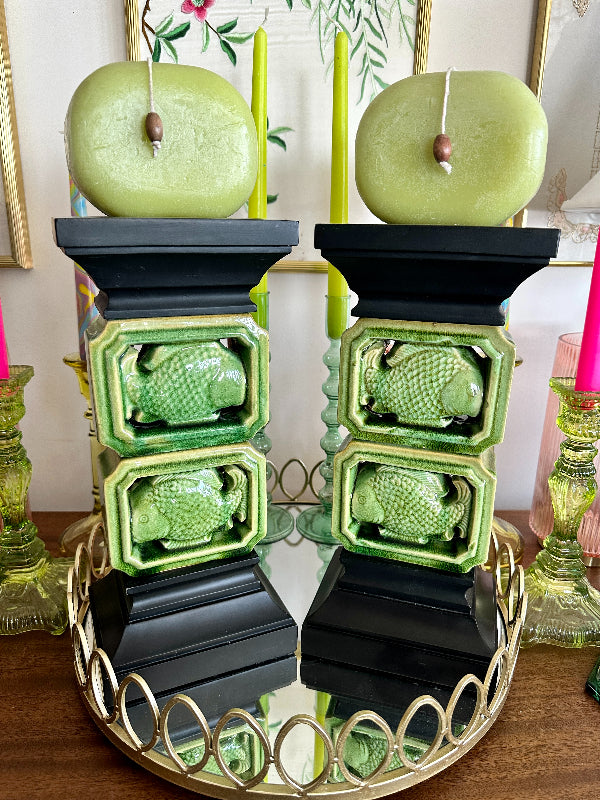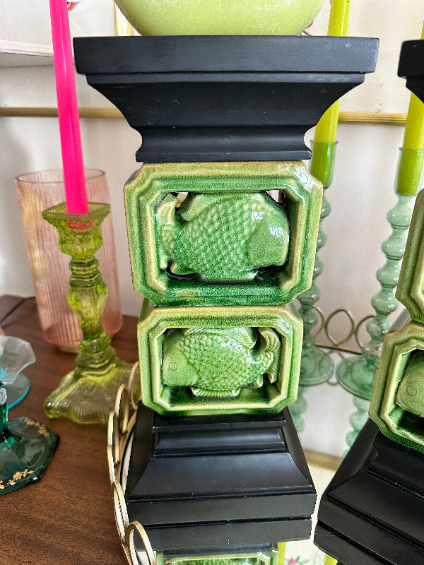 These extra large candle holders and huge green candles make a real statement on a dining table, buffet or mantel. The fish are glazed ceramic and the black parts are wooden. They are nice and heavy. Each candle has a long wick with a bead at the end. Great vintage condition.