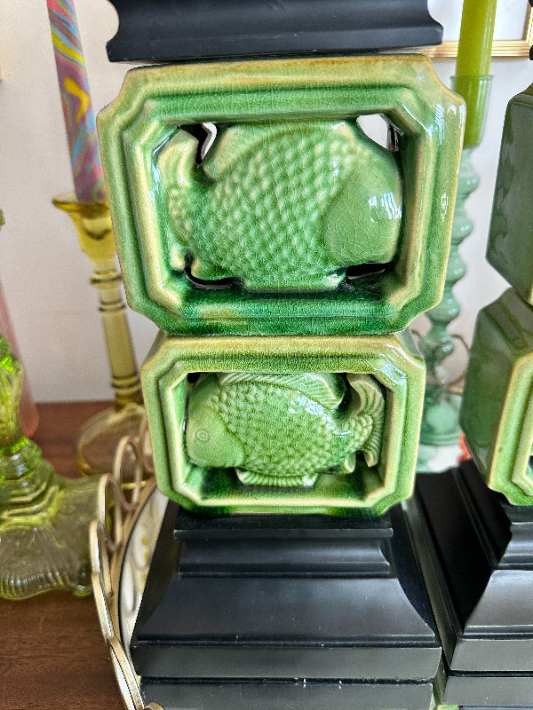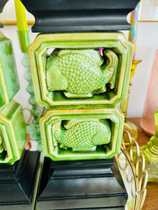 Vintage Candle Holders, Green Ceramic Fish with Black wood base and top, comes with 2 Green Candles