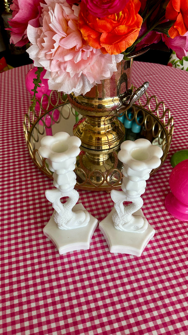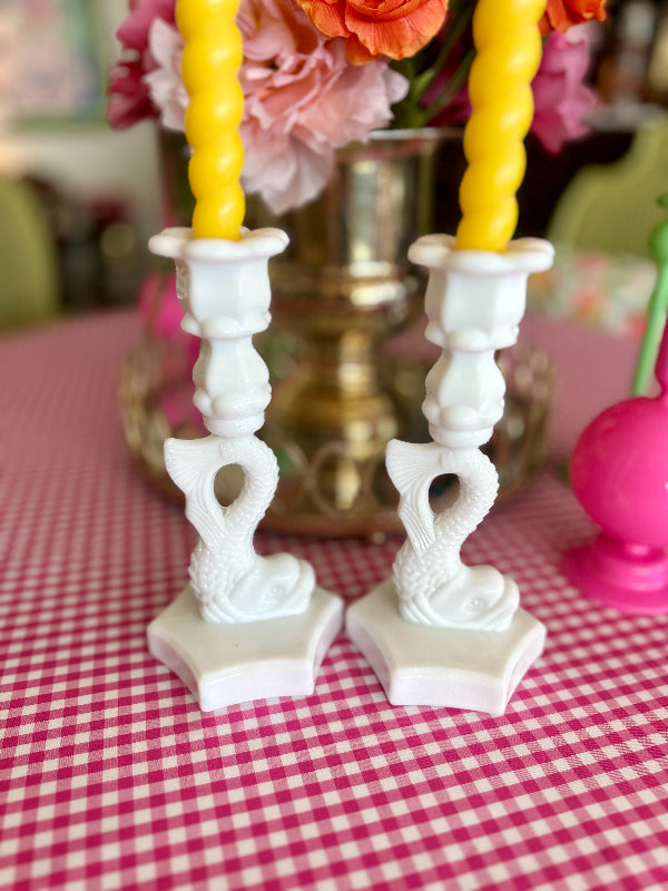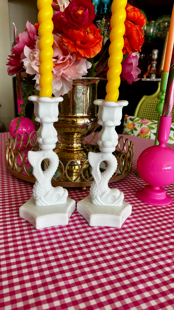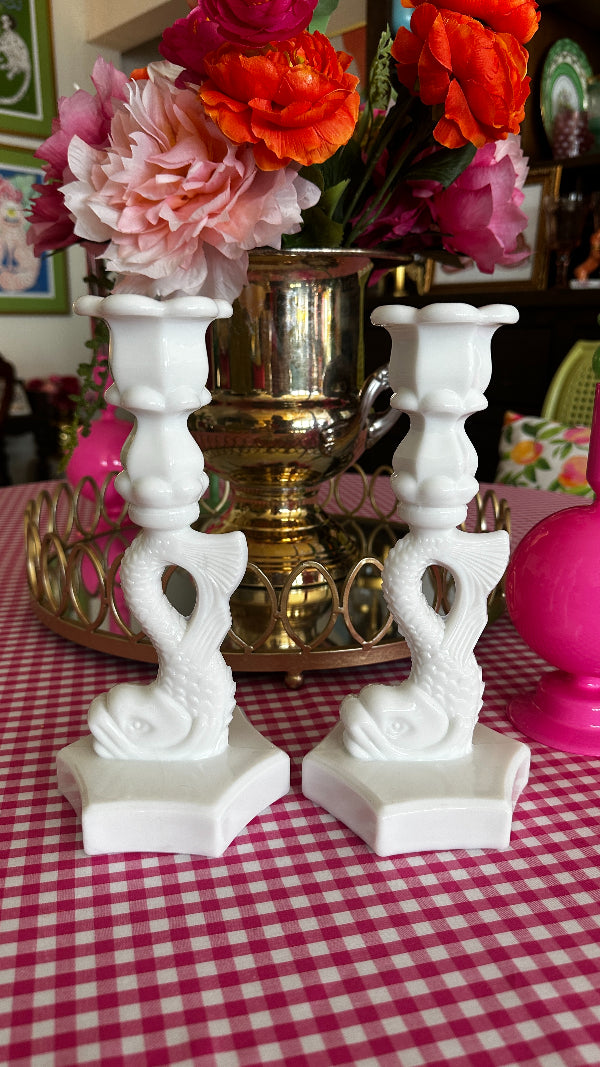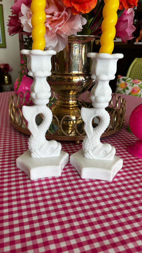 Vintage Candle Holders, Koi Fish, Westmoreland MIlk Glass, Pair