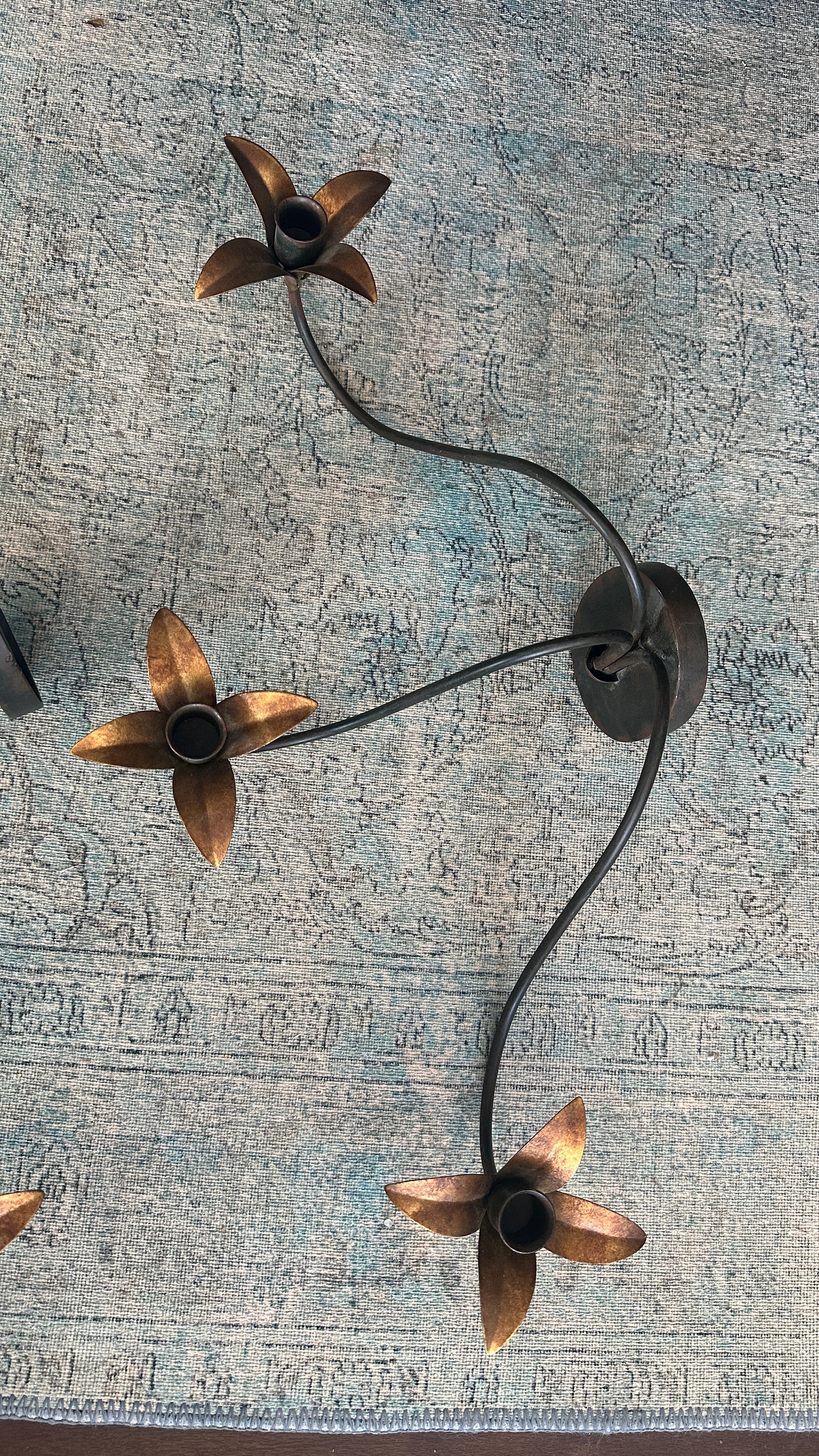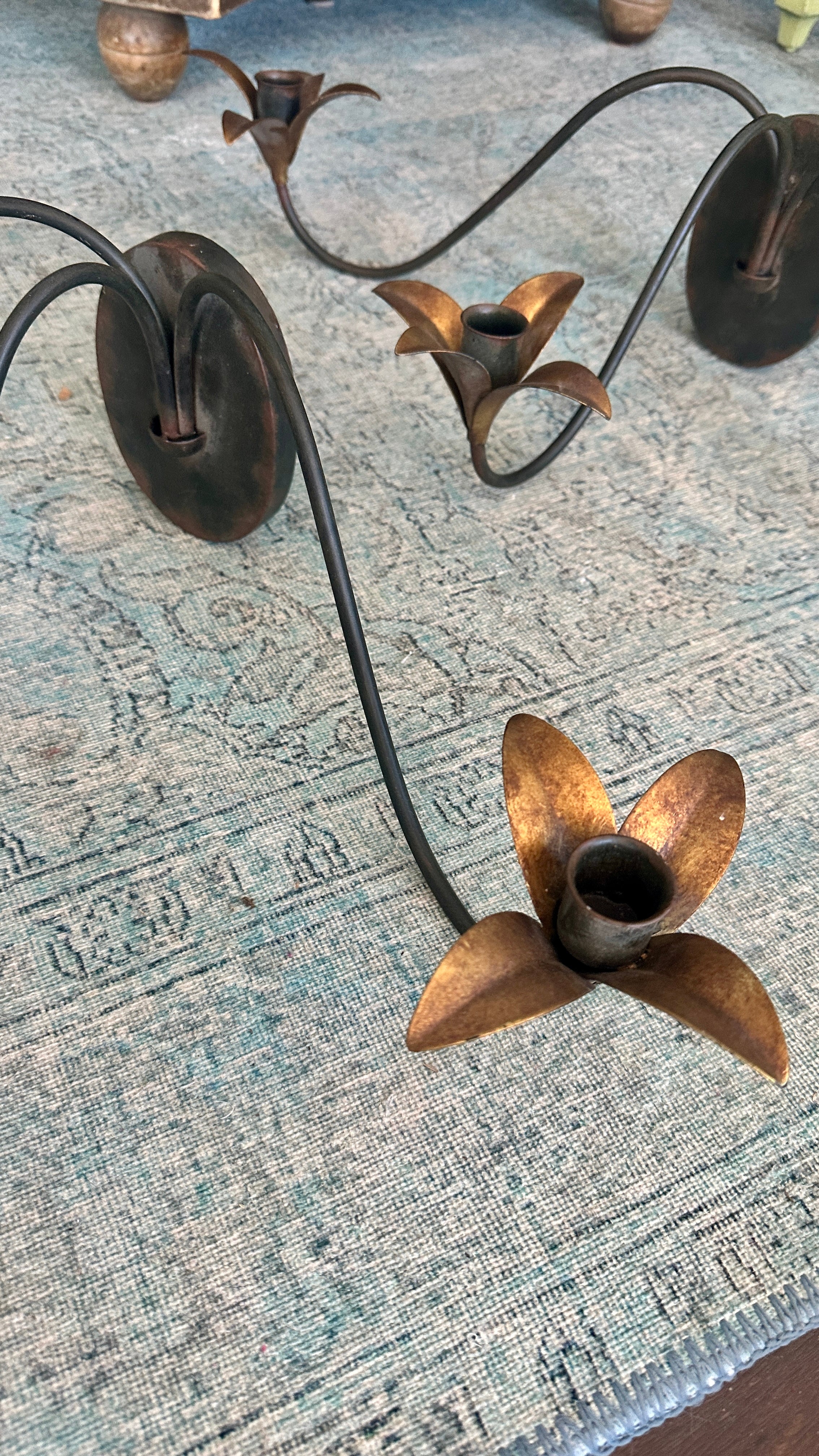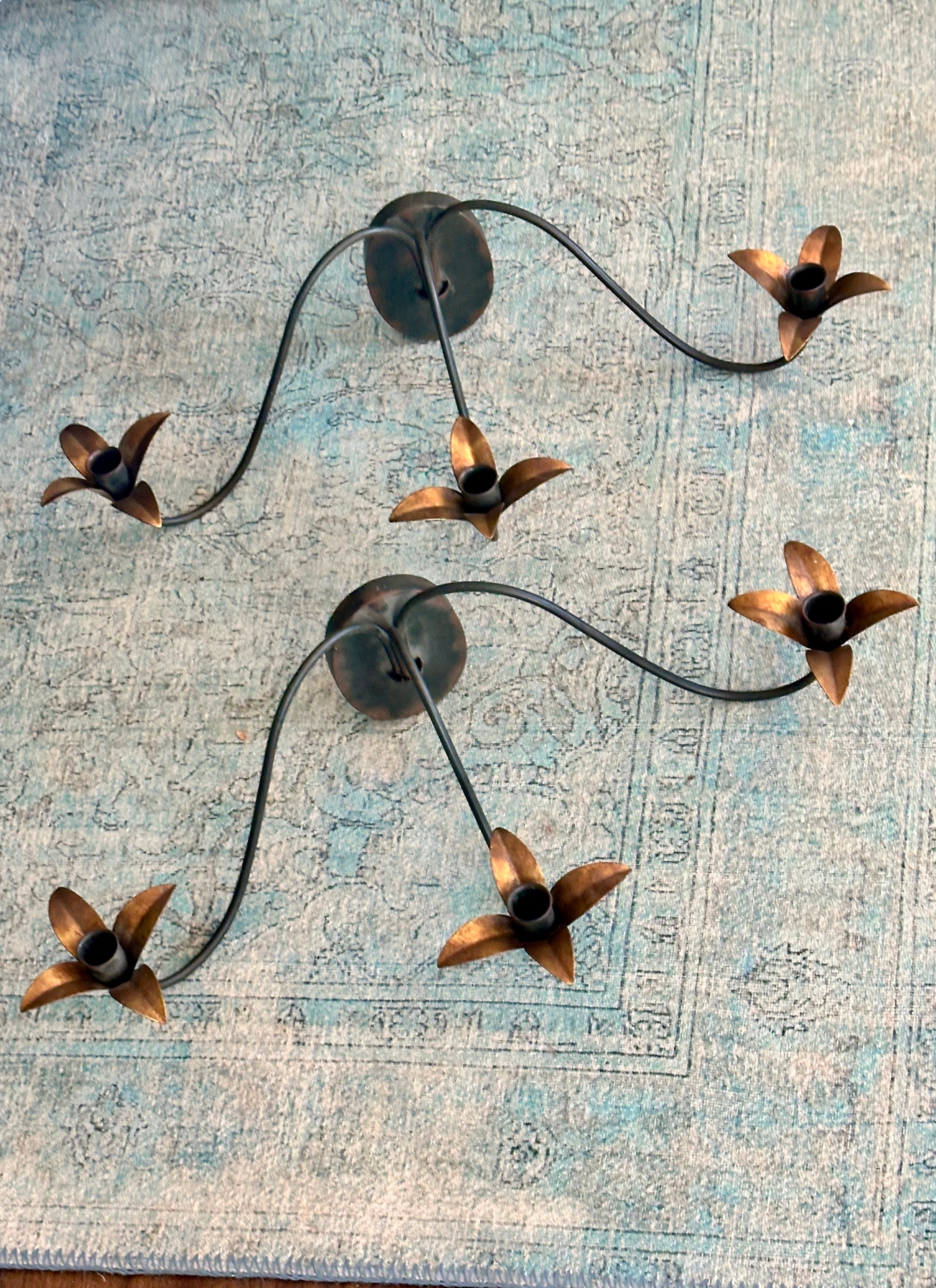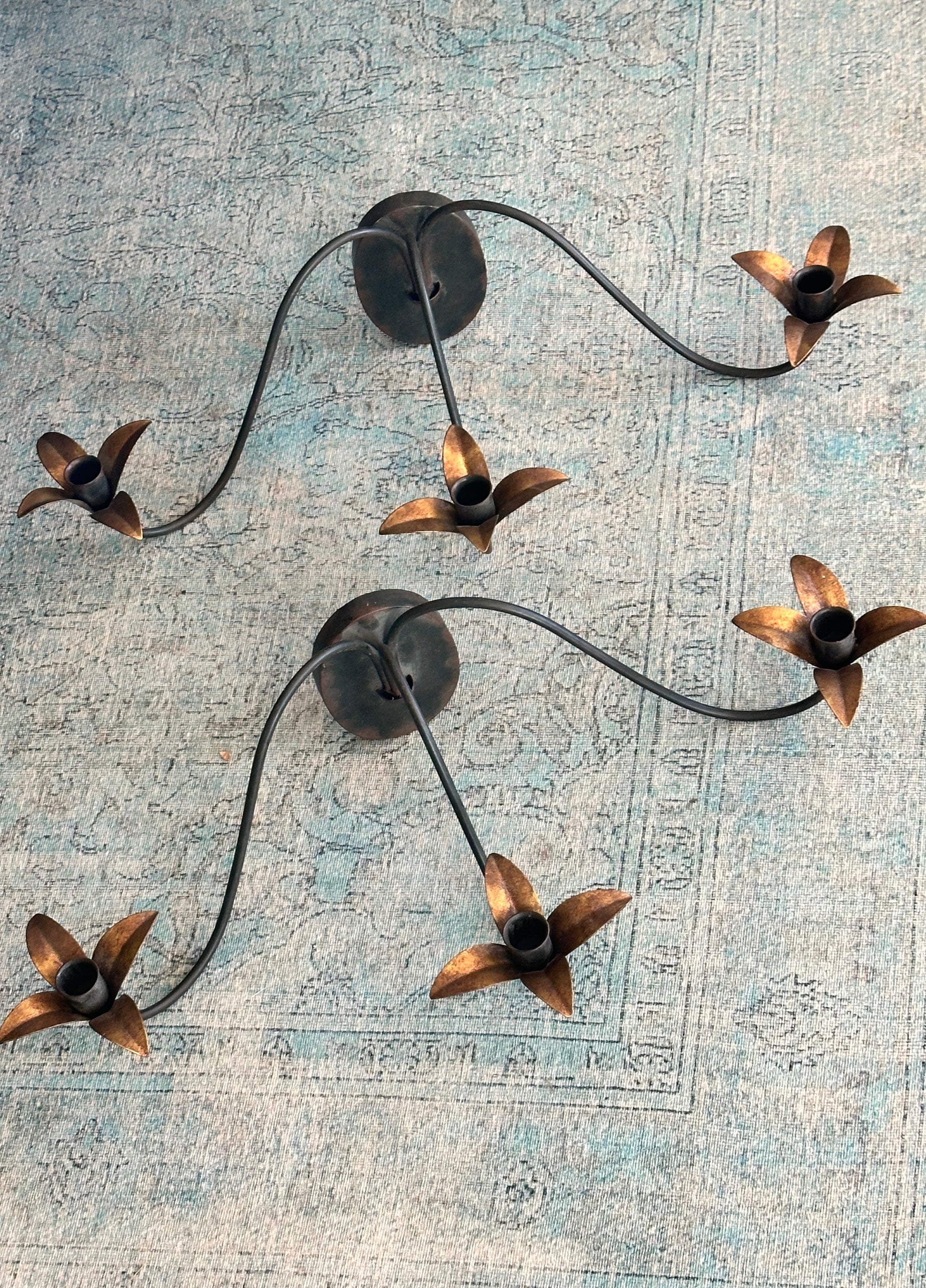 Add a touch of old-world elegance to your home with this exquisite pair of vintage candle sconces. ,These wall-mounted holders feature intricate detailing, combining durability with timeless charm. Each holds 3 candles. Perfect for creating a warm, inviting ambiance, they make a stunning addition to any hallway, dining room, or living space. Whether used for functional lighting or as decorative accents, these sconces bring a classic, sophisticated touch to any décor. A must-have for vintage enthusiasts and lovers of antique-inspired design