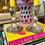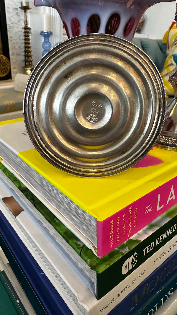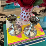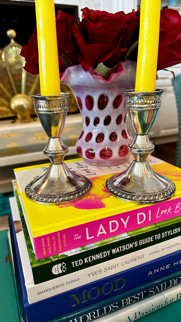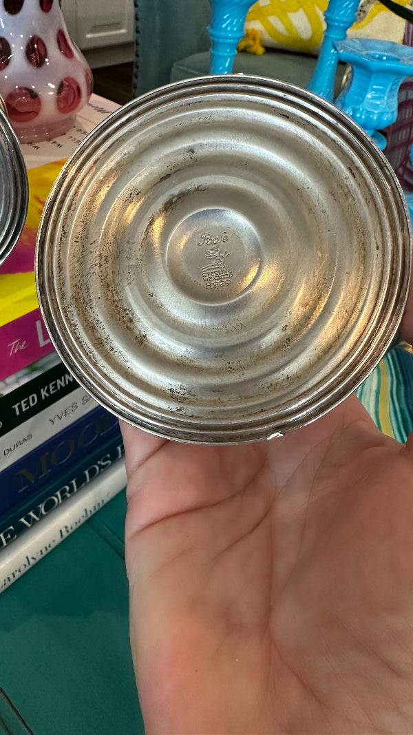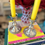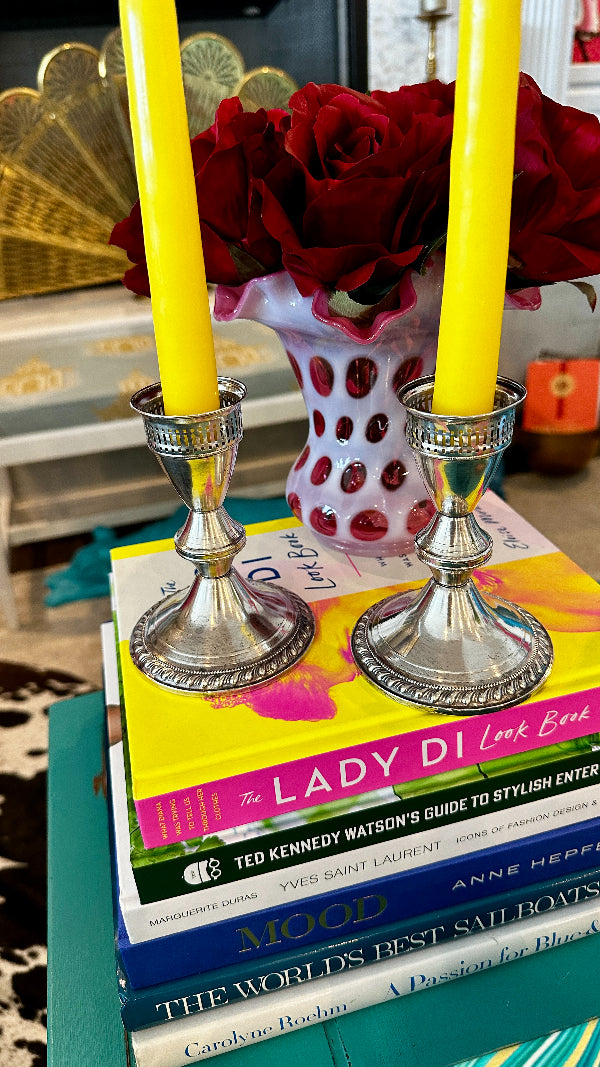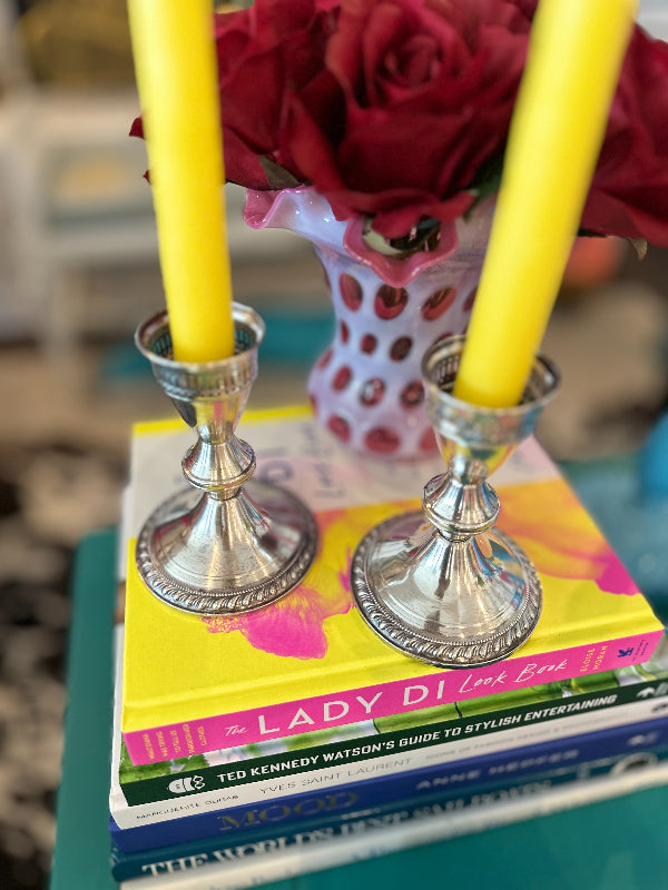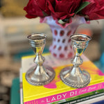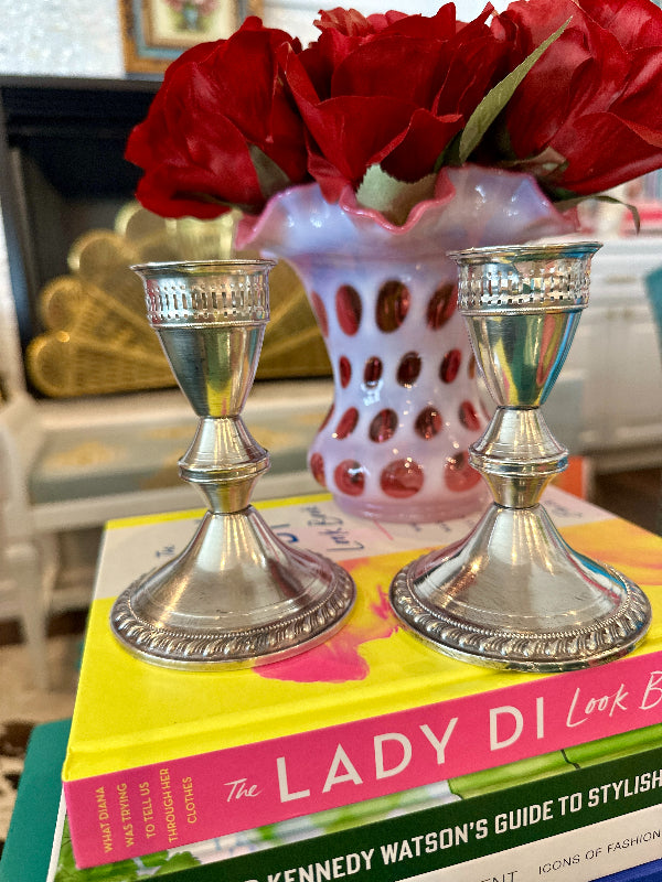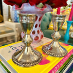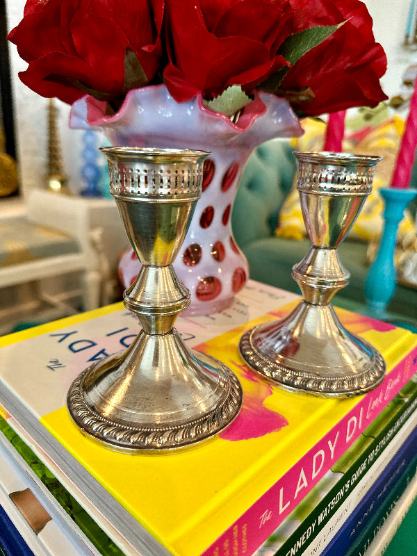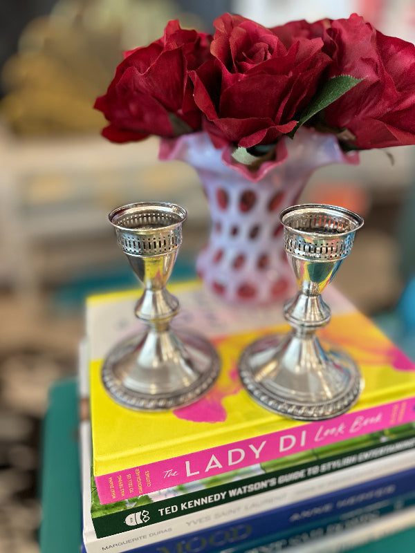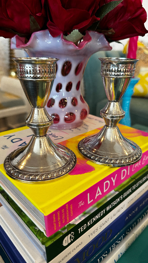 Vintage Candlesticks by Poole. Crafted with sterling silver weighted H200, these candlesticks add a touch of sophistication to any setting. Perfect for creating an ambiance of warmth and luxury, these vintage treasures are sure to elevate your decor. Enhance your space with the classic beauty and enduring quality of Poole's sterling silver candlesticks. Hurricane glass can be added to these for an extra special look.