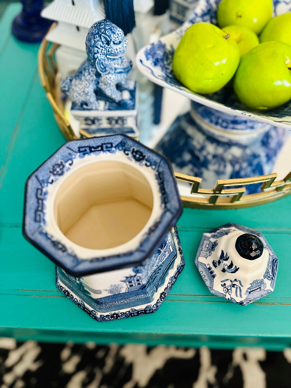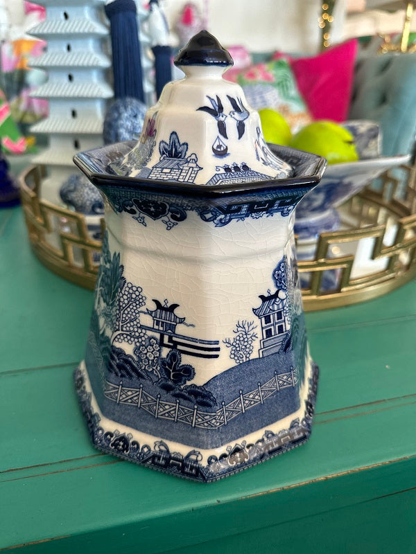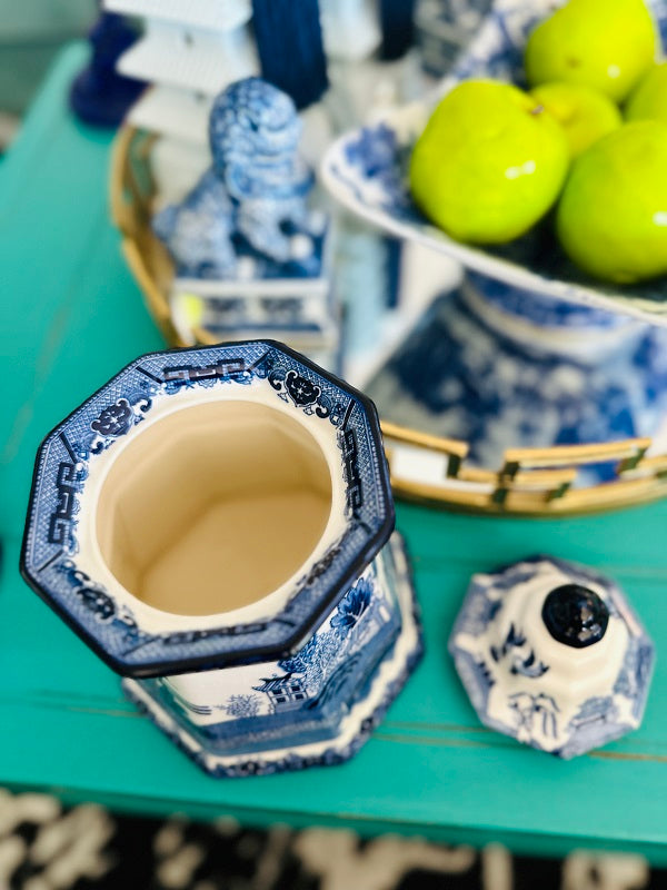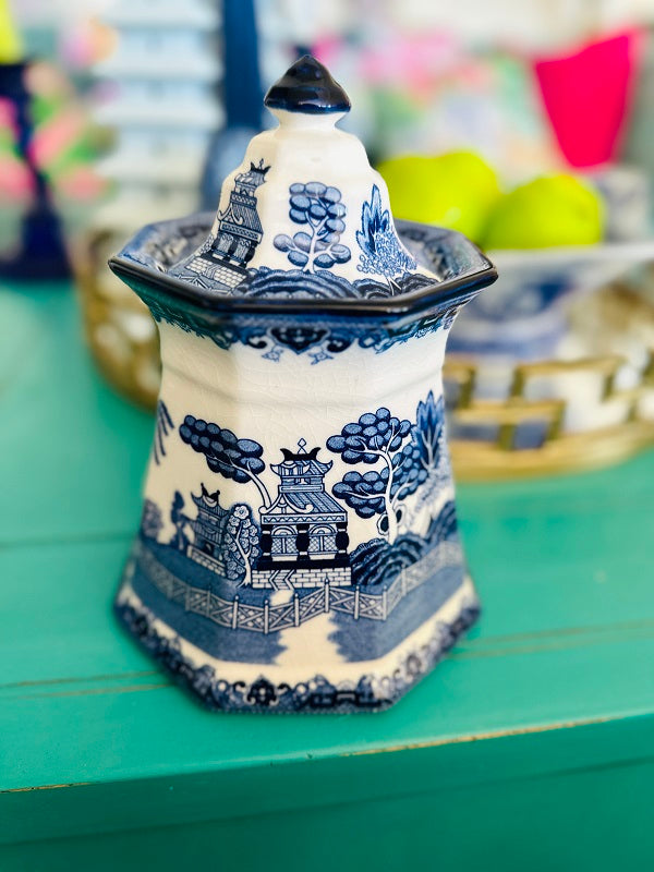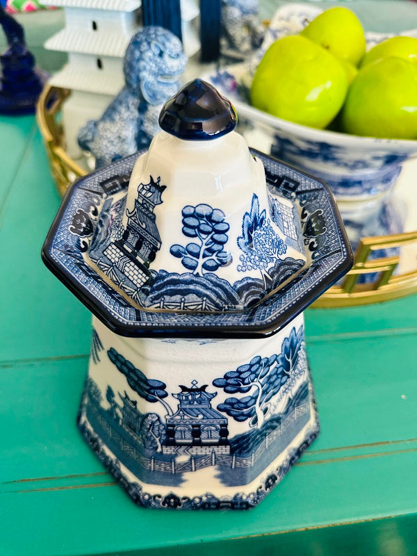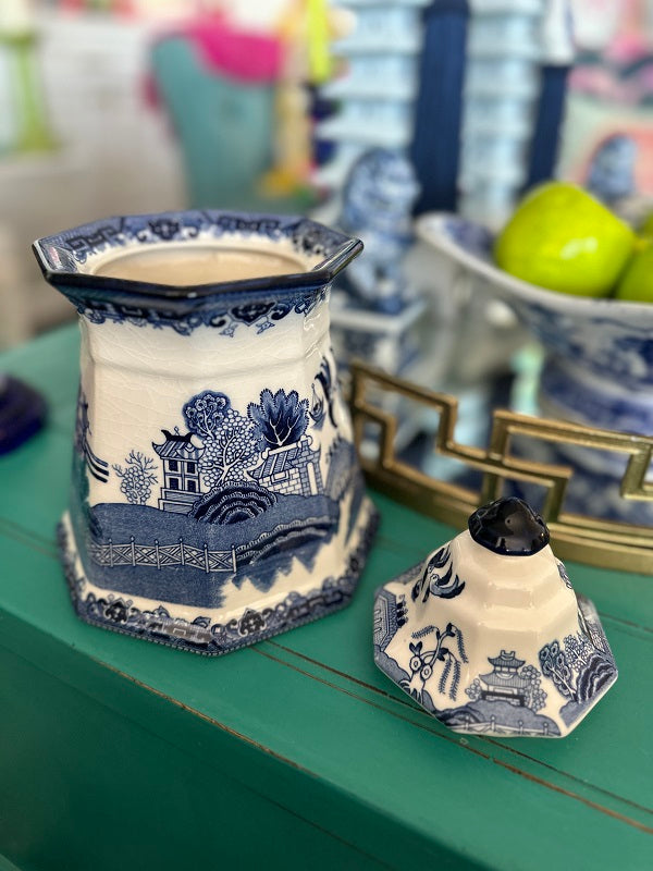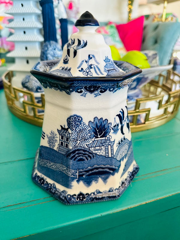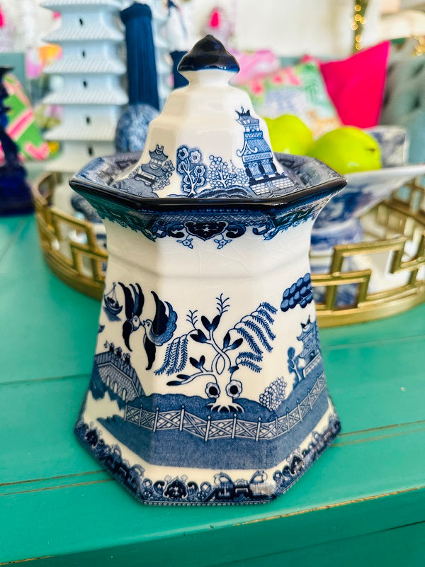 Vintage Canister, Fenton Blue Willow Ironstone, Porcelain Lidded Jar, Chinoiserie, Blue and White