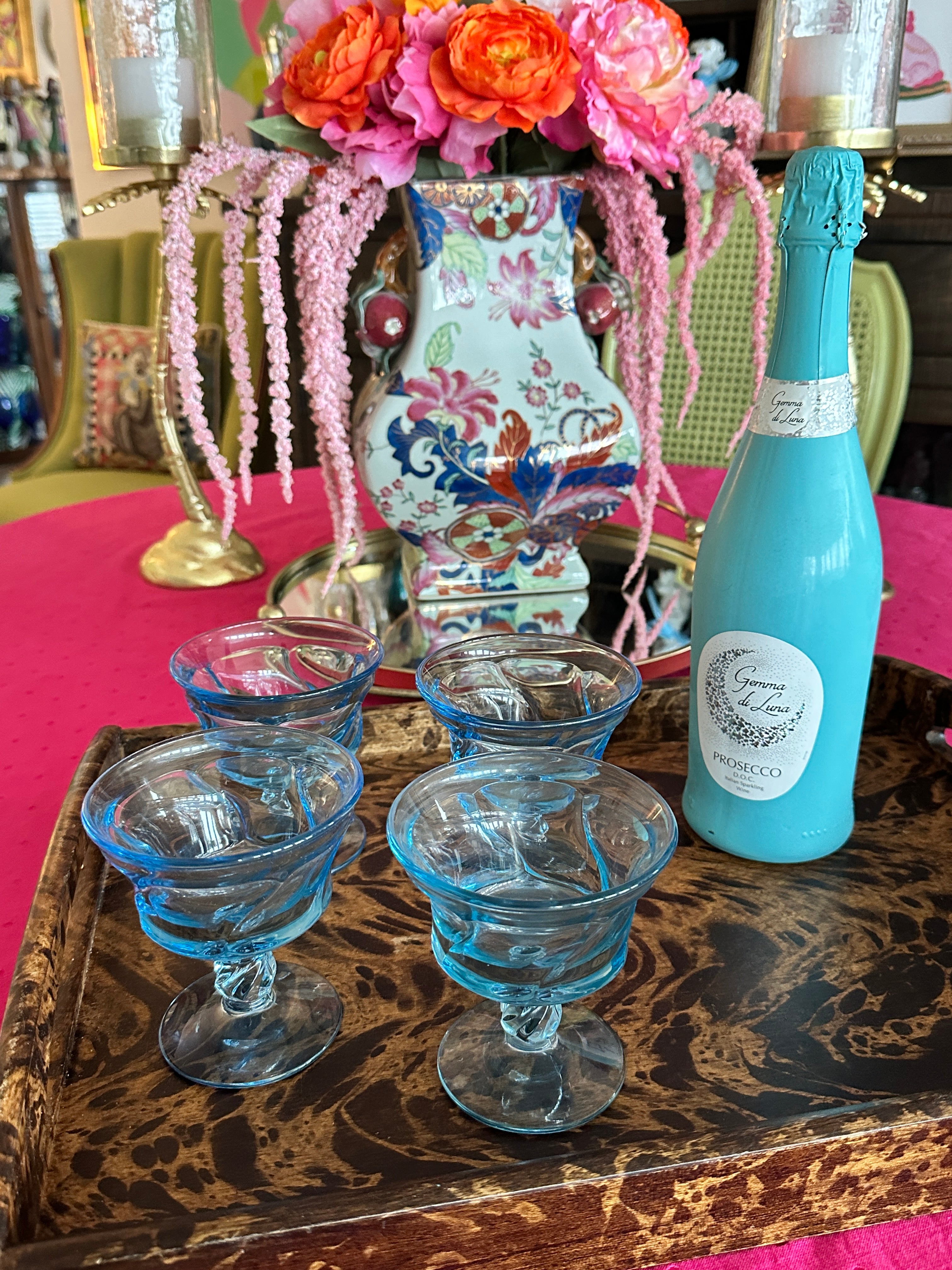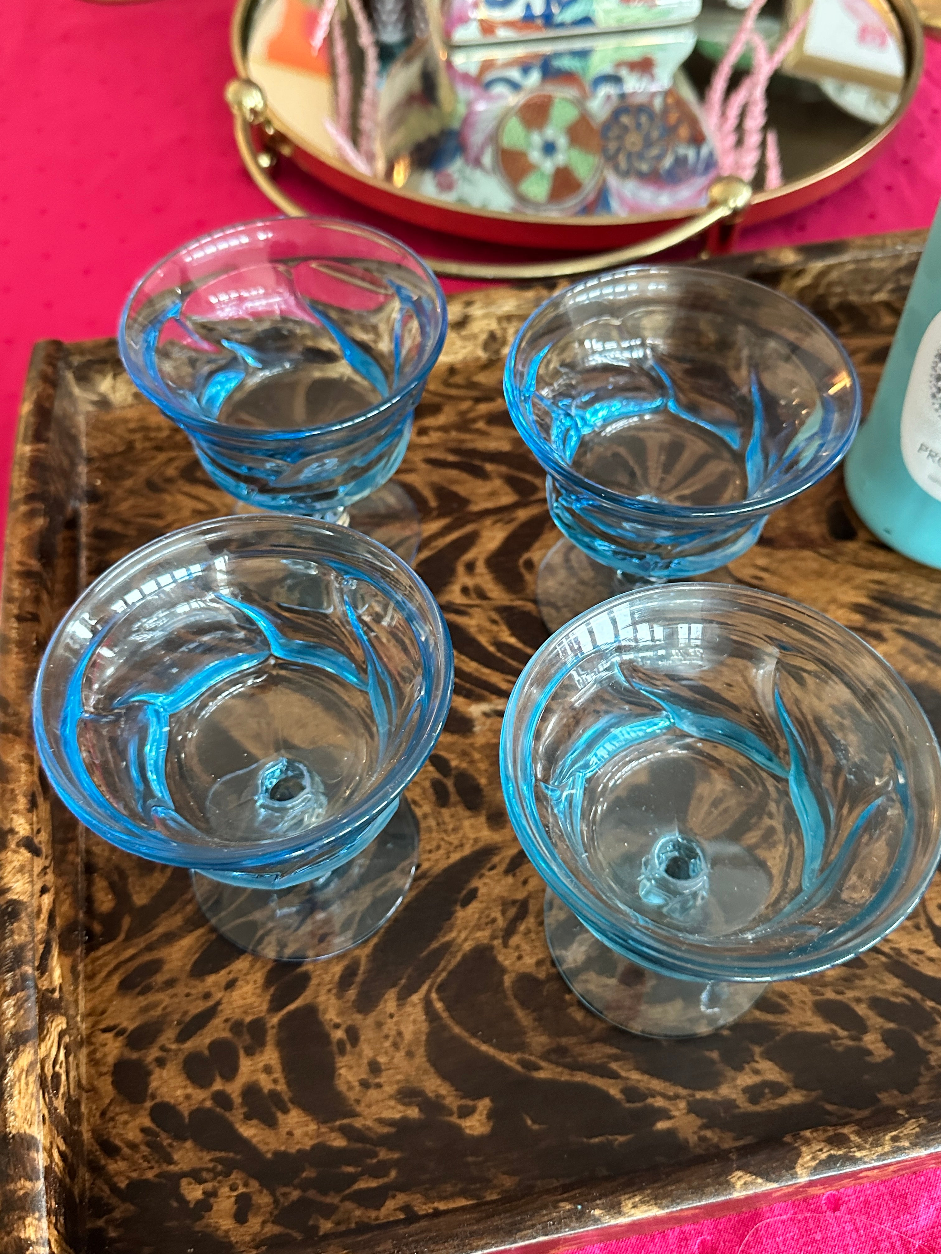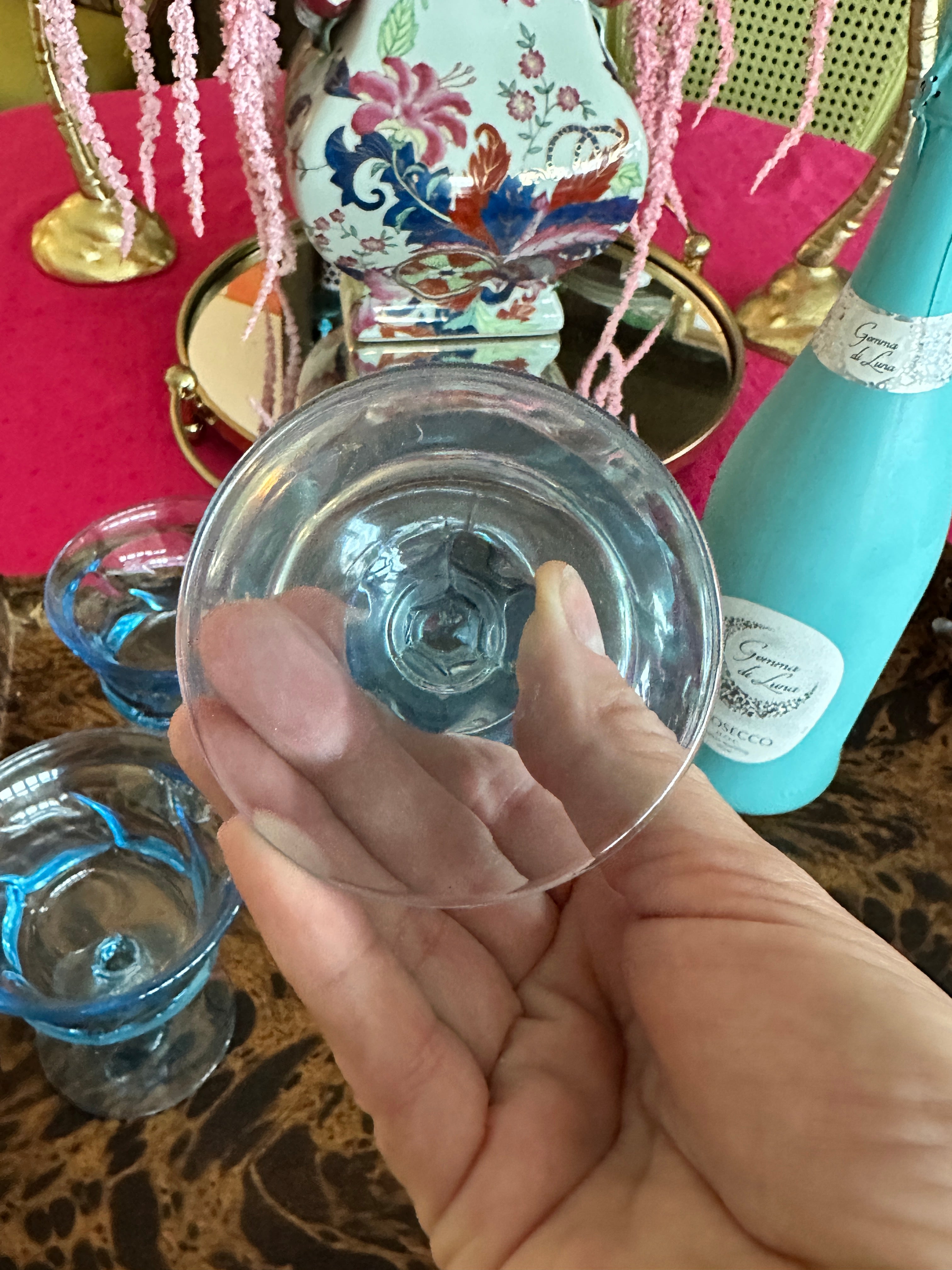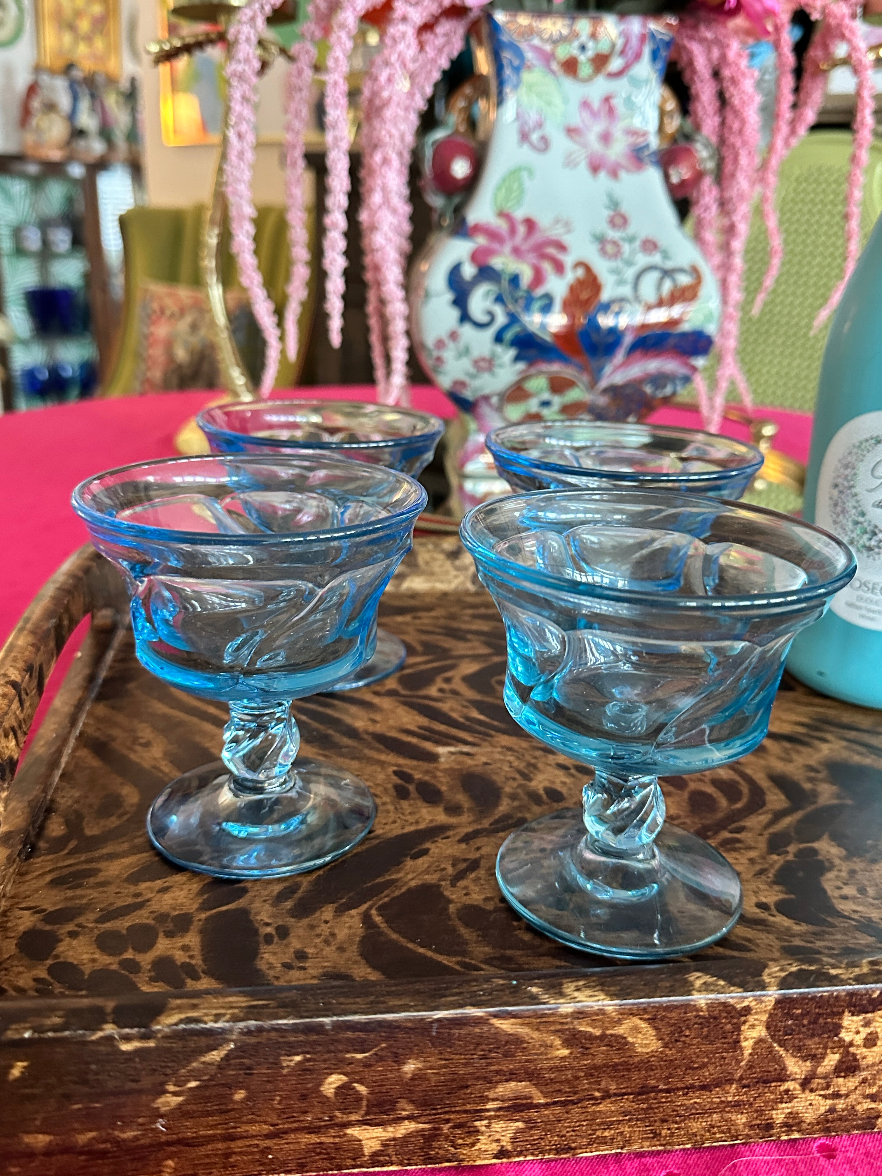 This is a set of Jamestown blue champagne/sherbet glasses in the iconis swirl pattern. This company has a long history of quality and excellence.. and they are an American company. Great vintage condition no chips or cracks.