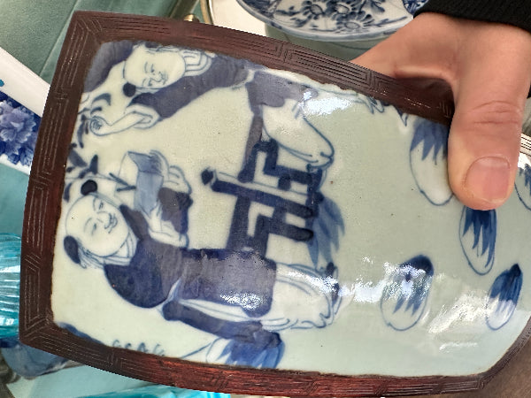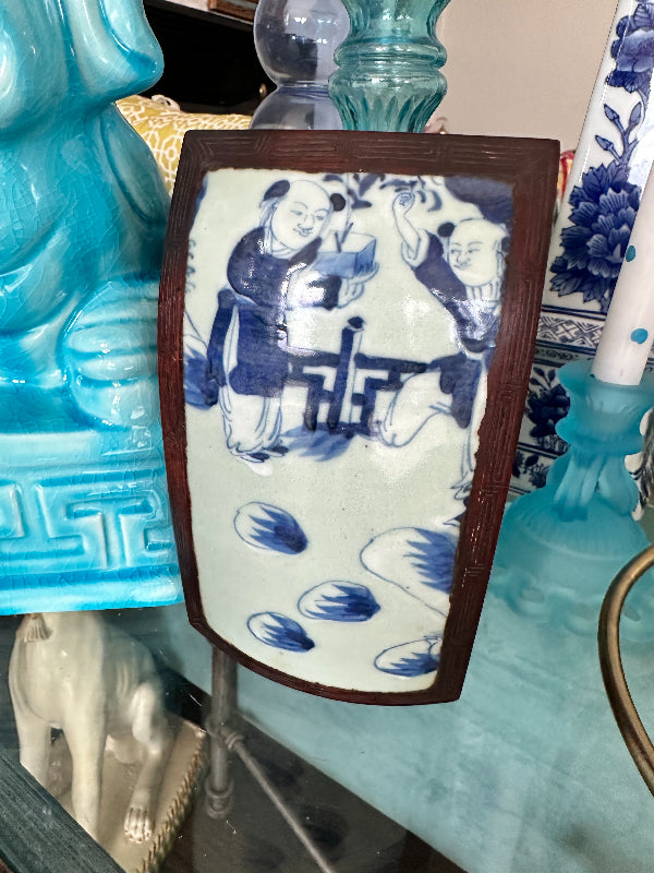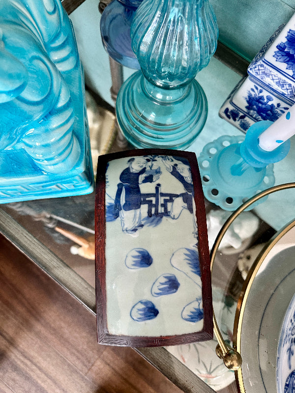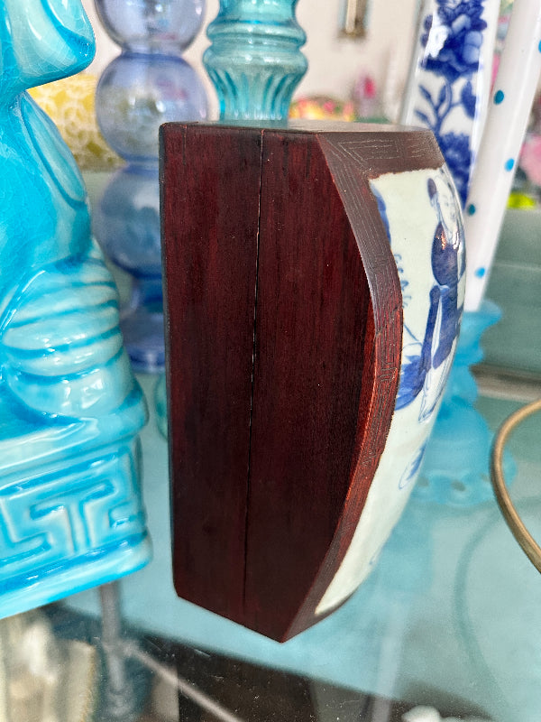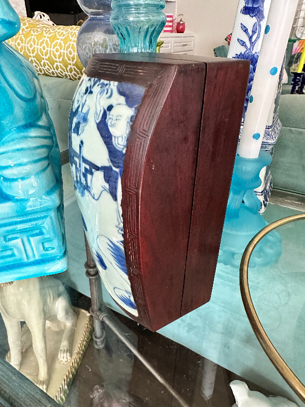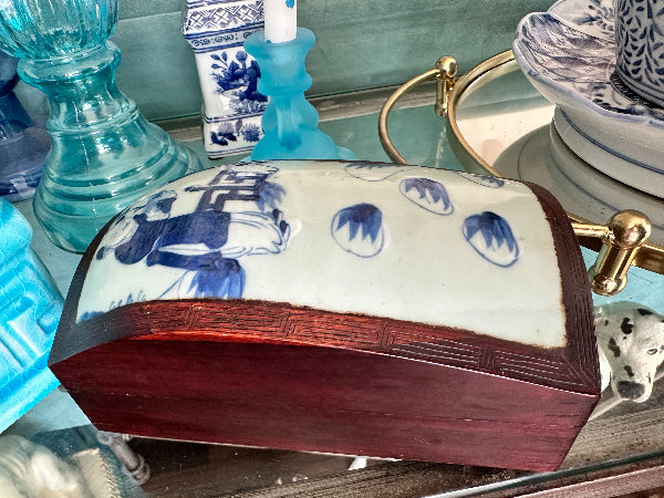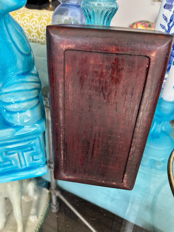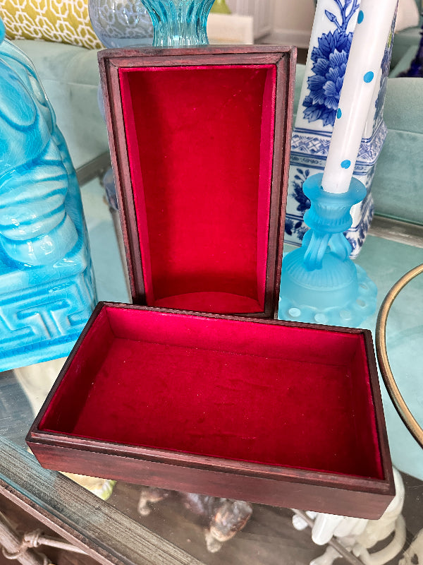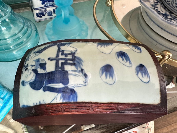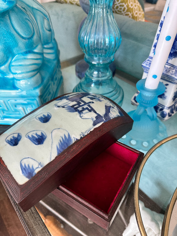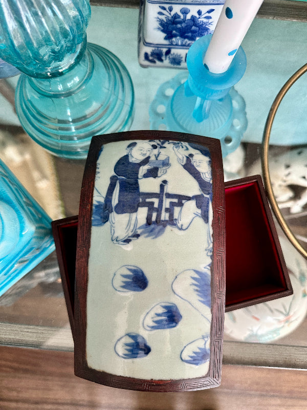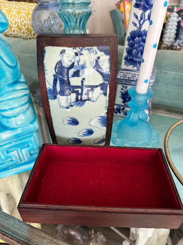 Chard boxes are highly collected because they come in all shapes, colors and sizes. This beautiful box shows it's age in the gorgeous antique wood. The red velvet lining makes it a perfect place to store your jewelry or other valuables. This is a nice, generous sized box with a blue and white chard. The chard depicts 2 Asian men in a garden. Pristine condition and ready to use or display.