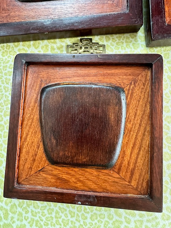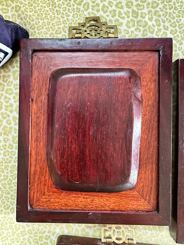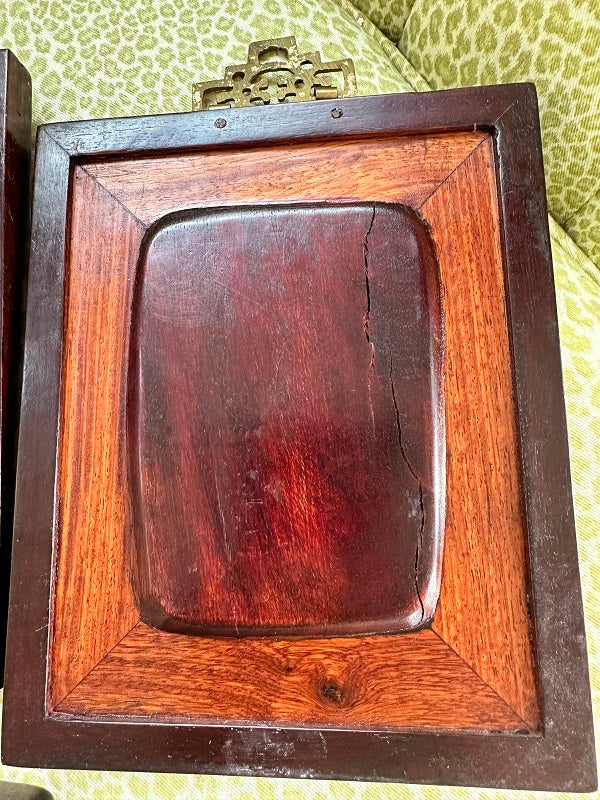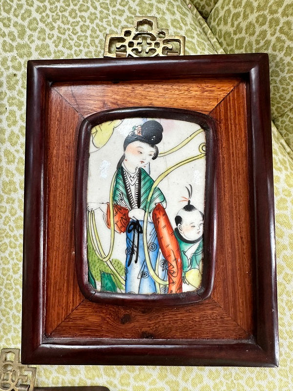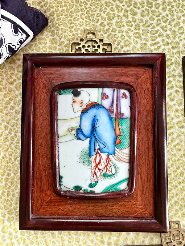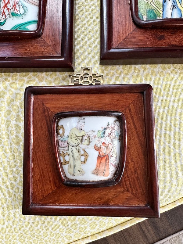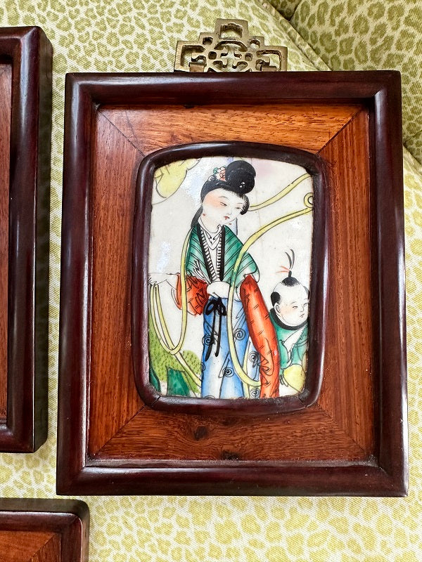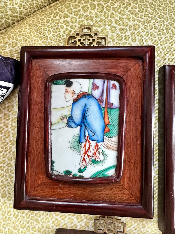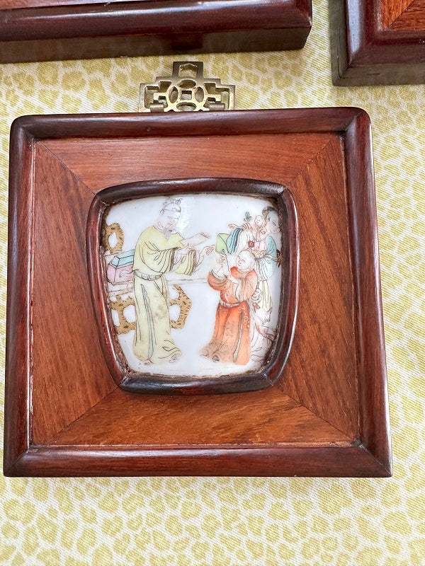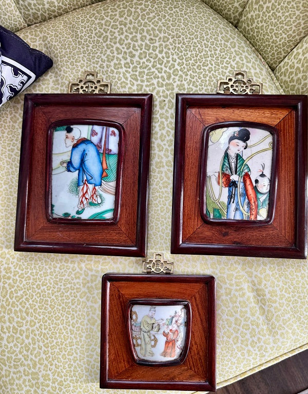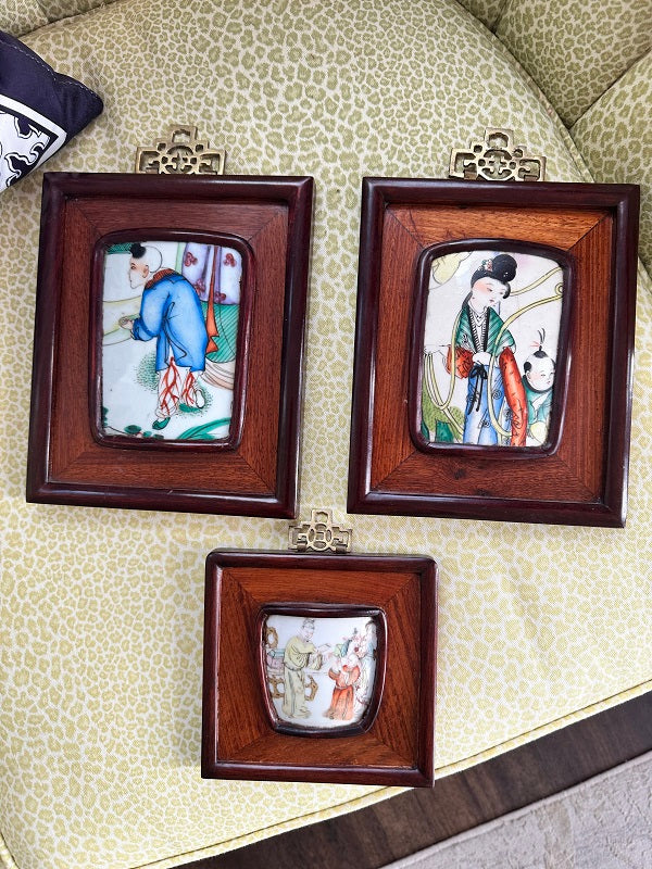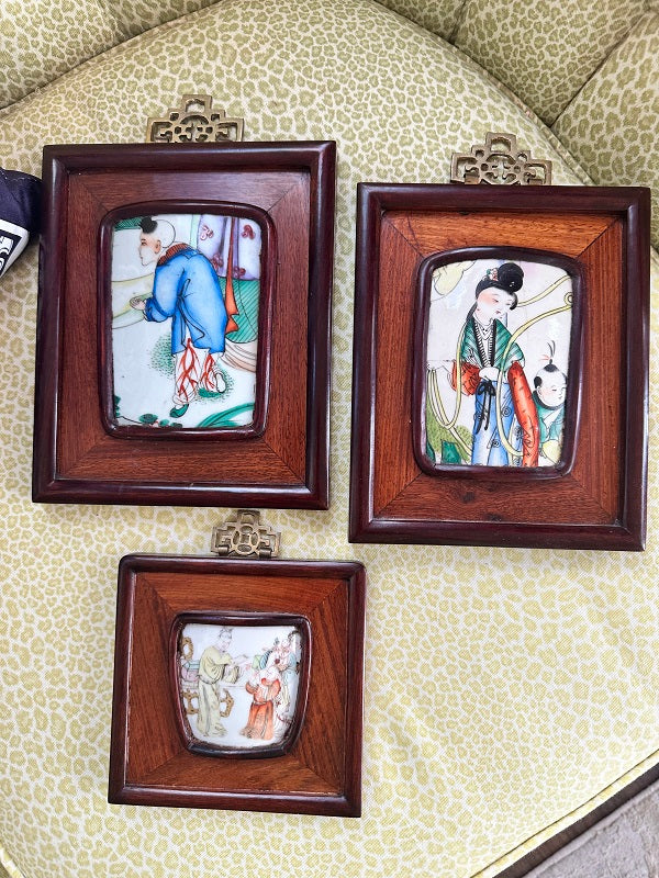 Vintage and Antique Chards are highly collectible because of their beautiful Asian scenes, colors and rarity. This set is a great way to add to a collection or start one of your own. Each chard is encased in a rich wooden frame. Each has an intricate hinged brass piece for easy hanging. This set is a great addition to a gallery wall. There is a hairline crack on one of the chards, typical with age. Otherwise, great vintage/antique condition.