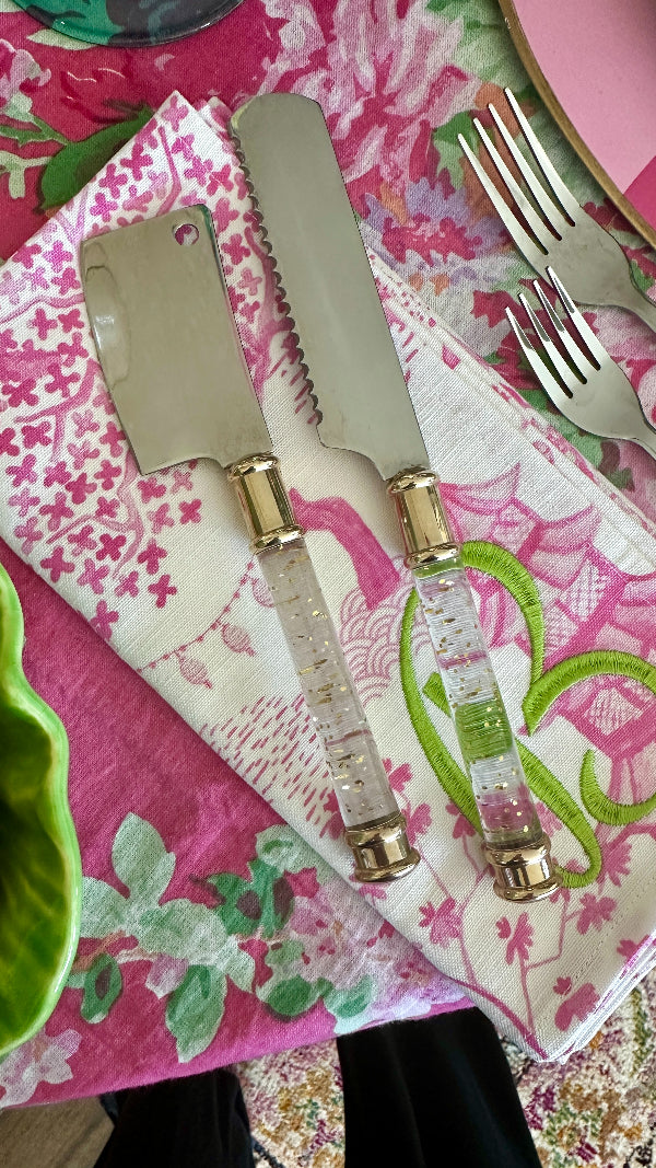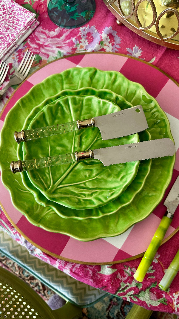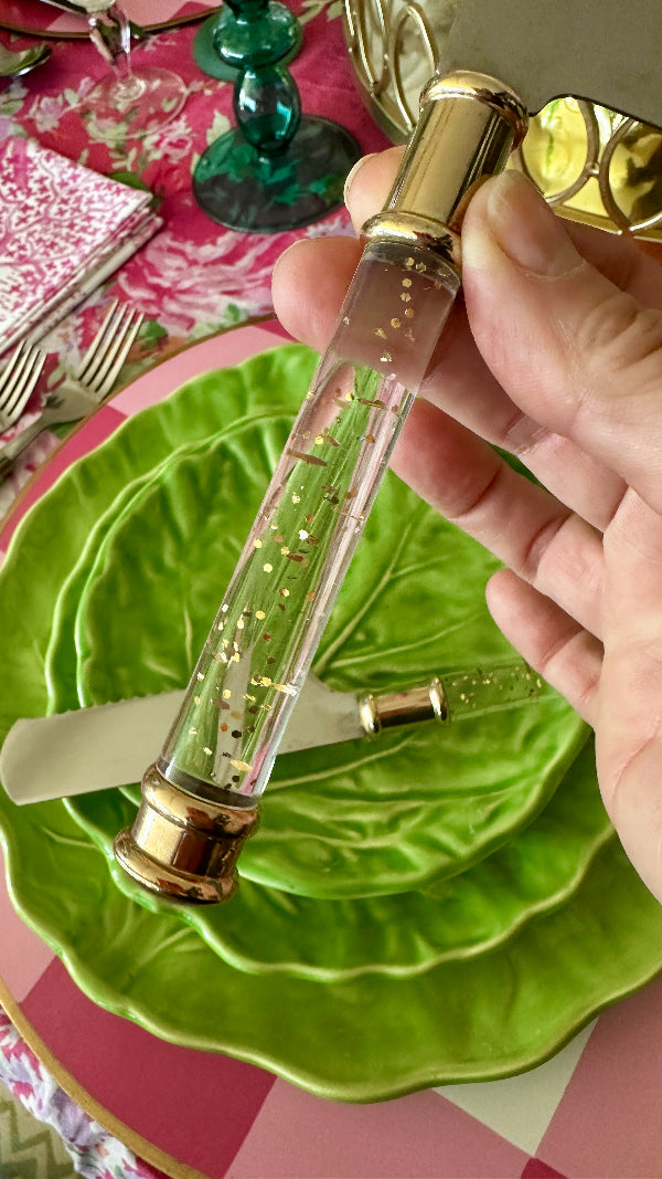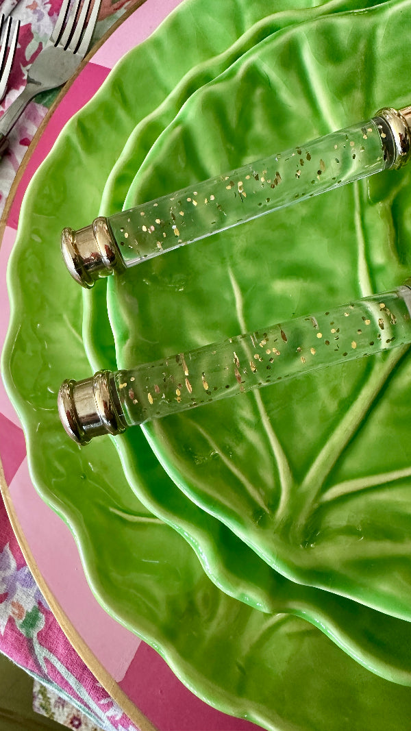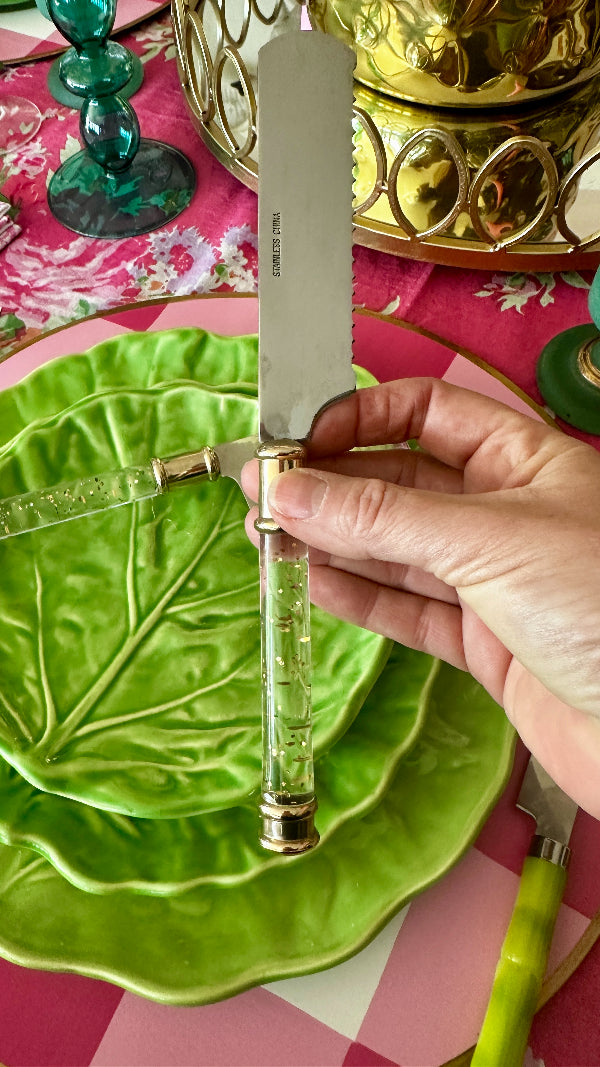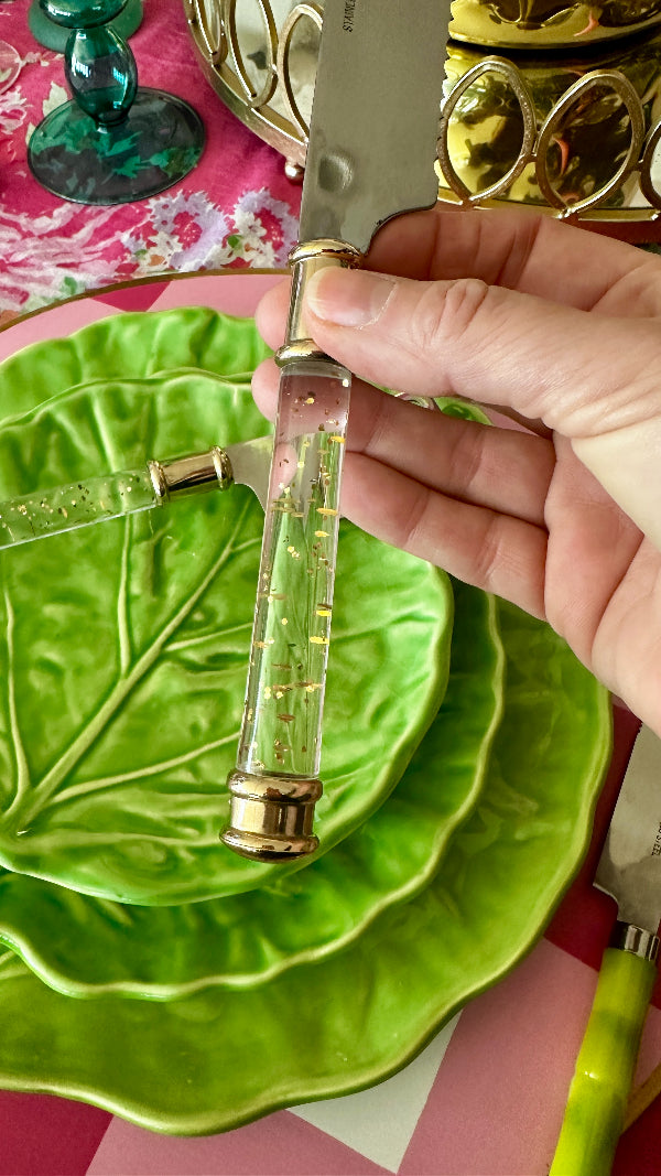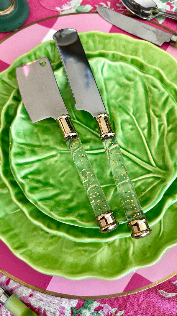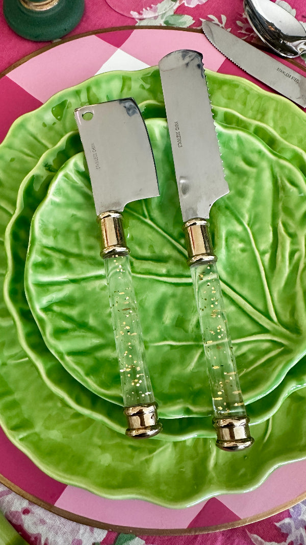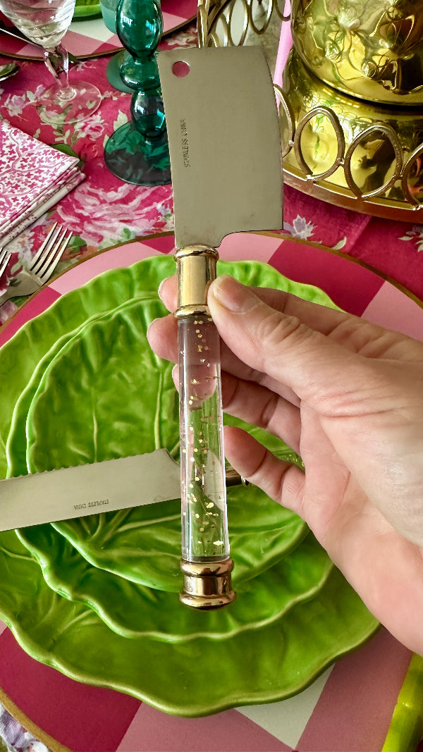 Vintage Cheese Knives, where exquisite craftsmanship meets timeless charm. Each knife features a luxurious lucite handle adorned with delicate gold flecks, exuding elegance and sophistication. With two unique designs available, elevate your dining experience with these exquisite pieces. Please note, each knife is sold separately, allowing you to curate your own set of culinary treasures. Discover the perfect accompaniment to your cheese platter today.