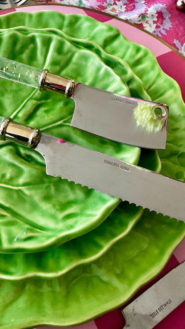 cerated knife 9" long, Slicing knife 7 1/4" longVintage Cheese Knives, Lucite handles with gold flecks, 2 available, EACH SOLD SEPARATELY