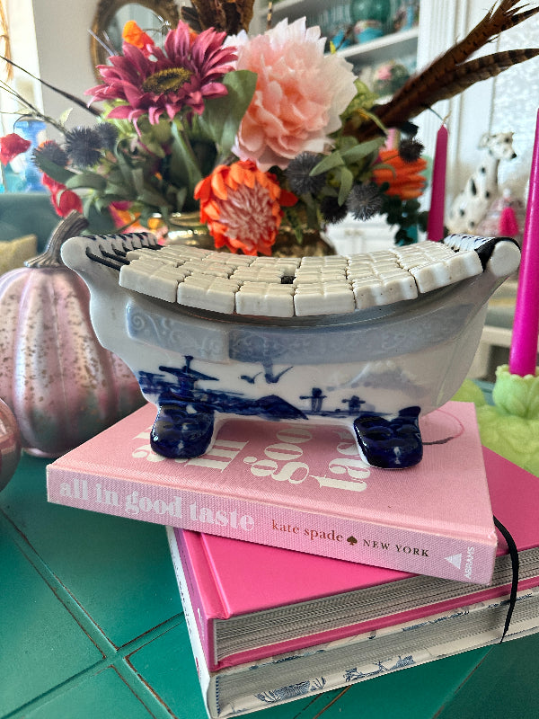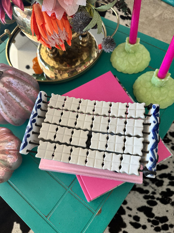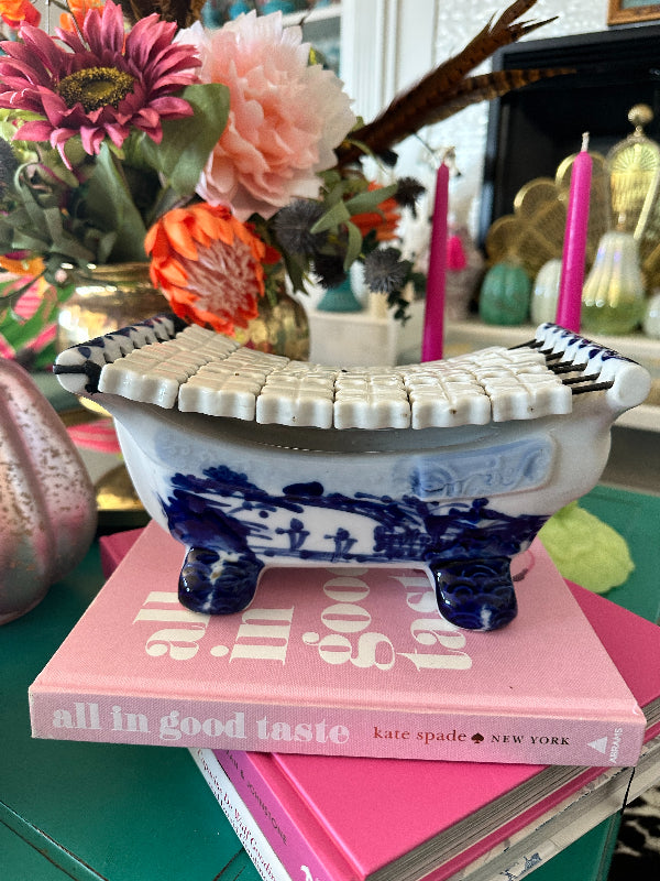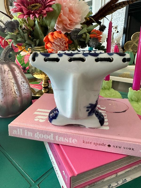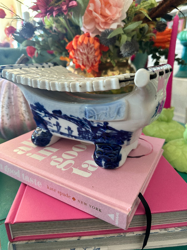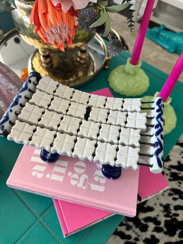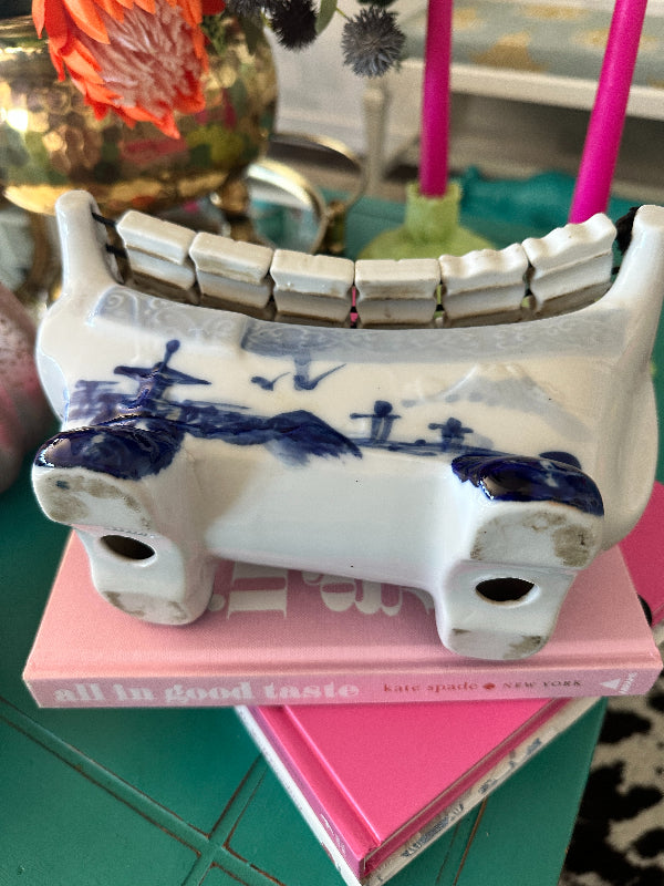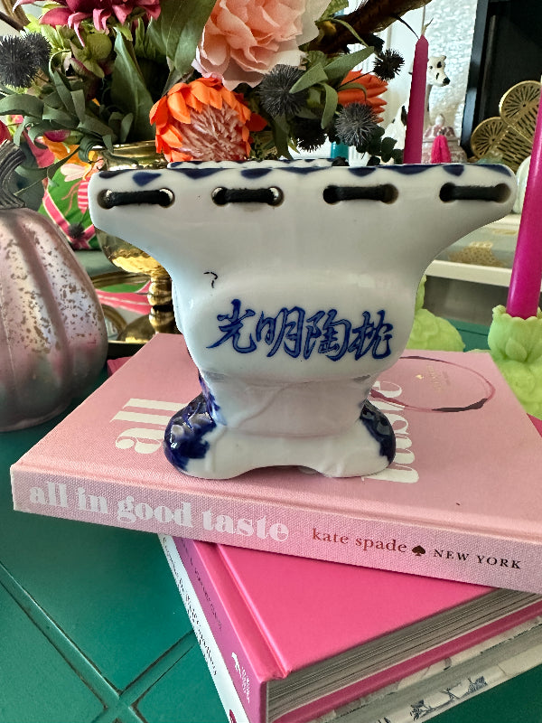 Chinese opium pillows are really fun pieces to collect. This one is extra special because it has ceramic pieces that are strung together on top. See picture details as they are part of the description. Dark blue design on a white background. These were actually used as head rests after smoking opium to enjoy the "high" feeling. Now they are highly collectible. Great vintage condition.