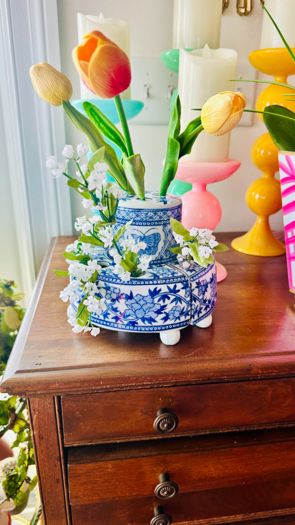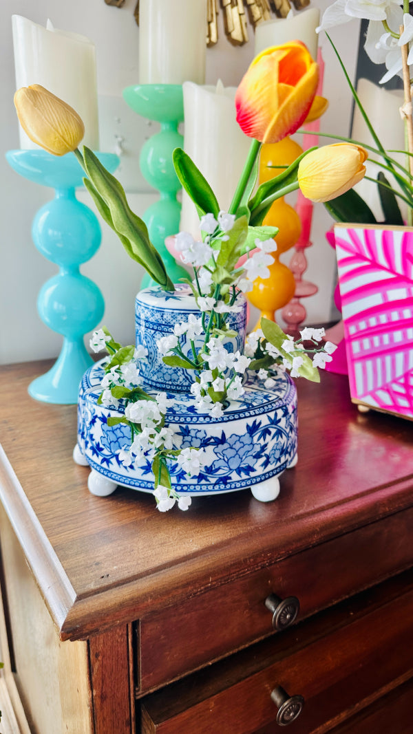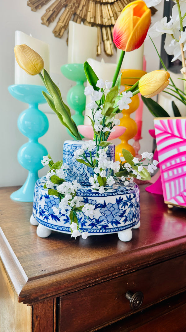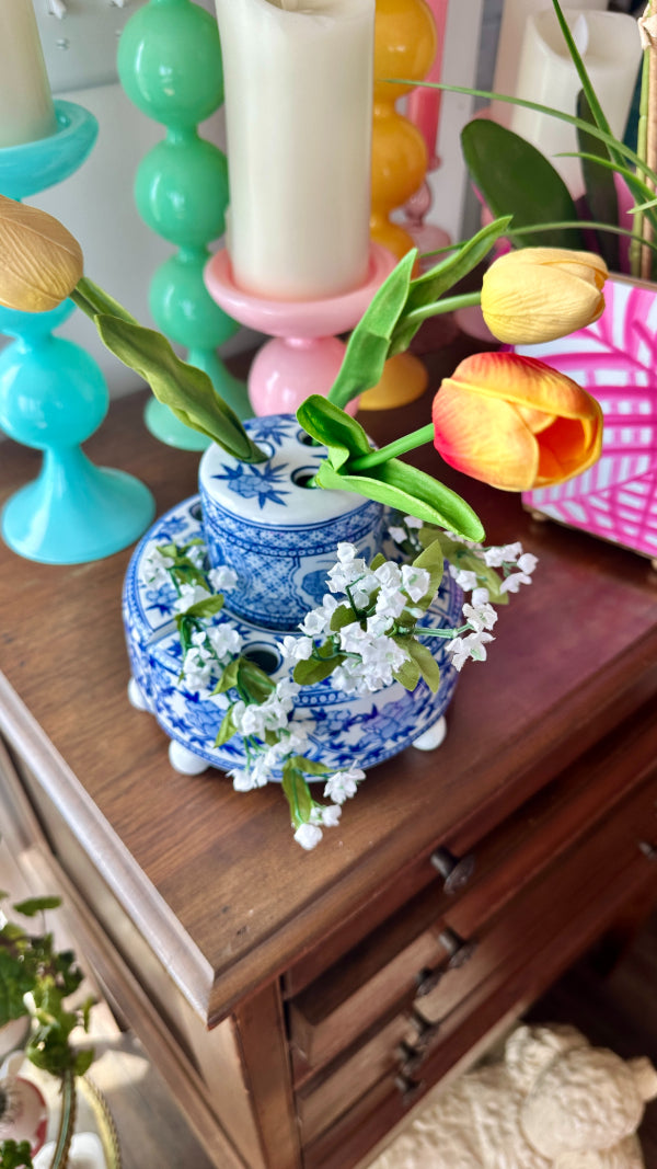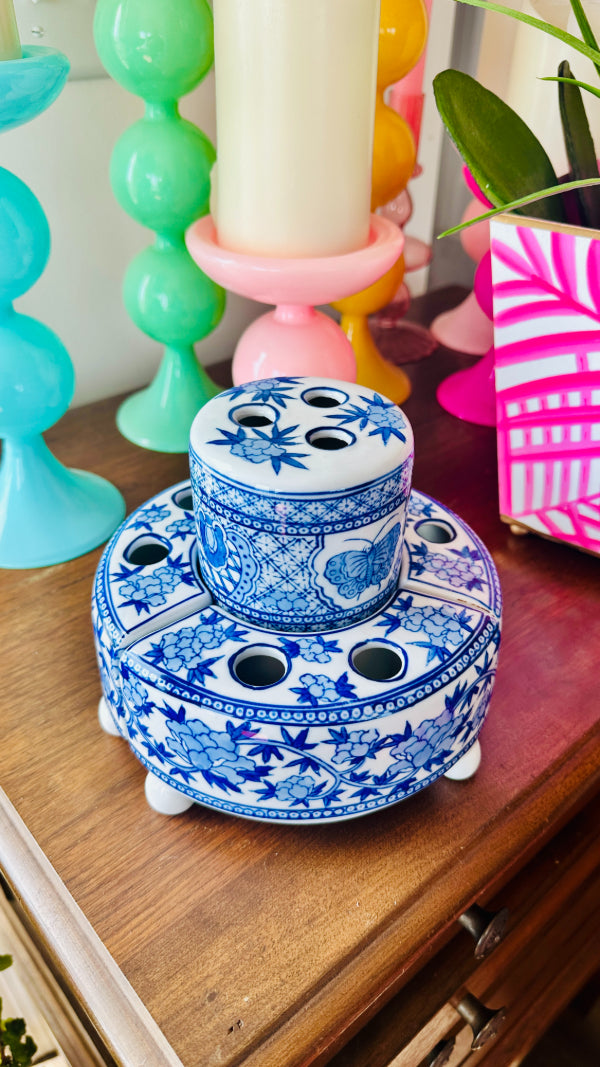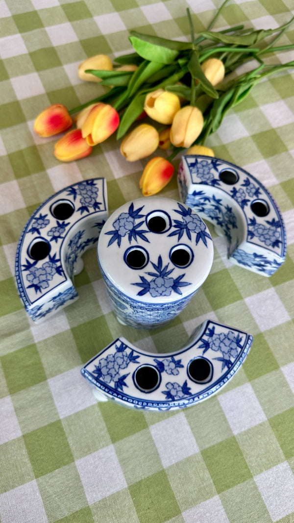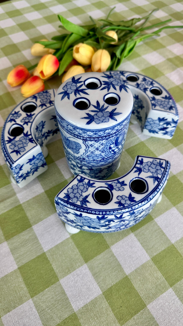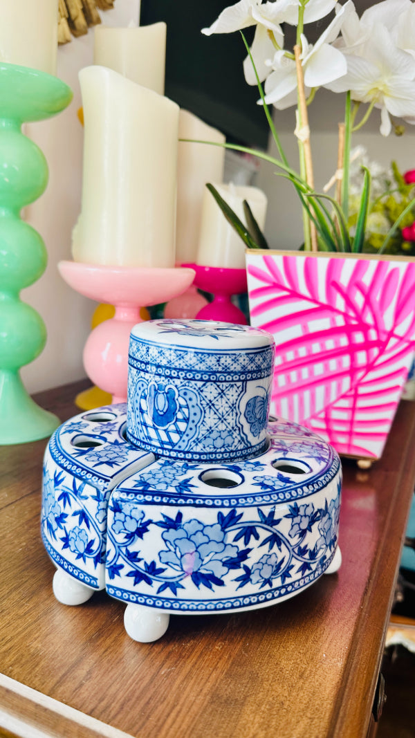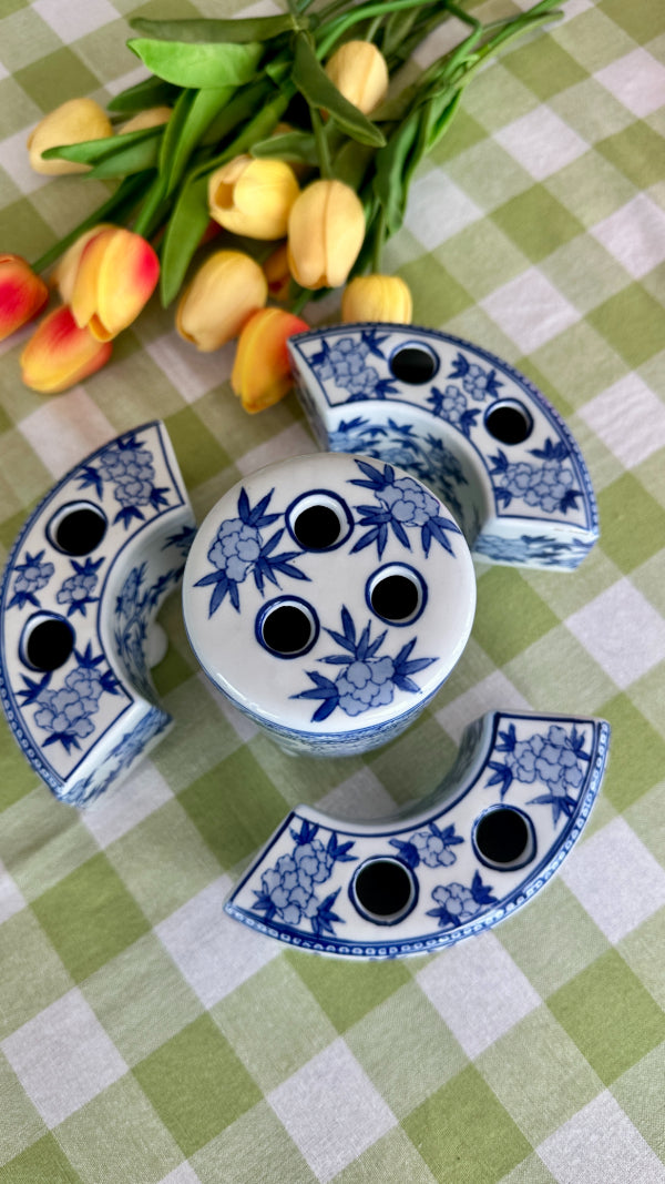 Elevate your floral arrangements with this elegant Vintage Chinoiserie Flower Frog Vase Set by Andrea by Sadek. This rare 4-piece set features delicate chinoiserie designs, blending classic Eastern-inspired artistry with timeless blue-and-white porcelain charm. The flower frog allows for precise flower placement, making it both beautiful and functional. A perfect addition for collectors, chinoiserie enthusiasts, or those looking to add a refined vintage accent to their home décor.