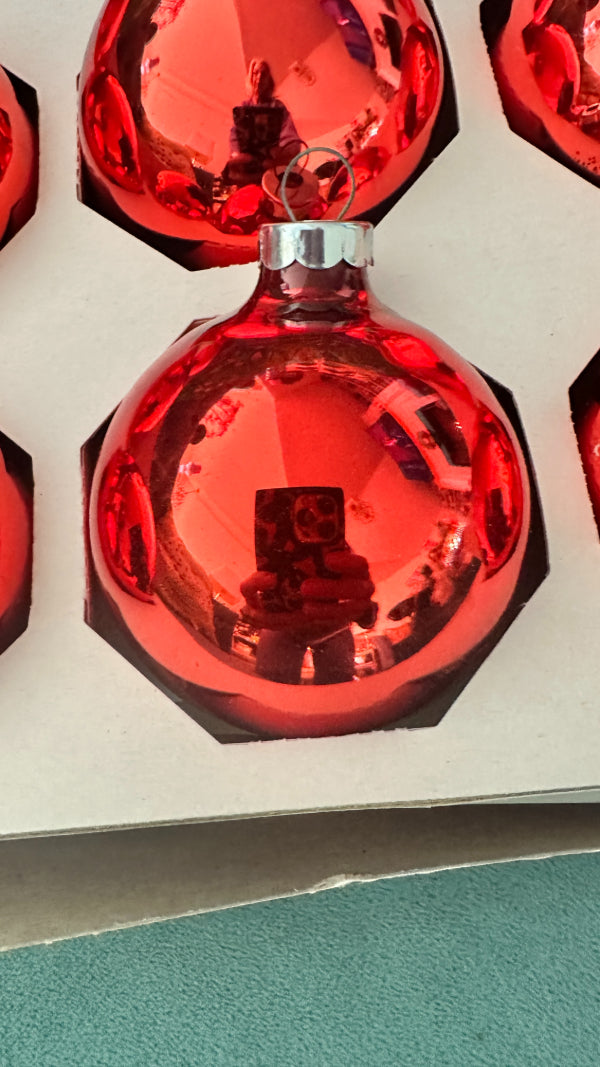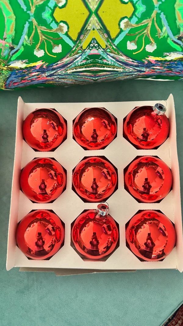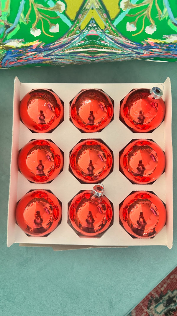 Add a touch of old-world holiday charm to your tree with this set of nine vintage red glass Christmas ball ornaments. Featuring rich ruby tones and a classic spherical silhouette, these ornaments capture the timeless beauty of traditional Christmas décor. Their glossy glass finish reflects twinkling lights beautifully, making them perfect for both vintage-inspired and classic holiday displays. Whether styled on a Christmas tree, wreath, or displayed in a decorative bowl, these ornaments bring warmth, nostalgia, and festive elegance to your seasonal décor.