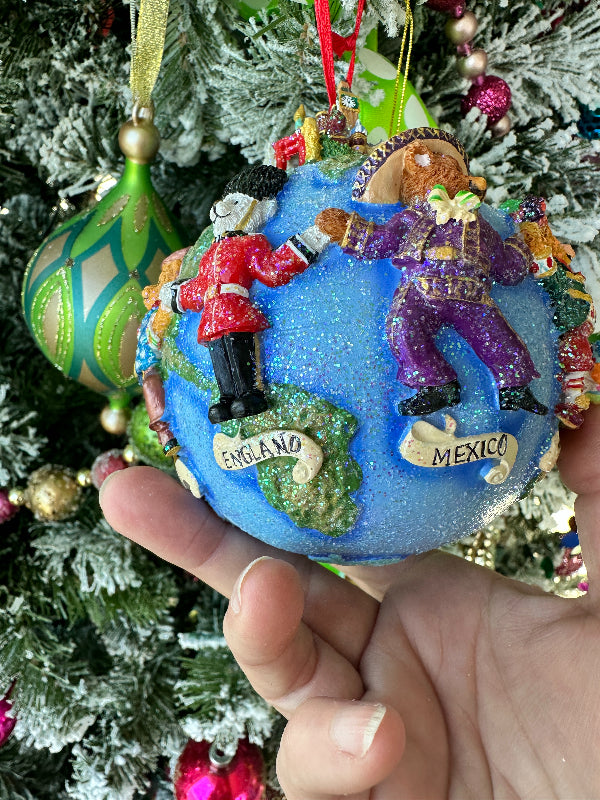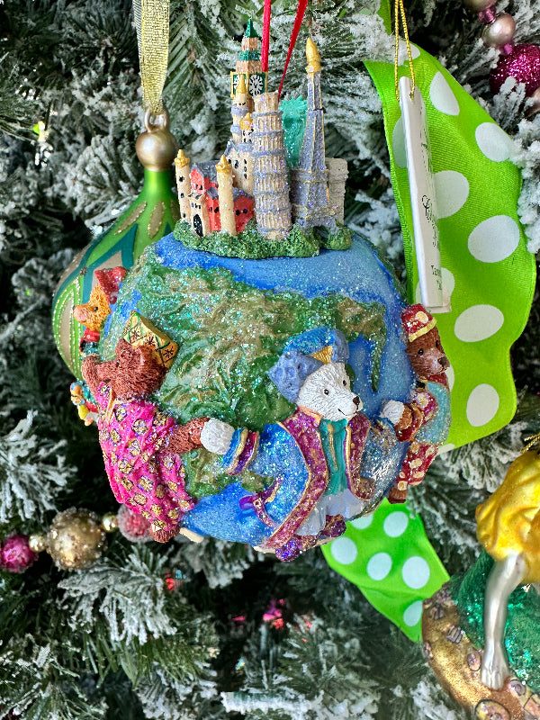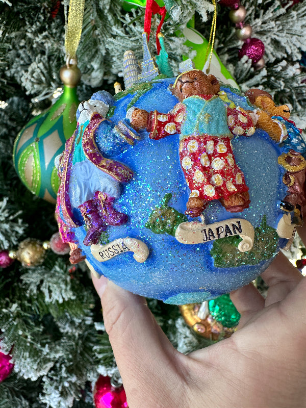Adorn your tree with the whimsy of teddy bears with this Vintage Christopher Radko - "Teddies Around the World" ornament. Preserved in its original box and crafted with meticulous detail, this ornament is a delightful testament to Christopher Radko's timeless artistry. There are countries represented with each bear dressed in traditional garb including Italy, England, Mexico, Russia and Japan. This ornament would make a wonderful gift for the traveler in your life.