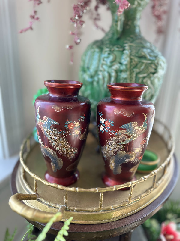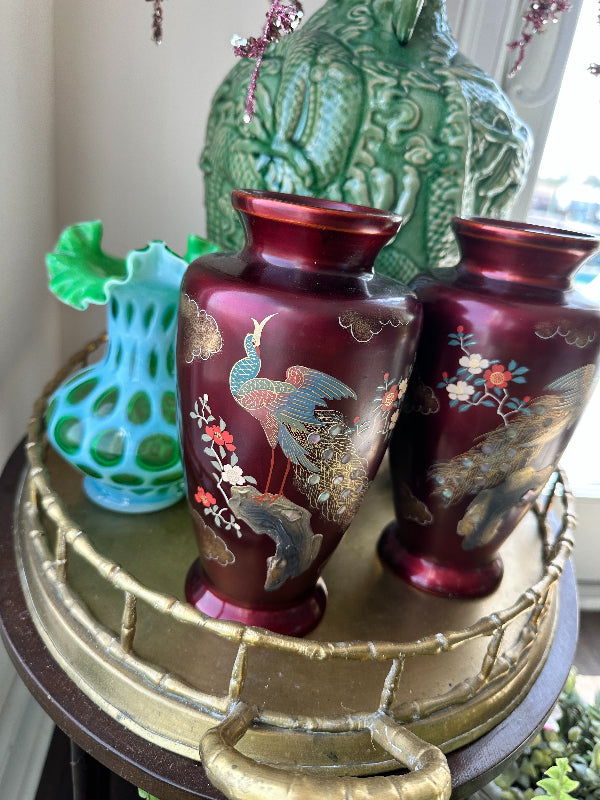 Vintage Cloisonne' Vase, Maroon, Peacock and Floral Hand painted, Mother of Pearl Inlay, Copper Insert 2 Available, EACH SOLD SEPARATELY