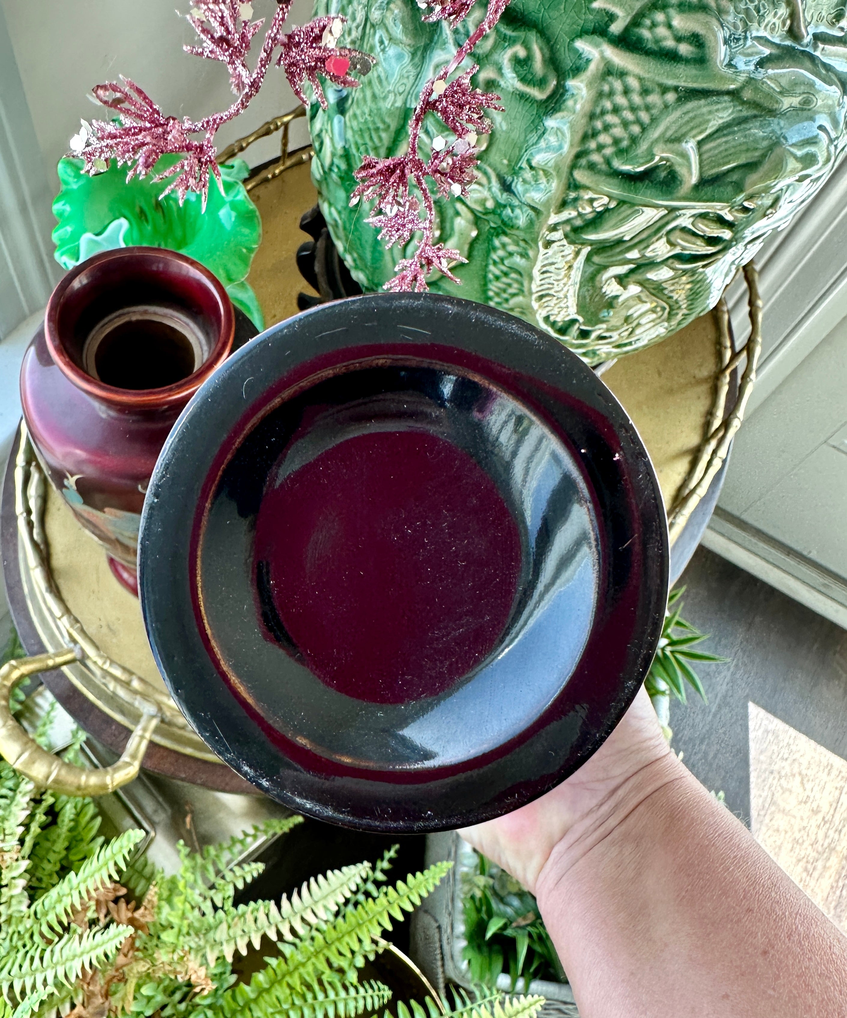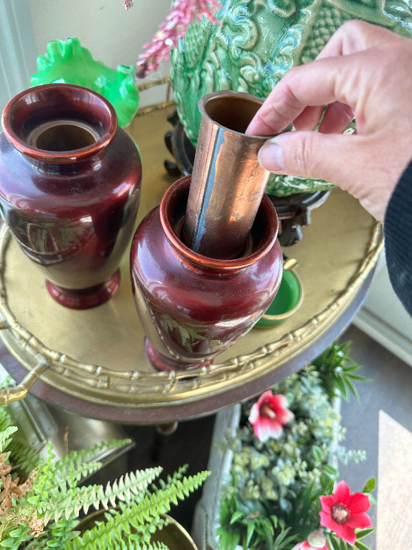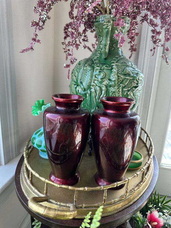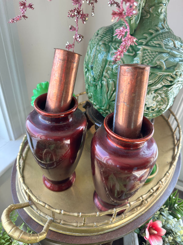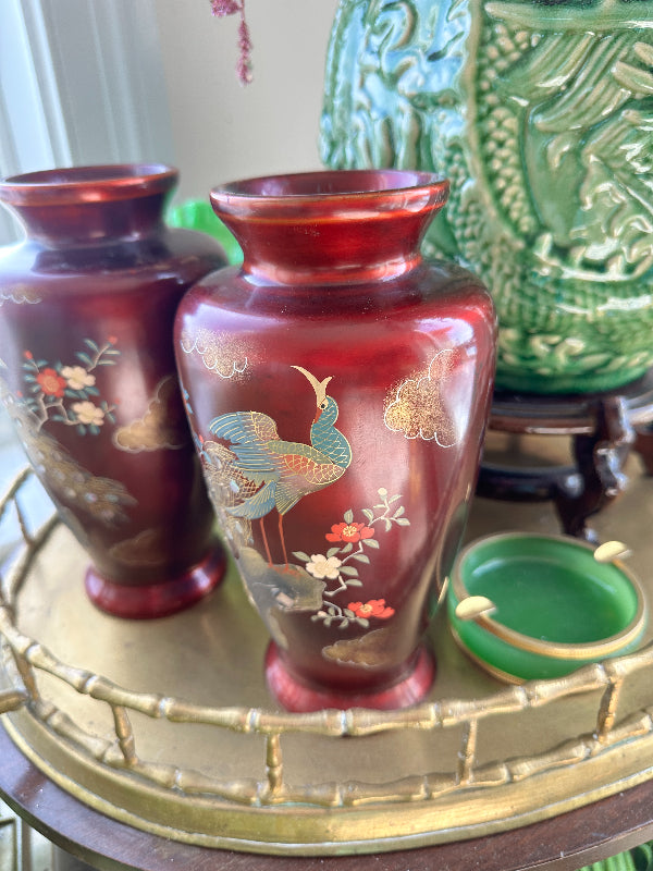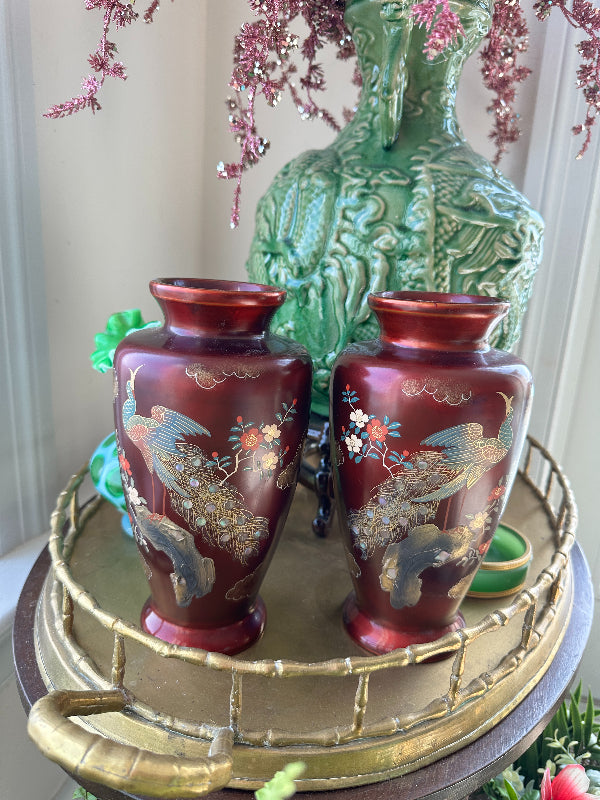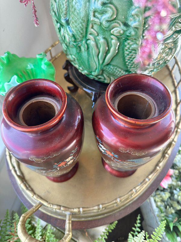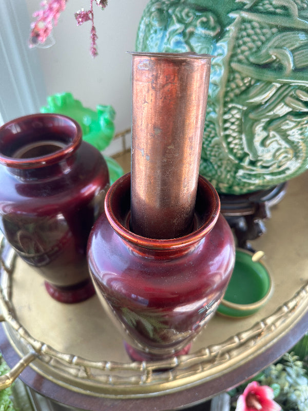 Gorgeous dark red/maroon enamel vases with cloisonne' detailed bird and floral design. A great size for a tablescape or shelf display. Each vase has a copper insert to keep flowers tightly bundled and to protect the interior of the vase. Perfect for that touch of chinoiserie decor.