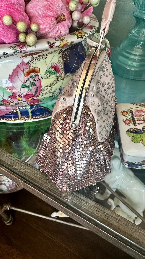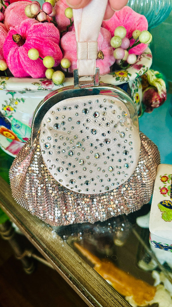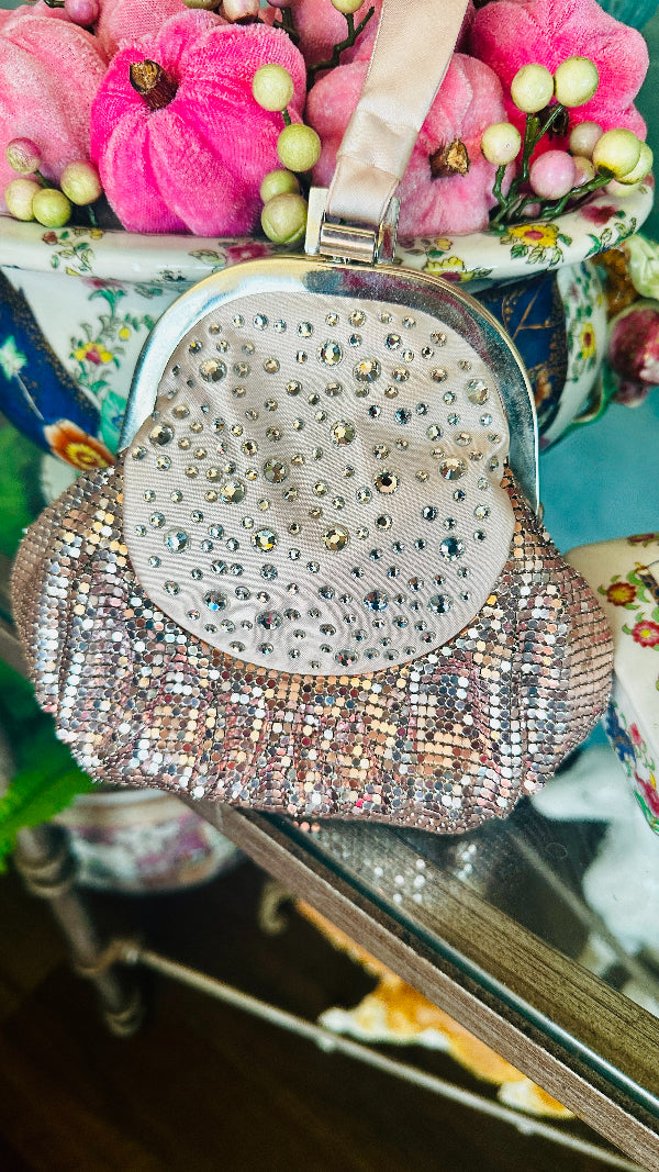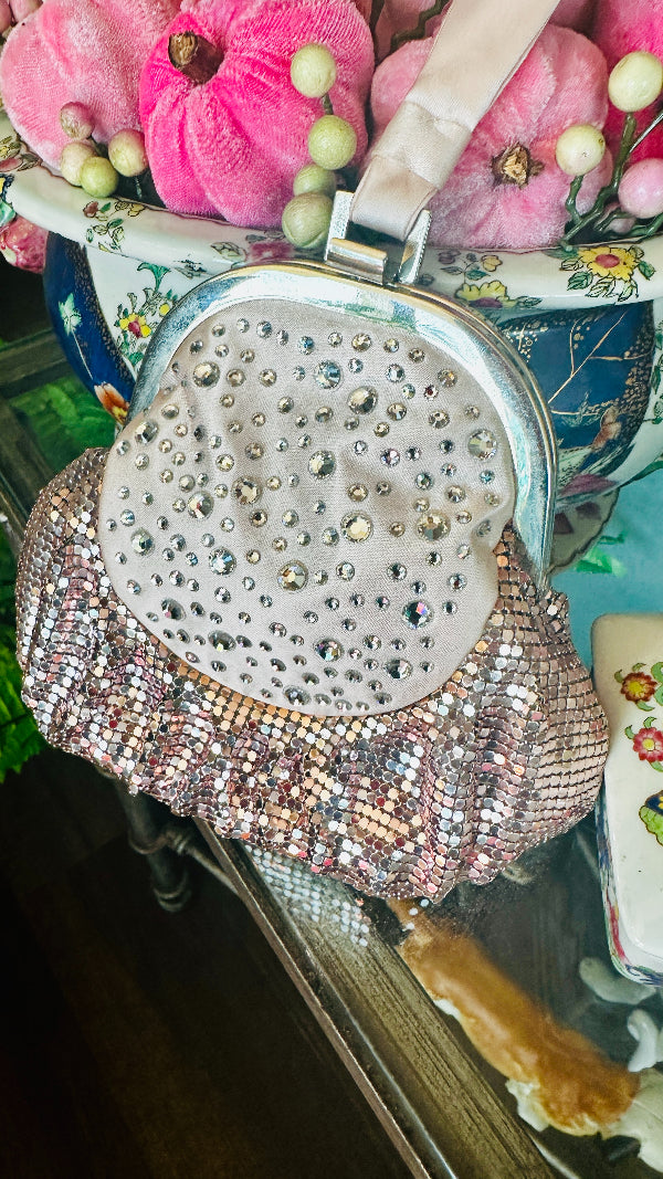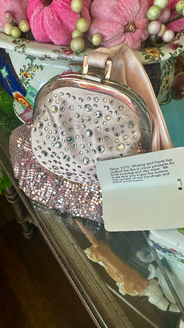 This vintage Whiting and Davis clutch purse is a glamorous accessory adorned with sparkling pink rhinestones and pink metal squares. Its sophisticated design is perfect for adding a touch of elegance to any outfit. A must-have for collectors and lovers of vintage fashion!