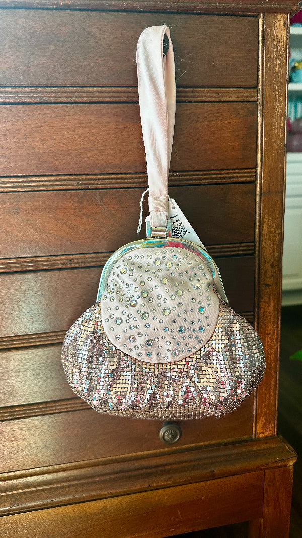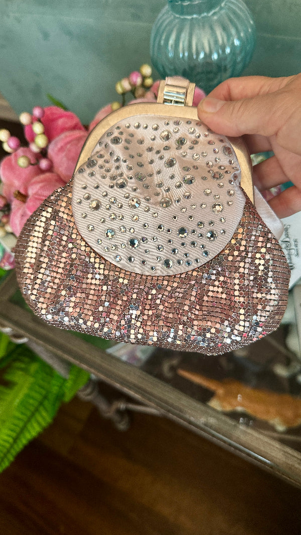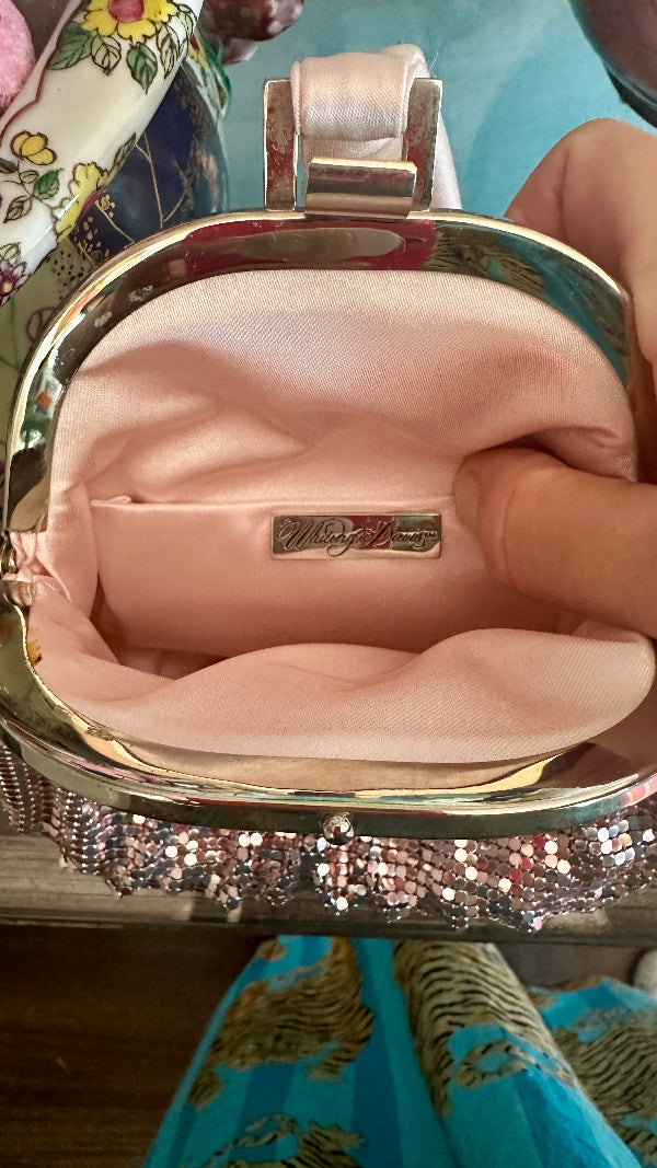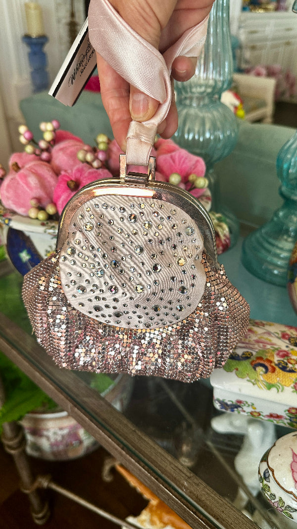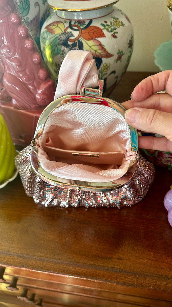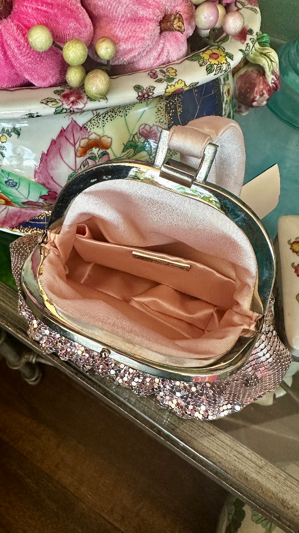 This vintage Whiting and Davis clutch purse is a glamorous accessory adorned with sparkling pink rhinestones and pink metal squares. Its sophisticated design is perfect for adding a touch of elegance to any outfit. A must-have for collectors and lovers of vintage fashion!