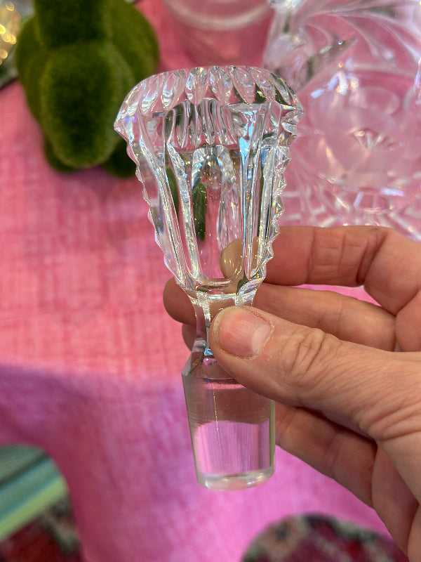 Vintage crystal decanter with intricate cut frosted glass and a mesmerizing lead crystal floral design. Crafted with exquisite detail and timeless elegance, this decanter is more than a mere vessel—it's a statement of sophistication and refinement. Perfect for adding a touch of vintage charm to your home bar or as a cherished collector's piece. Elevate your entertaining experience and showcase your discerning taste with this stunning vintage crystal decanter.