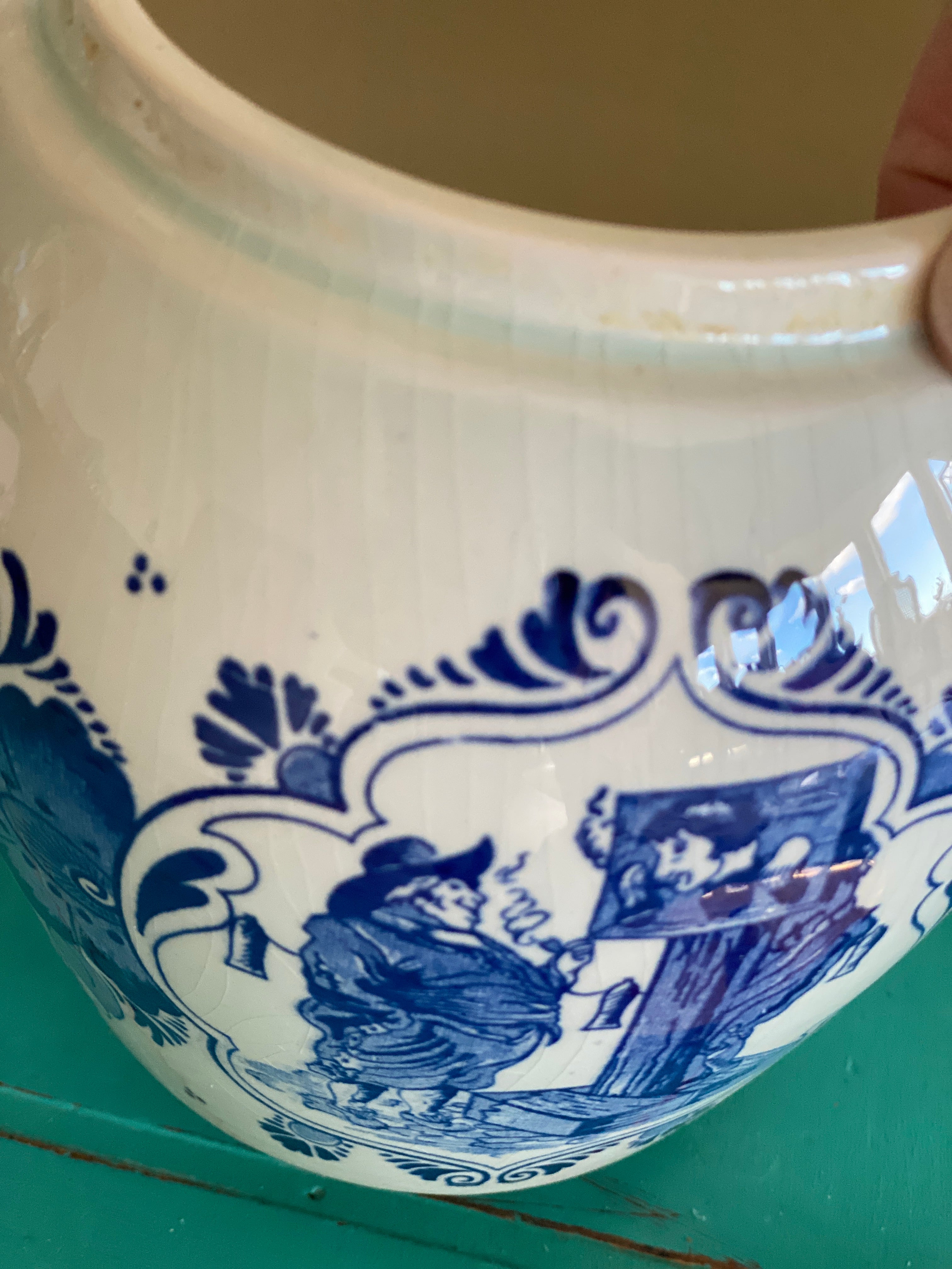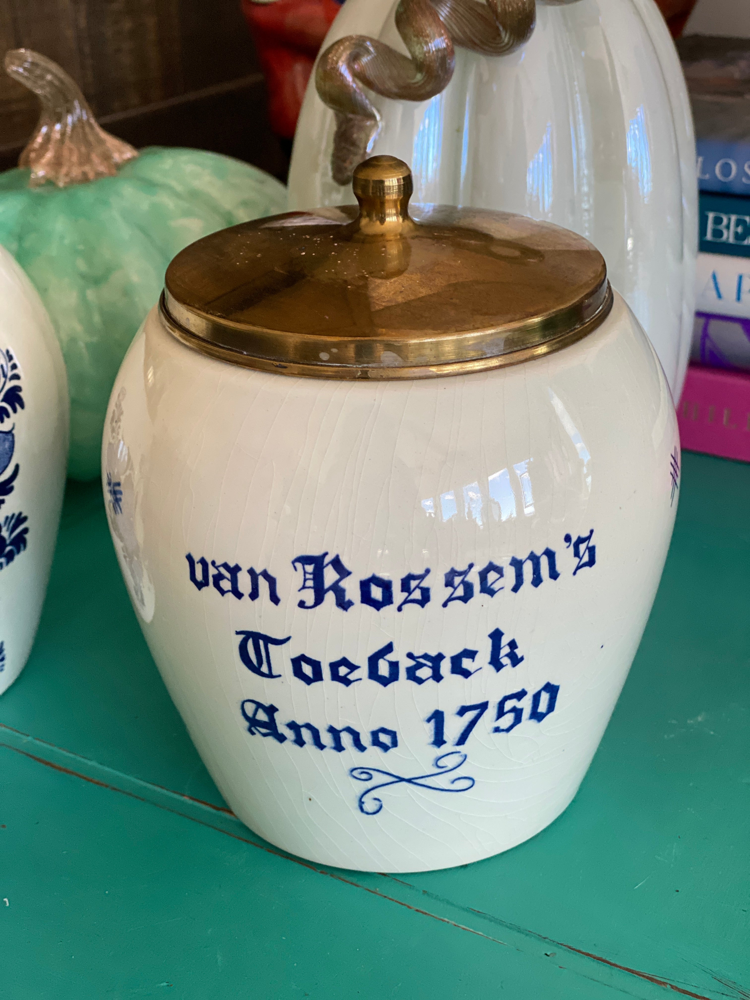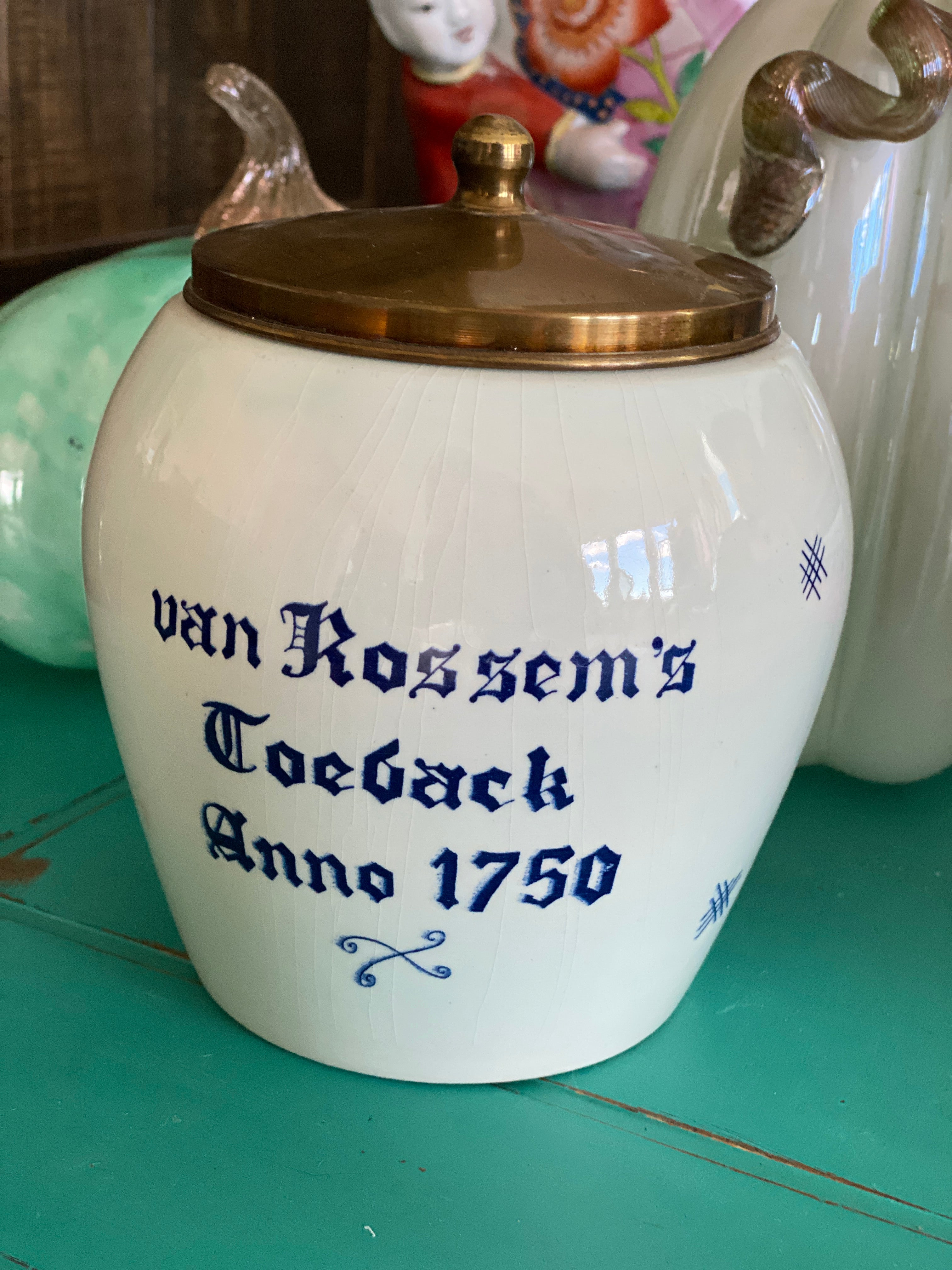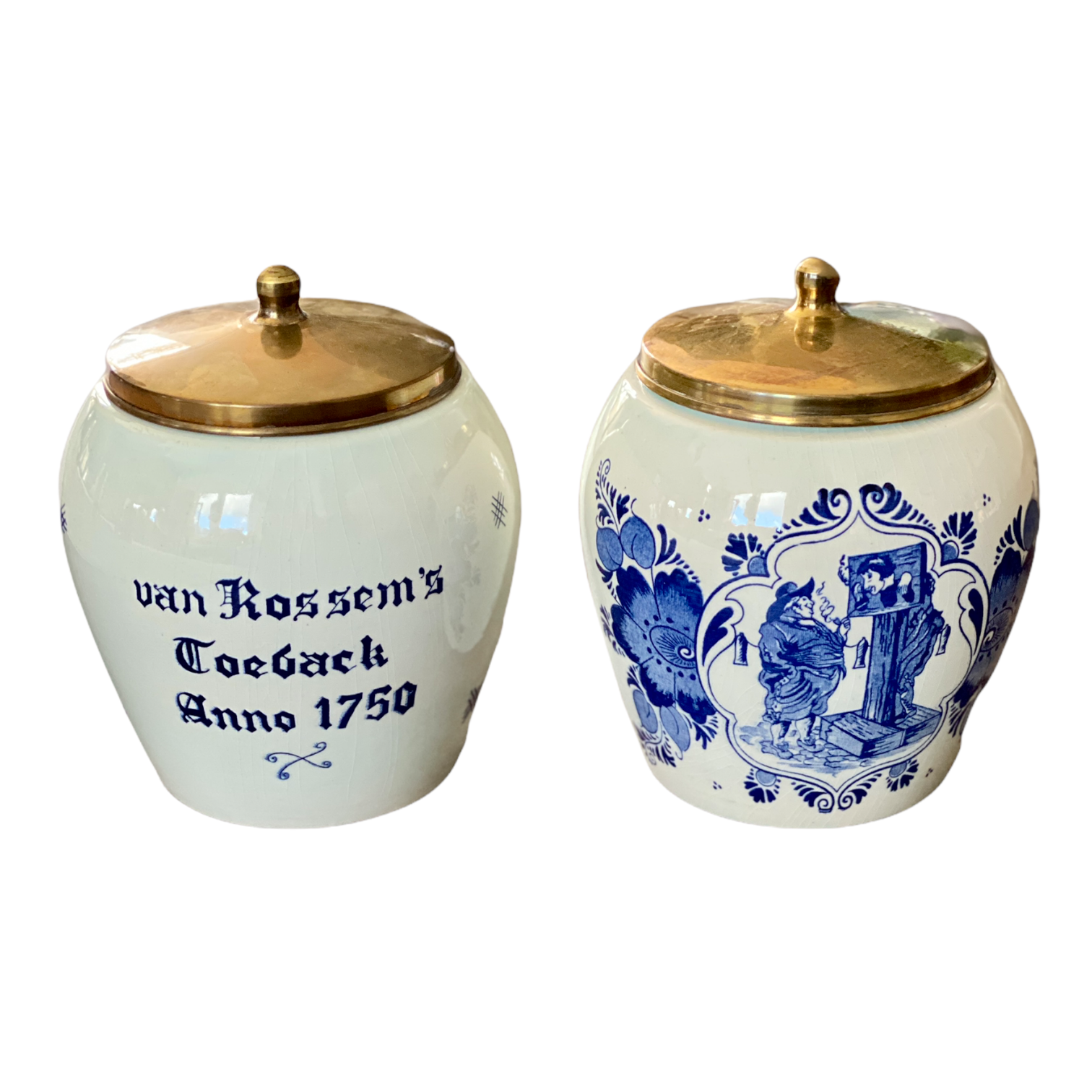 Rare, vintage Delft tobacco jars or humidors Made in Holland in the 1970s. Blue and white whimsical cartoon illustration on one side and Van Rossems Toeback Anno 1750 on the other side. Hand painted detail. Brass lids with sponges attached to the underside of the lid used to soak and create the perfect humidity for the tobacco to remain fresh. Very slight crazing, hand painted “Delft” signature on the bottom. (PRICE IS FOR ONE JAR, 2 available) See pictures as they are part of the description.