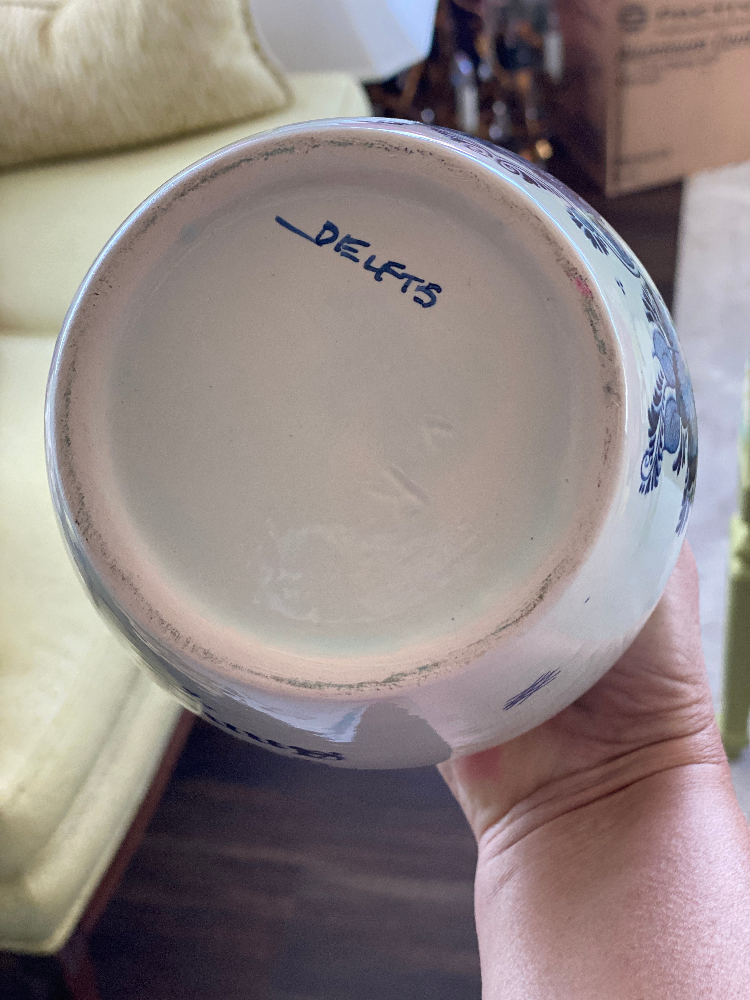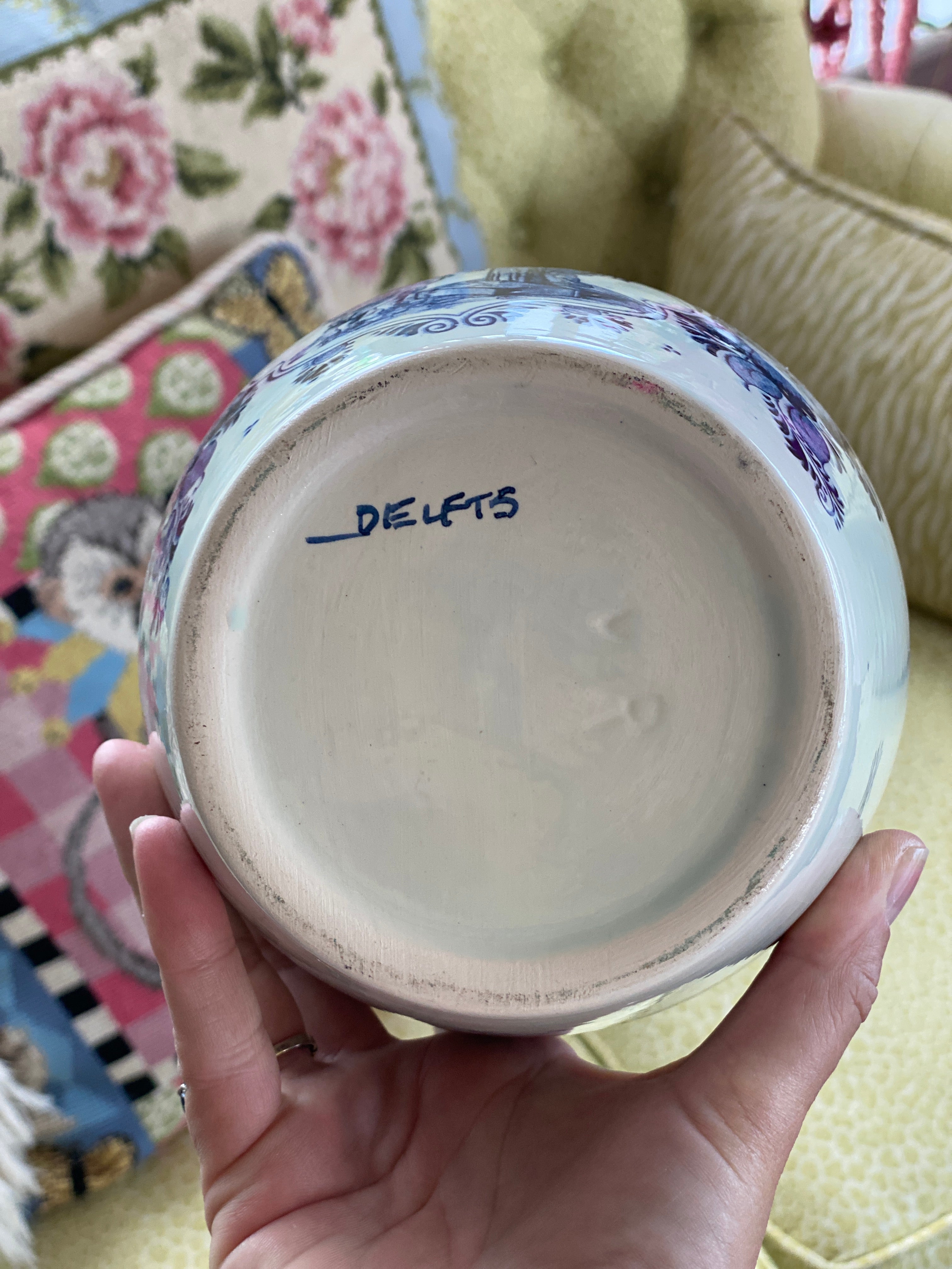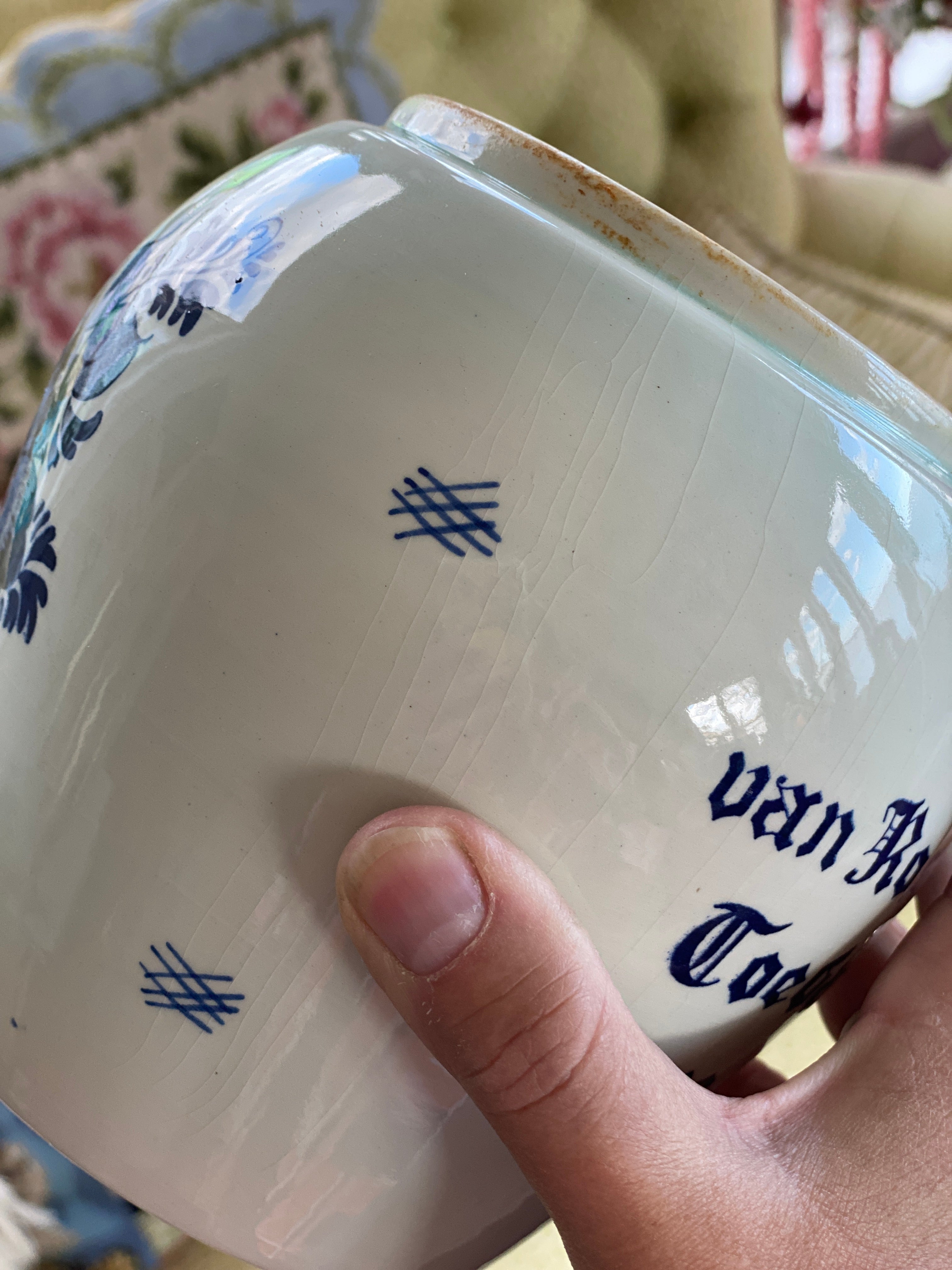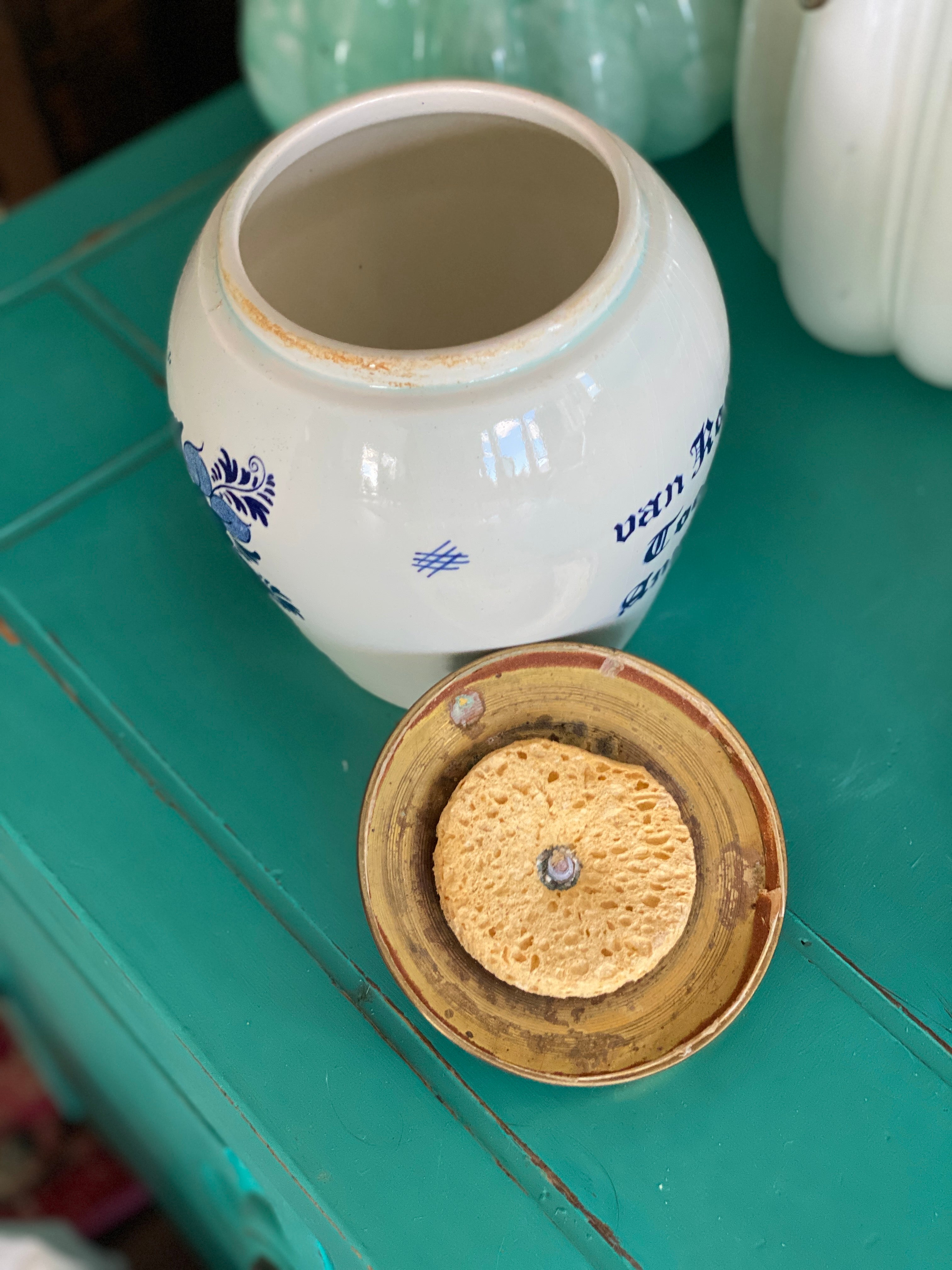 Rare, vintage Delft tobacco jars or humidors Made in Holland in the 1970s. Blue and white whimsical cartoon illustration on one side and Van Rossems Toeback Anno 1750 on the other side. Hand painted detail. Brass lids with sponges attached to the underside of the lid used to soak and create the perfect humidity for the tobacco to remain fresh. Very slight crazing, hand painted “Delft” signature on the bottom. (PRICE IS FOR ONE JAR, 2 available) See pictures as they are part of the description.