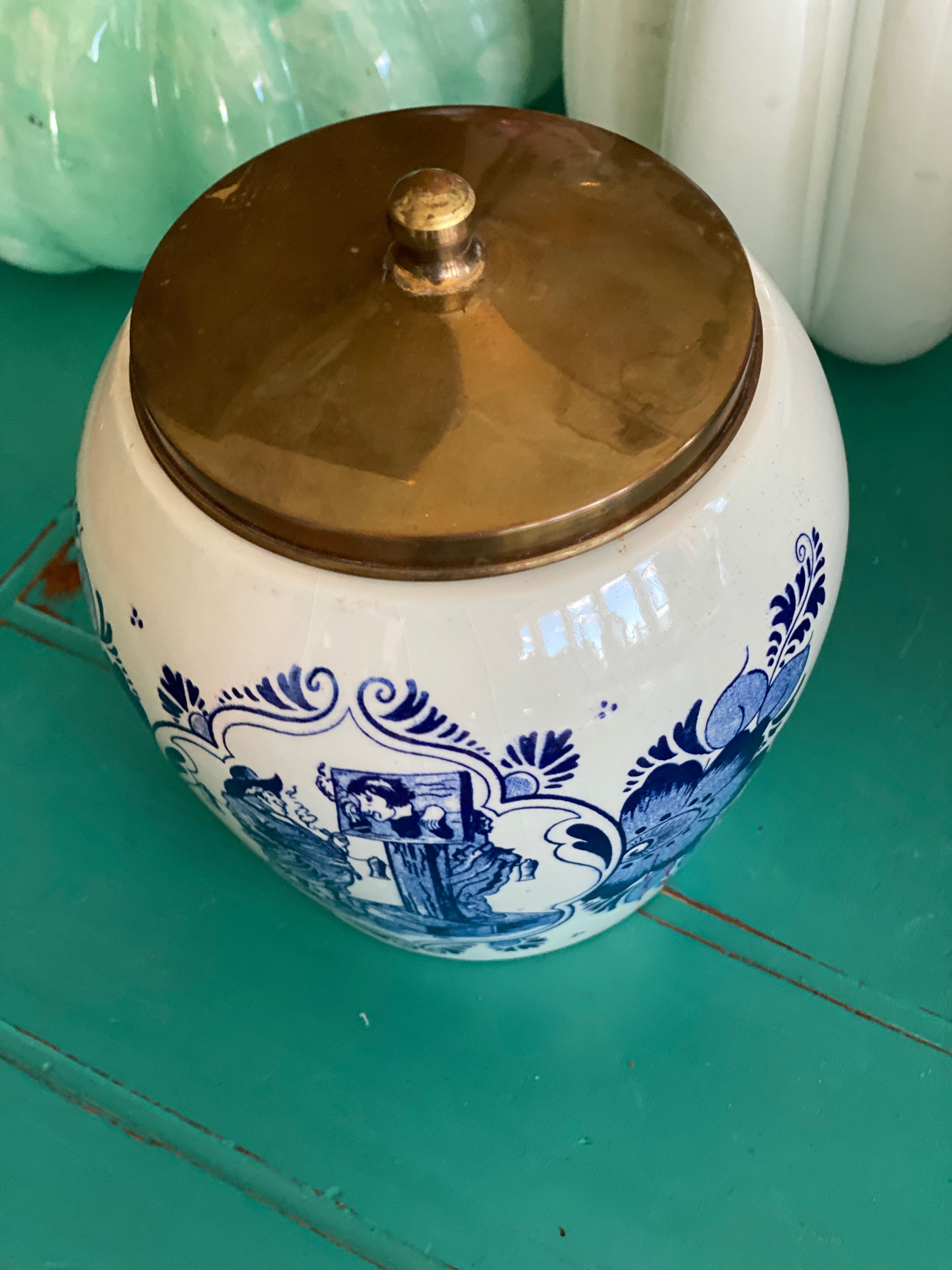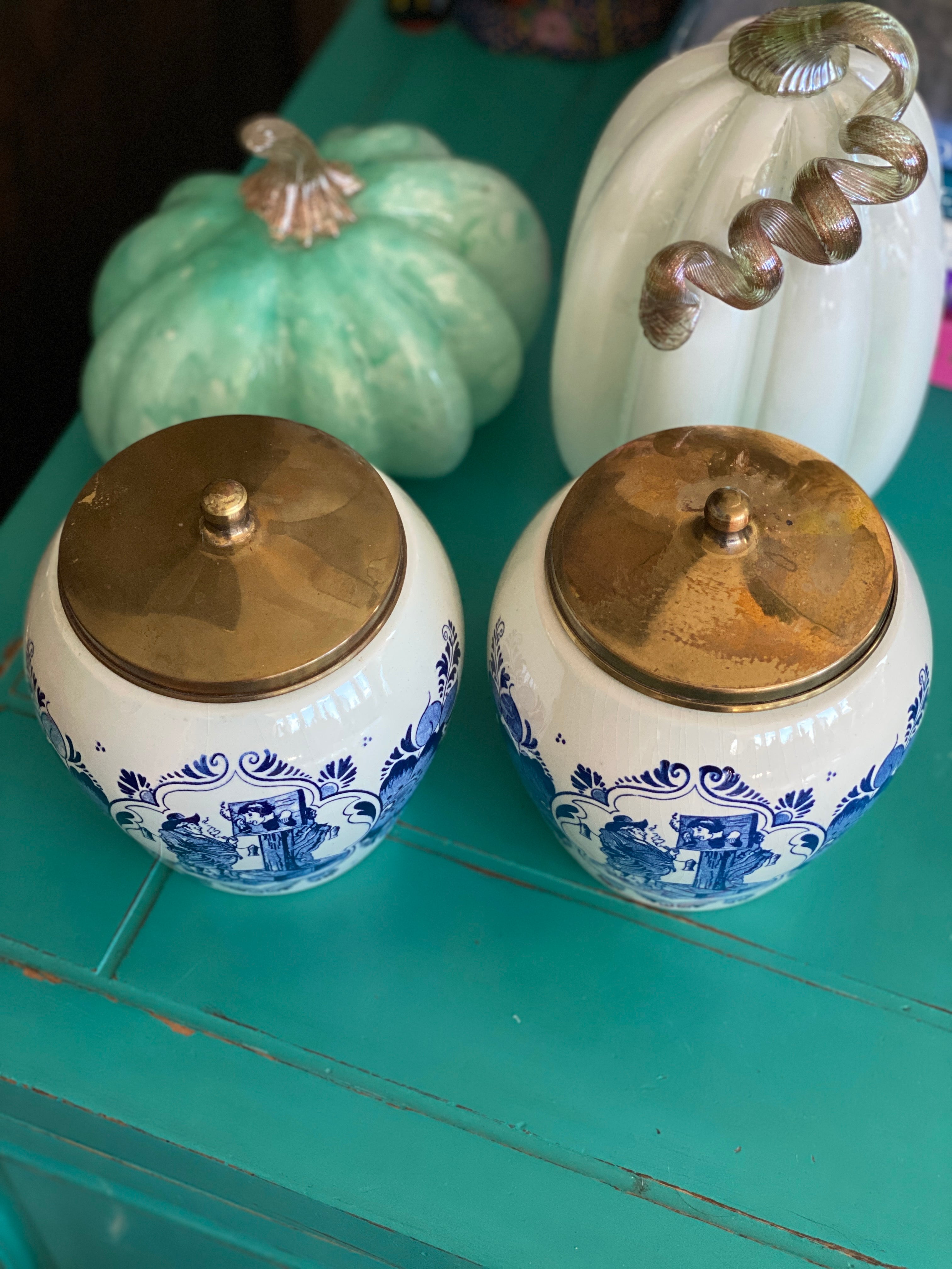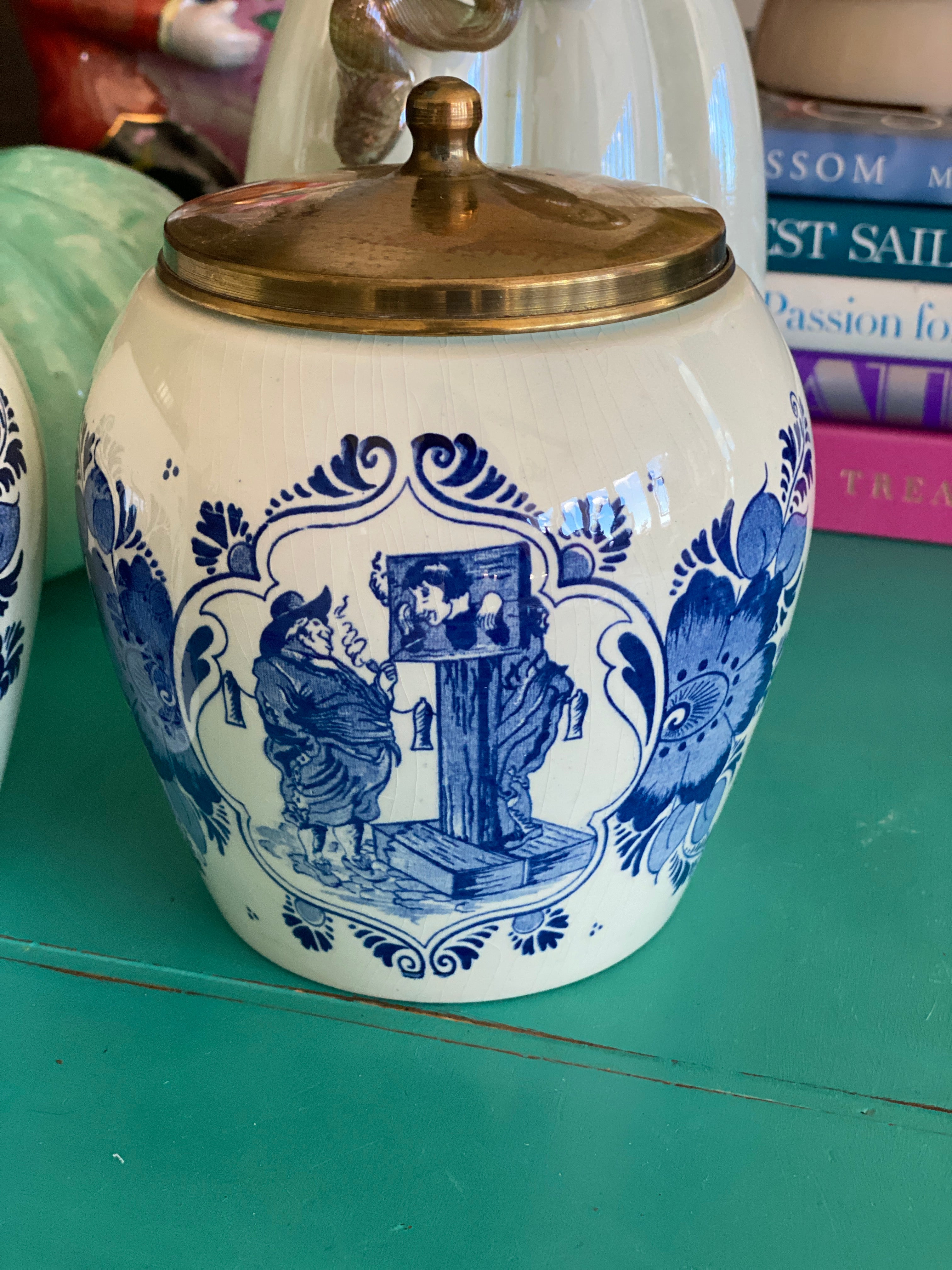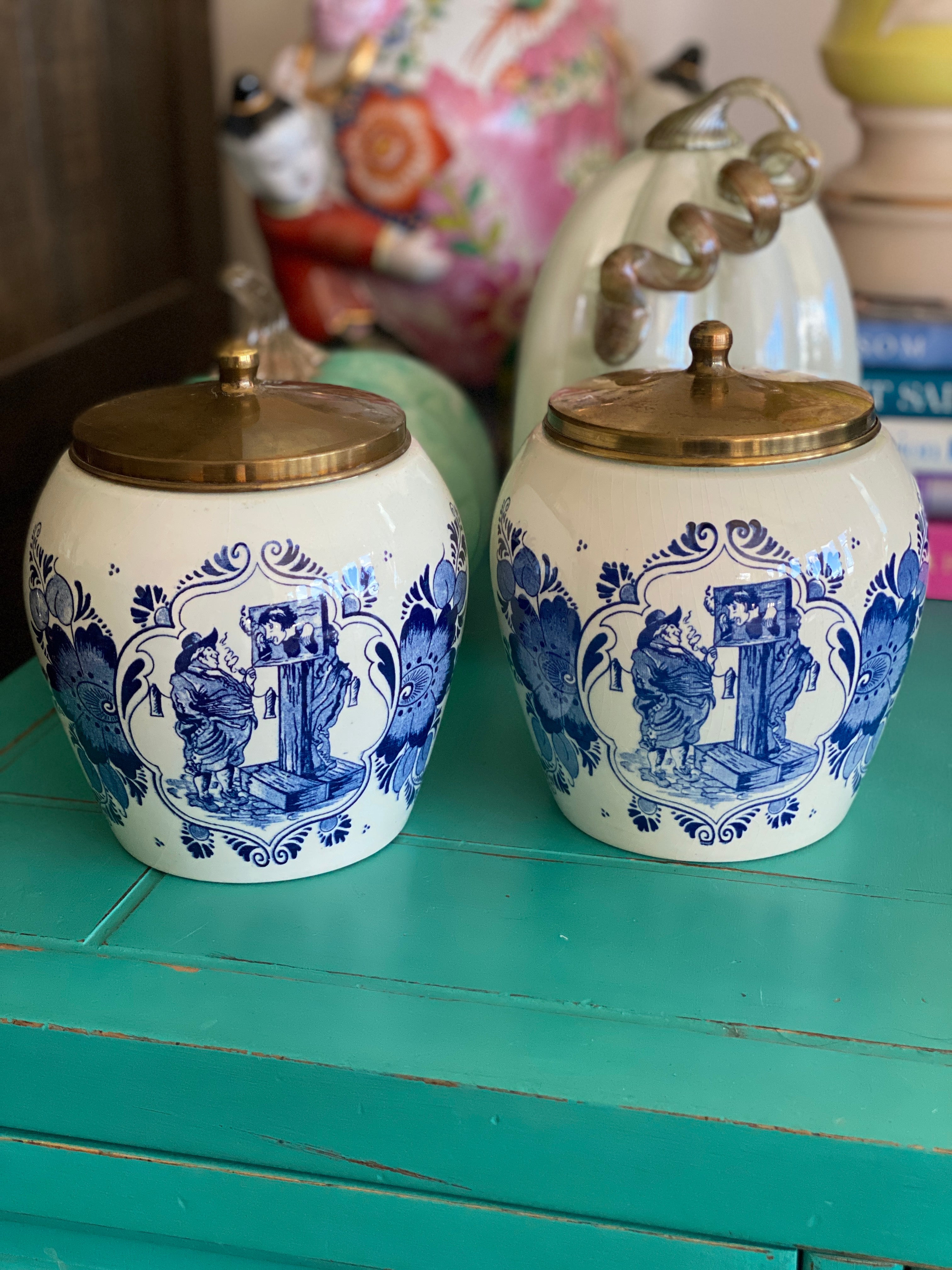Vintage Delft 1970s “Toeback” Tobacco jars blue and white brass lids