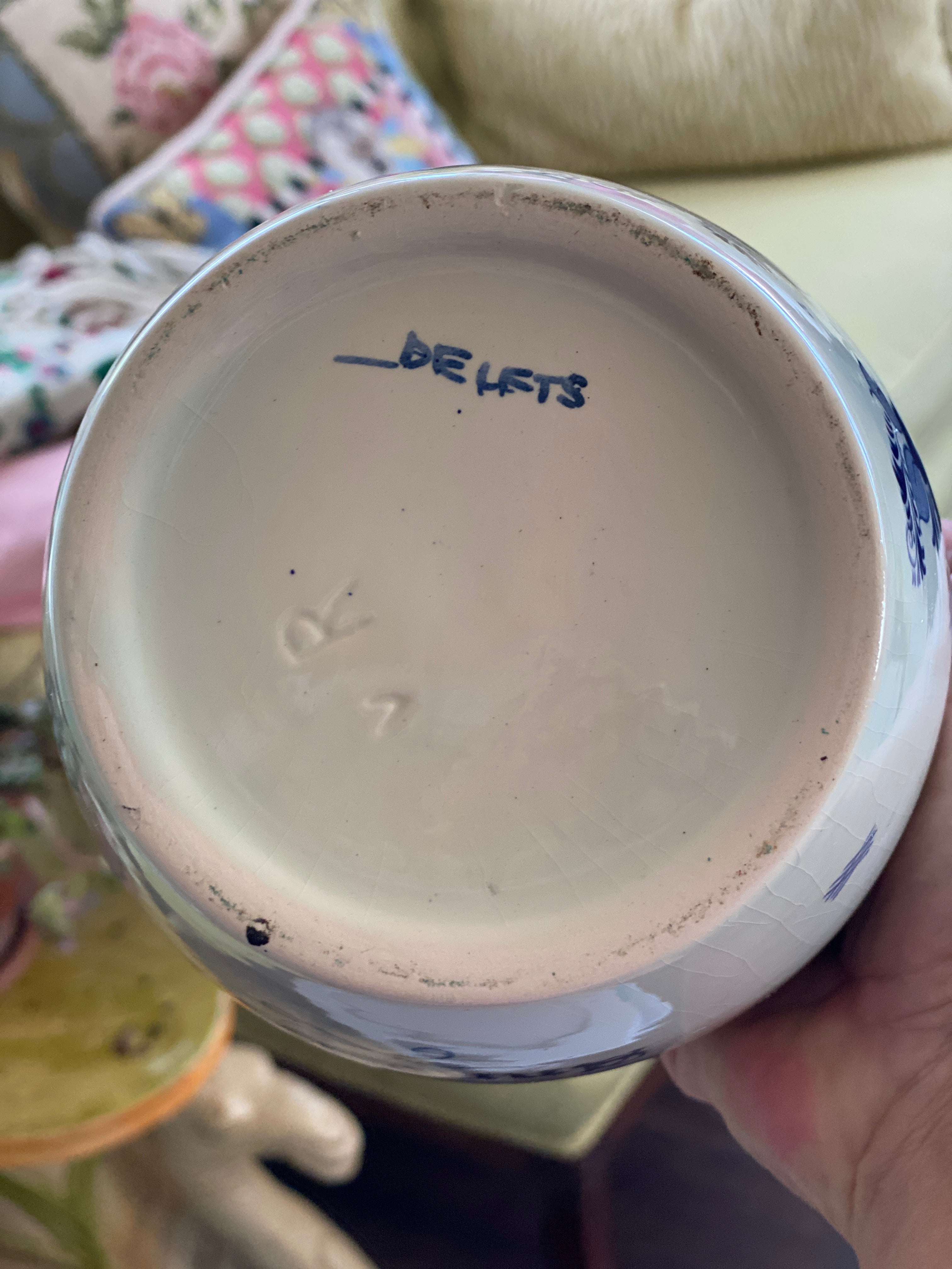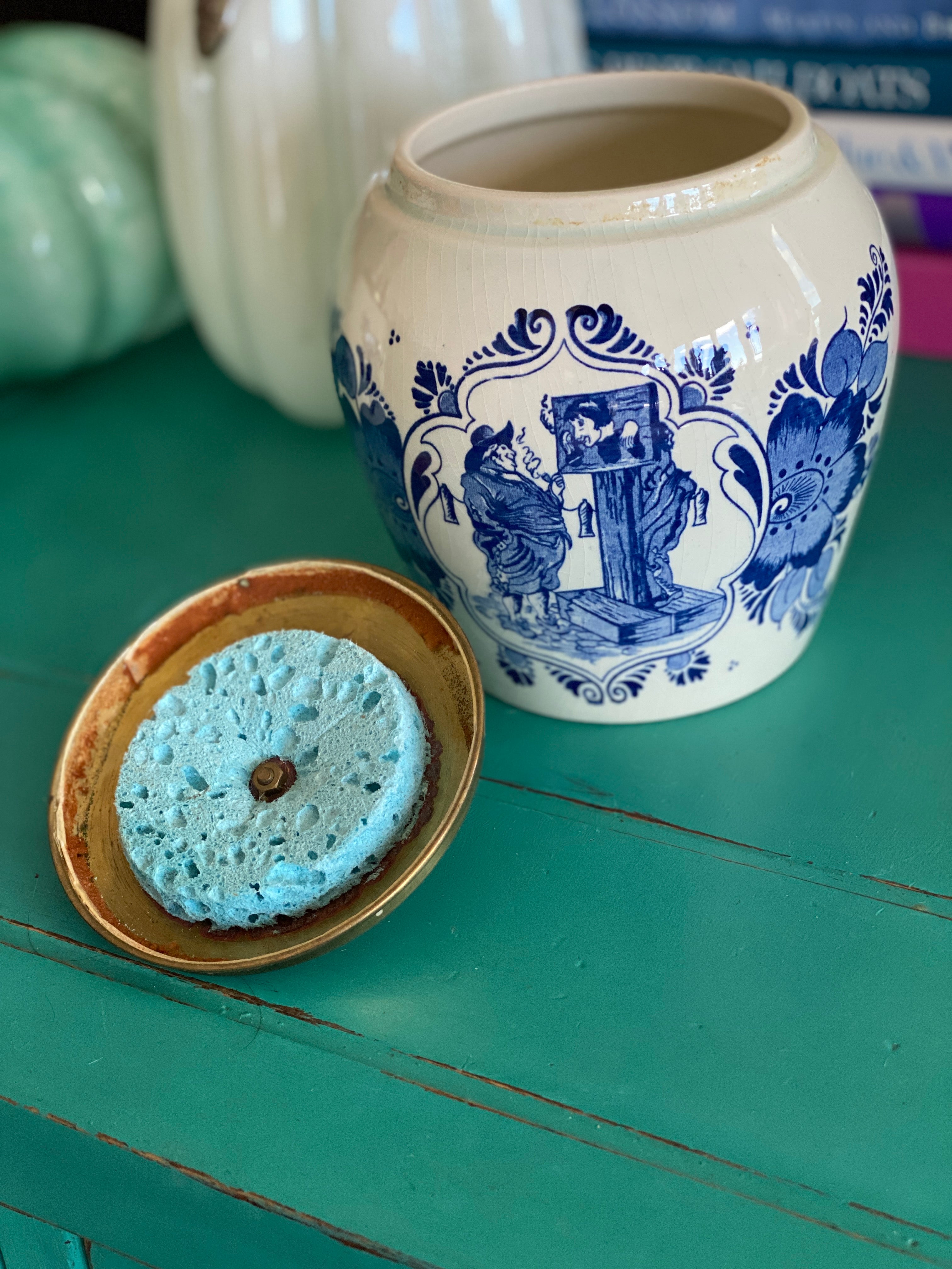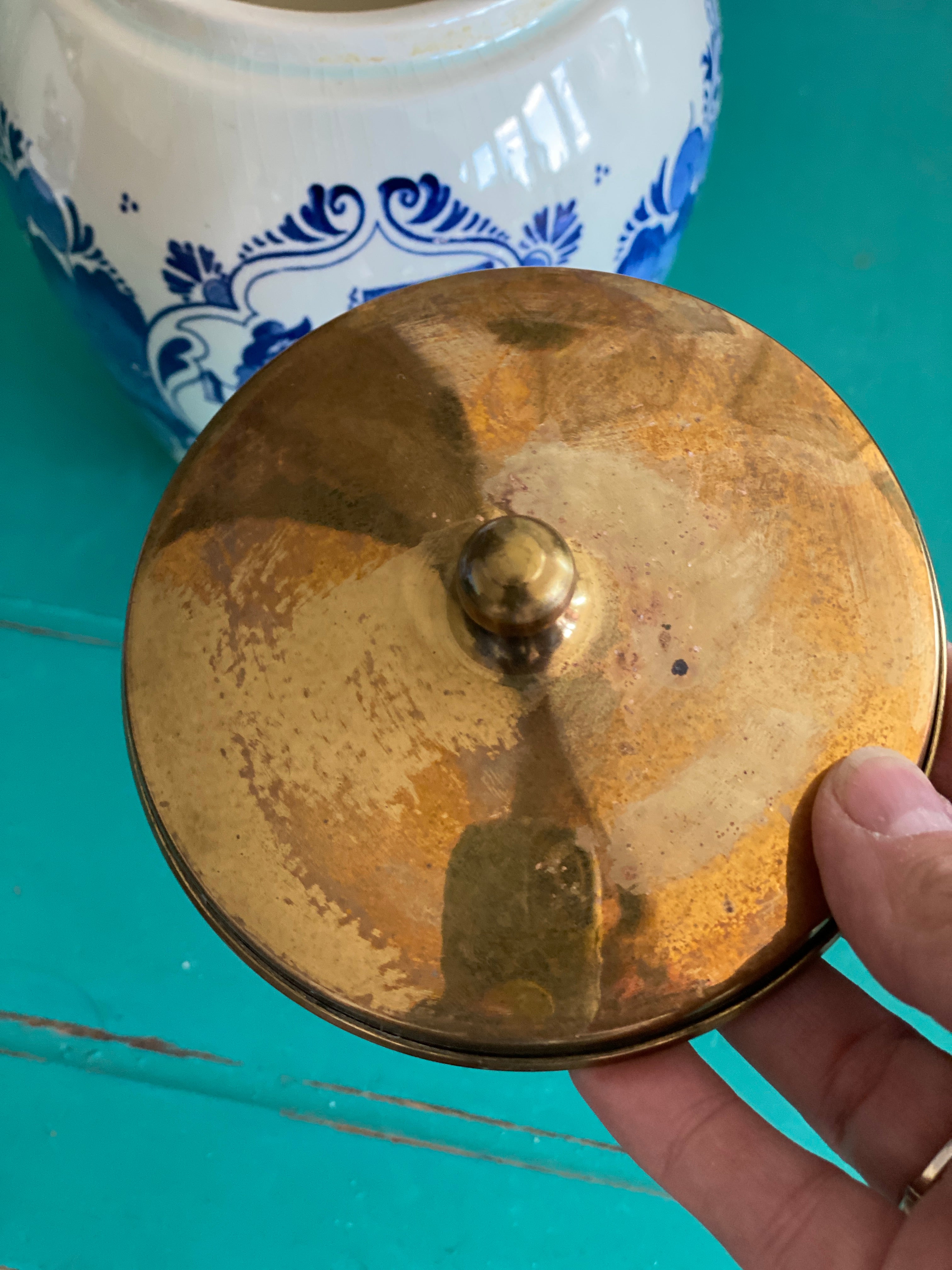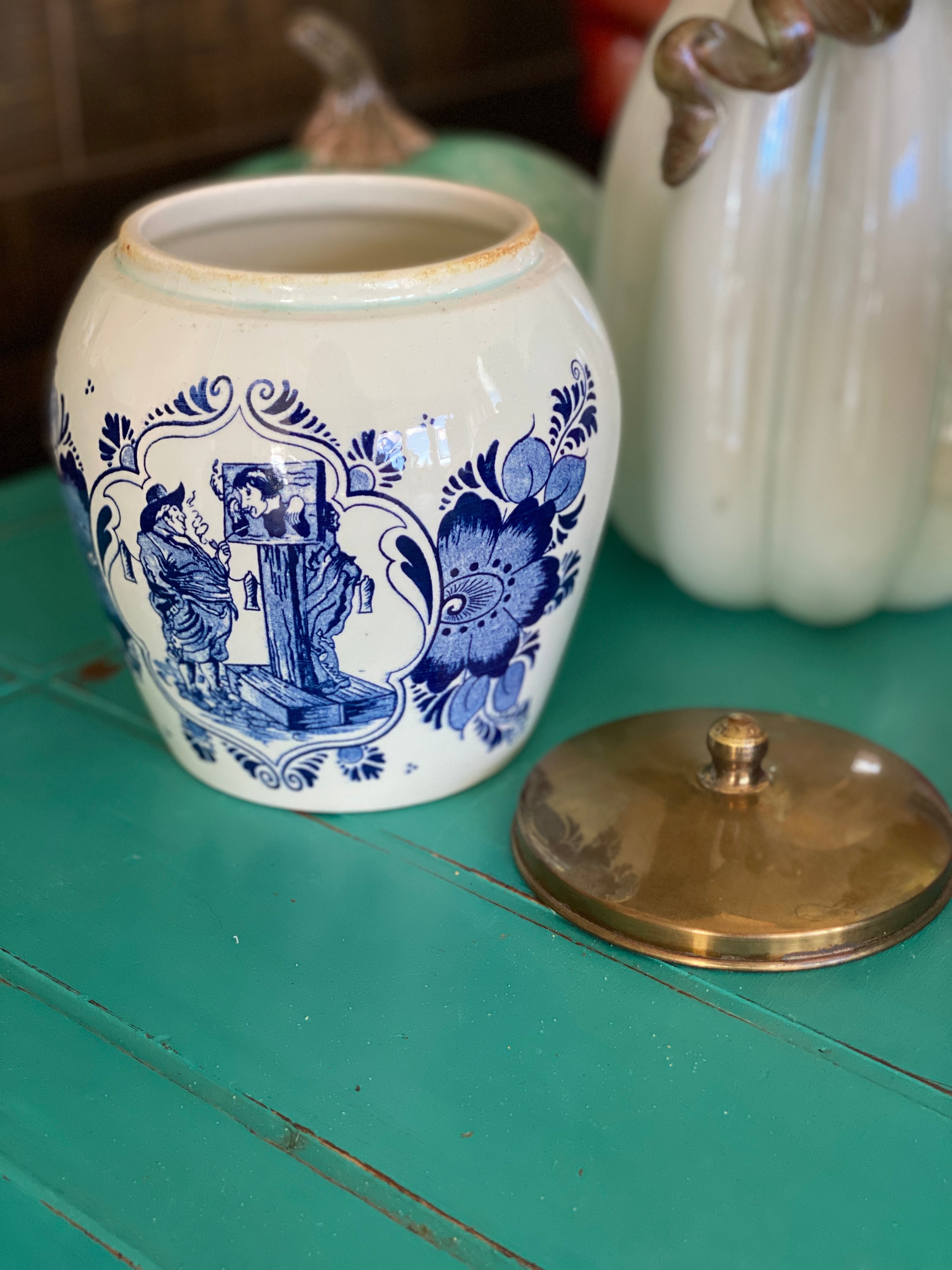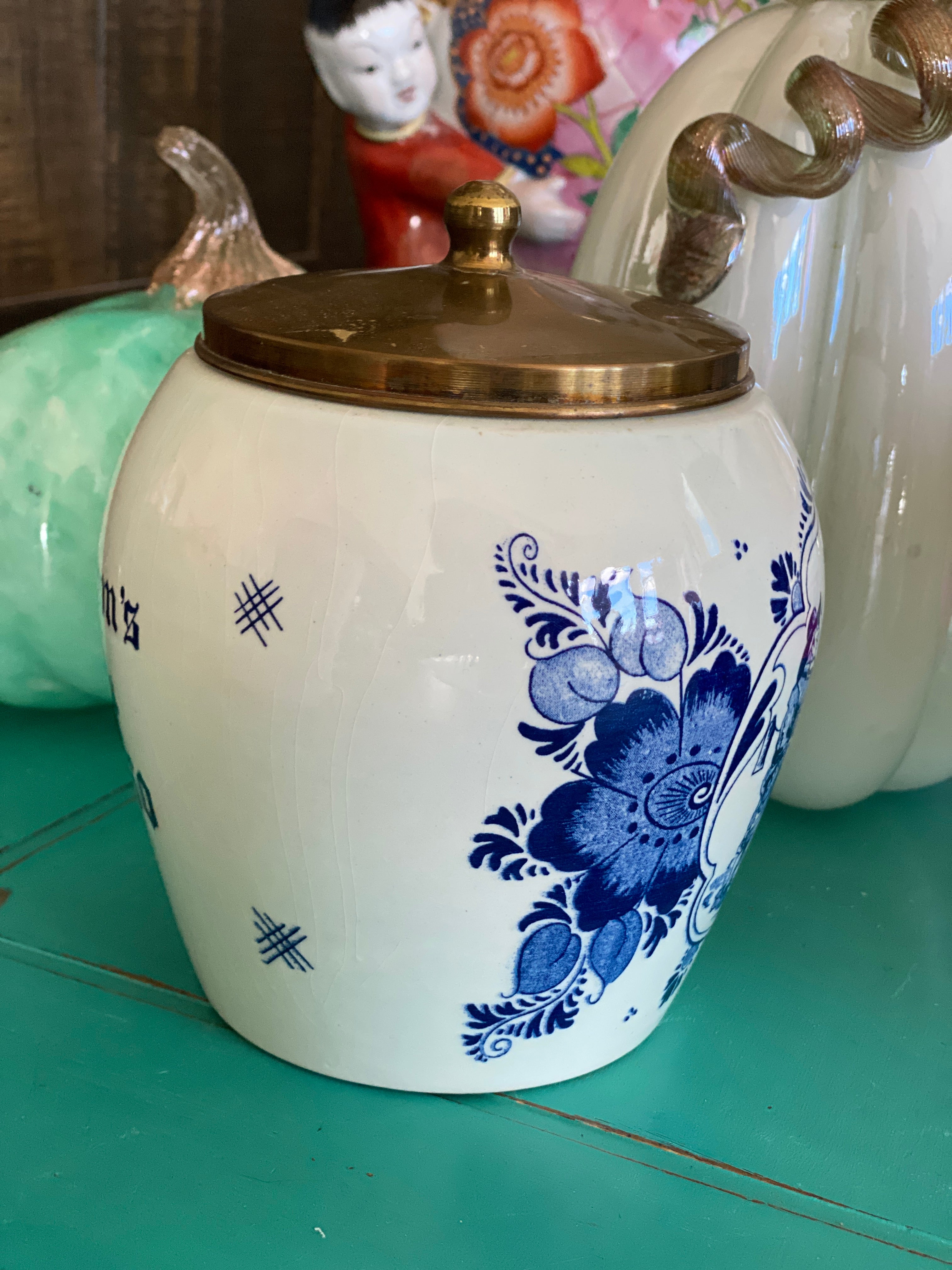 Vintage Delft 1970s “Toeback” Tobacco jars blue and white brass lids