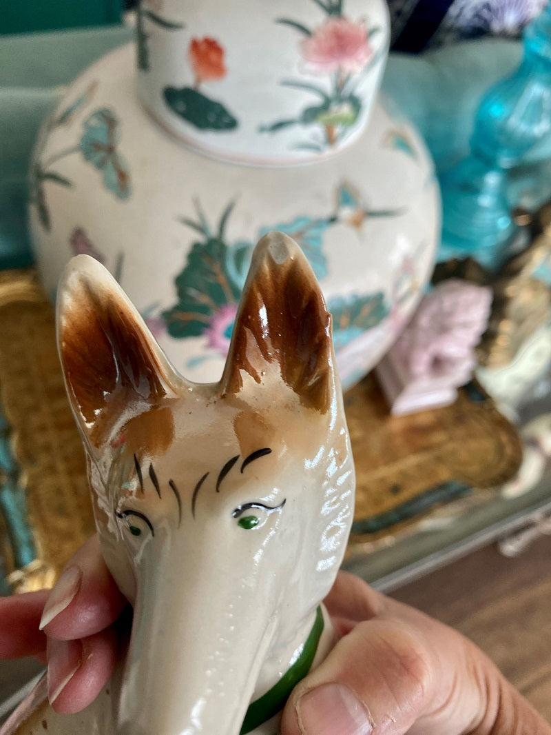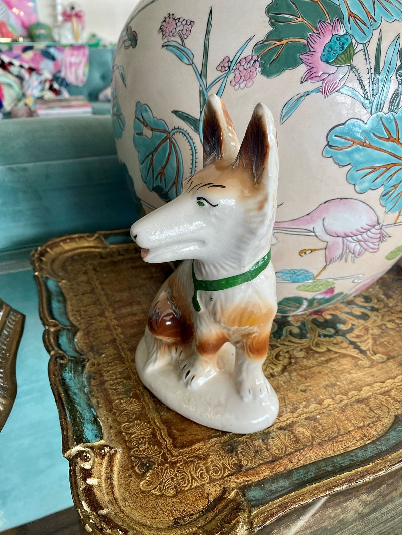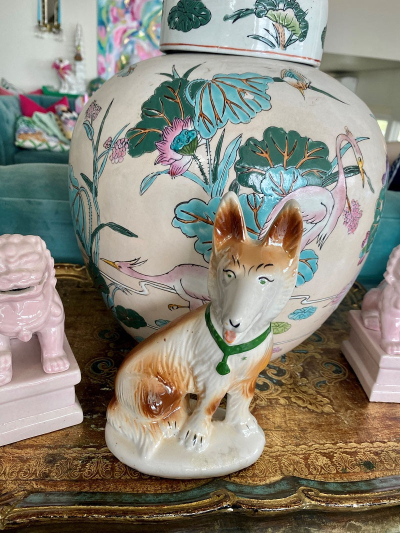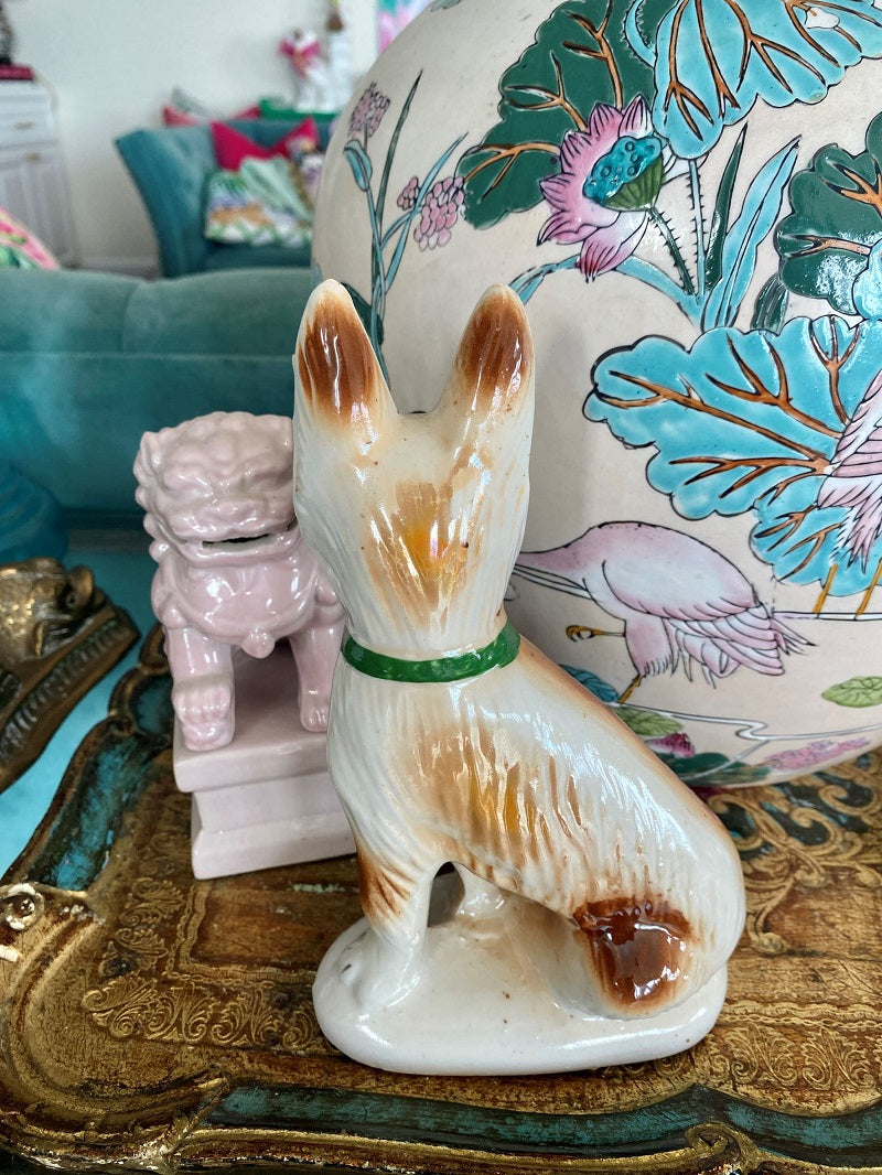 Vintage figurines are so fun to collect, especially dogs. From foo dogs to Staffordshire they just make us happy. This sweet pup is stamped on the bottom. His ears are alert and he is wearing a green collar. Spotted in brown and tan with a white base coat. He has a tiny chip or imperfection on his ear. It is glazed over so is probably just an imperfection when made. Great to give as a gift or add to your own personal collection.