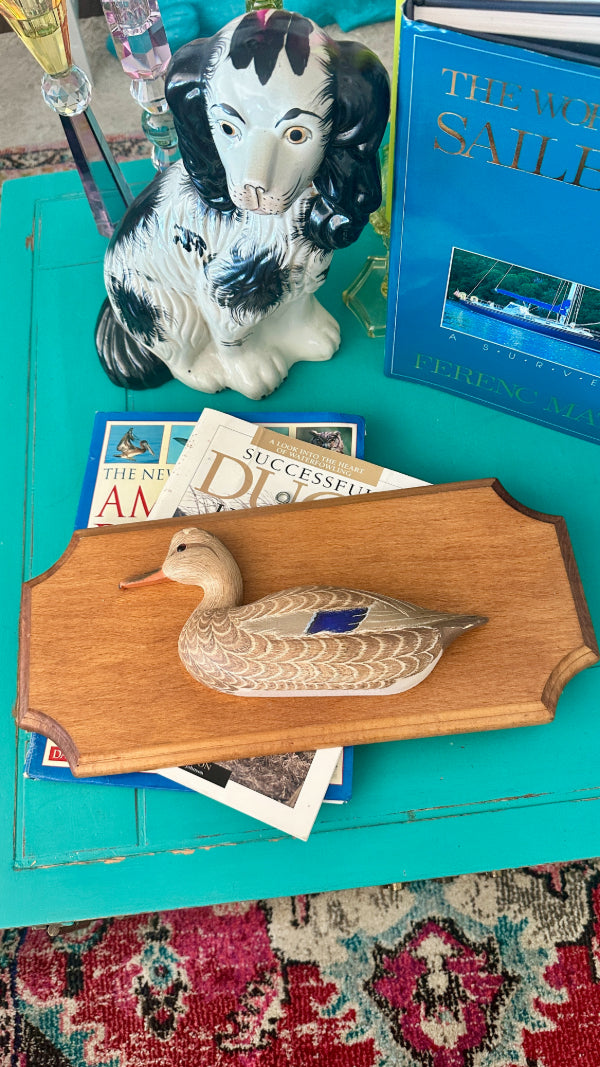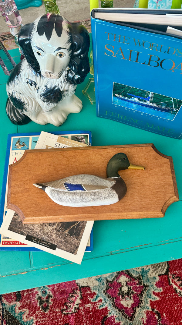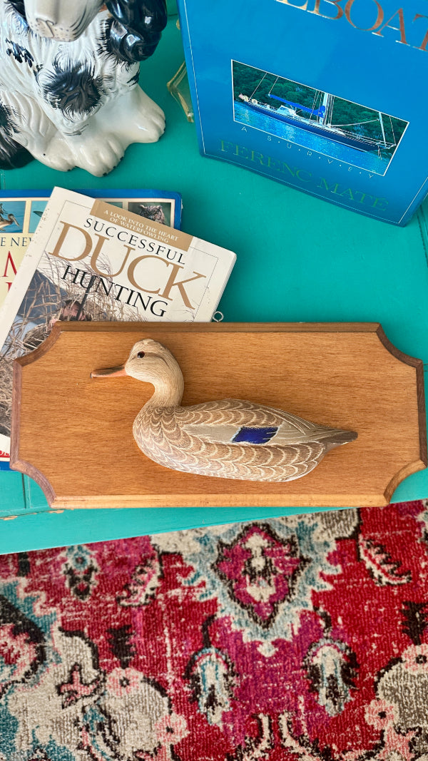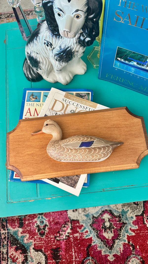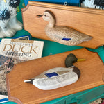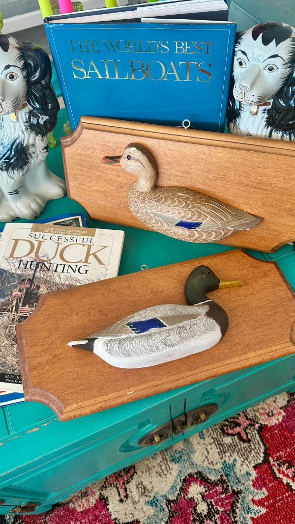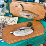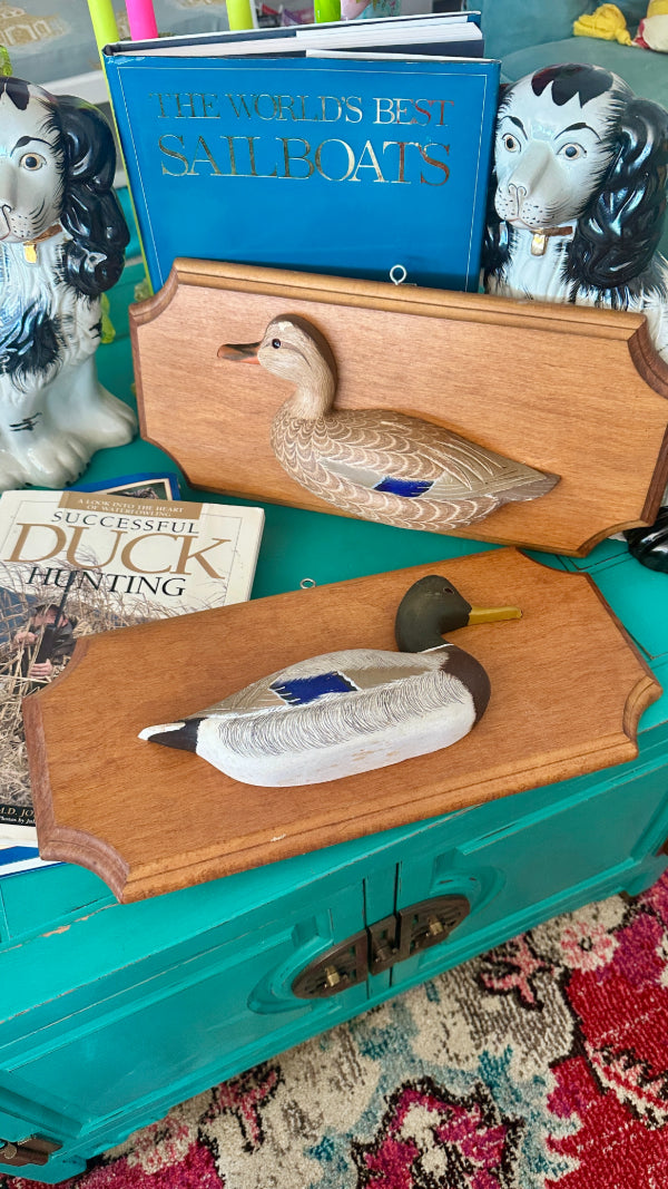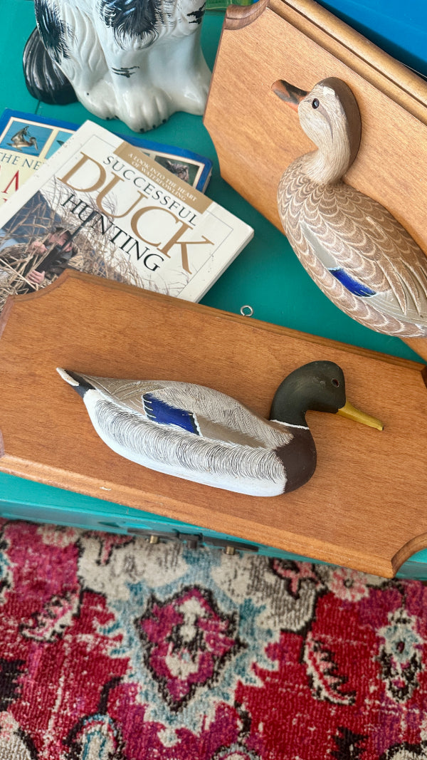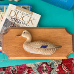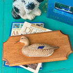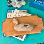 This pair of vintage duck plaques, hand-carved in 1975 and signed by the artist, showcases detailed craftsmanship in solid wood. A charming nod to rustic wildlife art—perfect for cabin decor or collectors of folk and nature-inspired pieces. Carved by a local on Knotts Island, NC. slight wear typical with age. Option to purchase separately or as a pair.