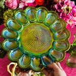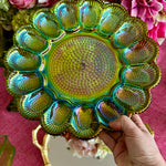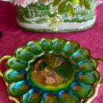 Add a touch of vintage charm to your kitchen with our Green Carnival Fenton Glass Egg Plate! This iridescent piece is perfect for serving eggs in style, making every meal feel like a special occasion. Great to spice up your holiday table. Handcrafted with care and attention to detail, this plate is truly one of a kind. Pristine vintage condition and ready to use or display.