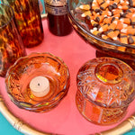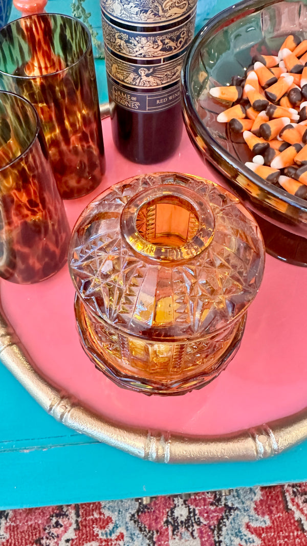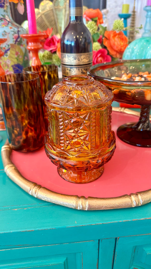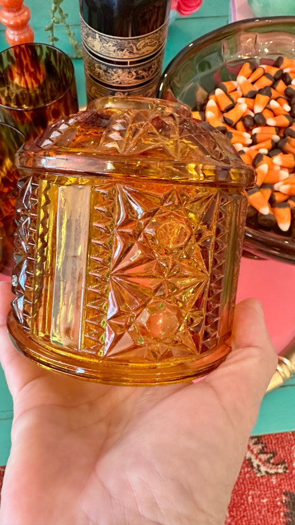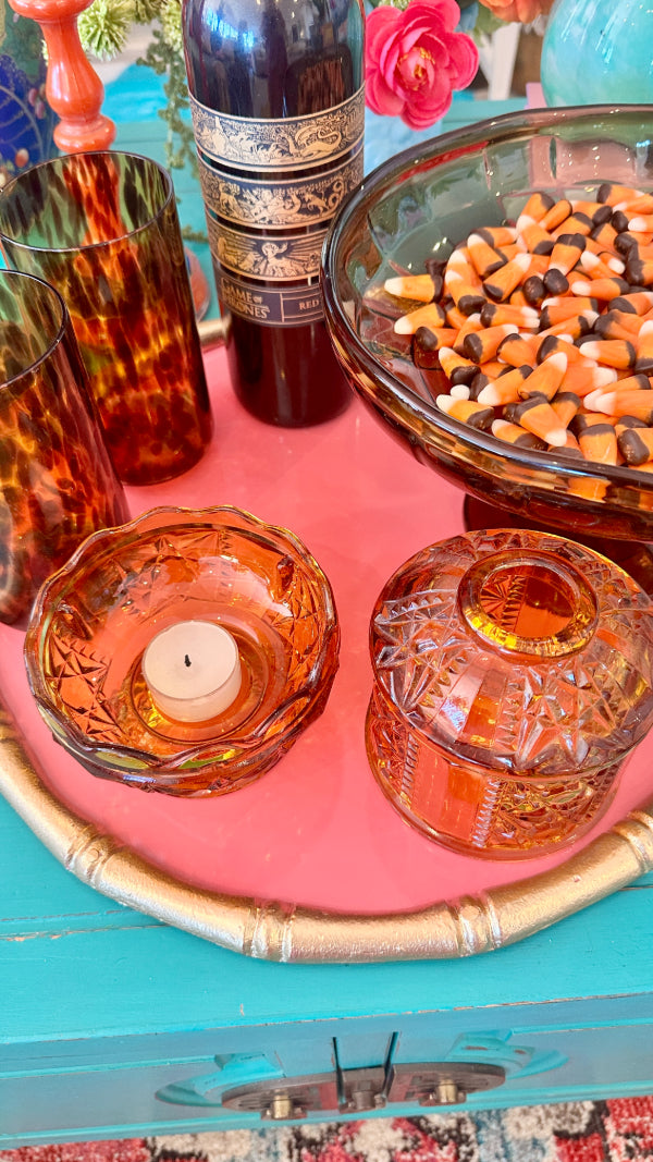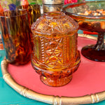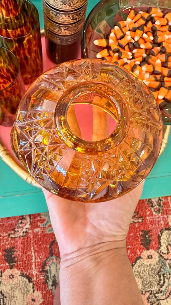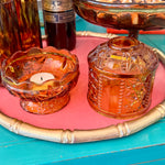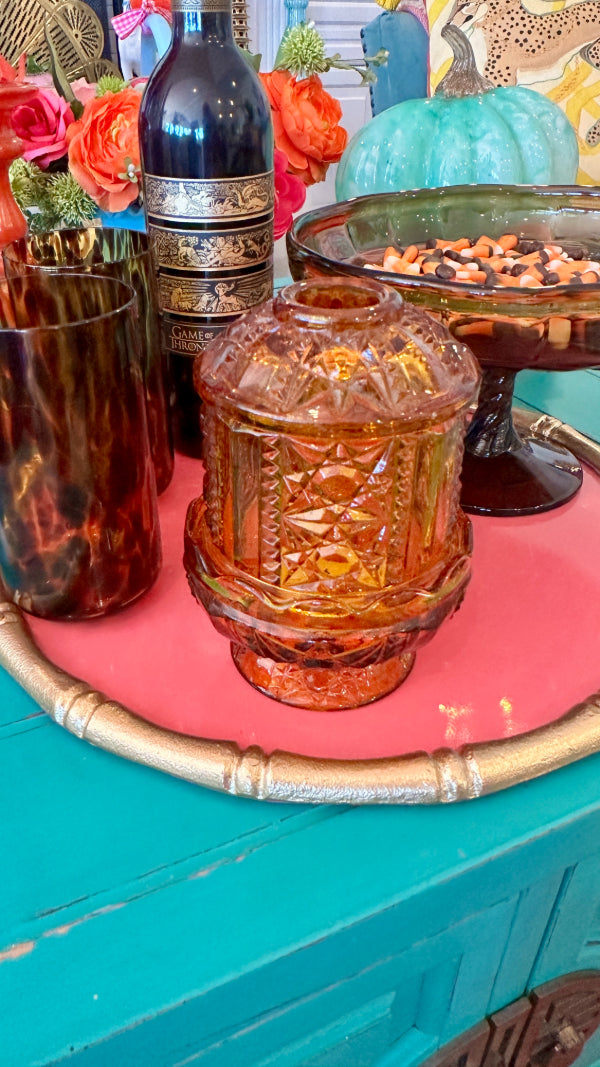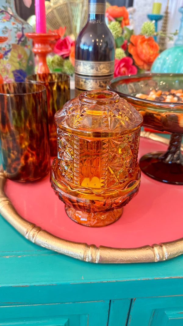 Illuminate your space with the warm glow of this Vintage Indiana Glass Fairy Lamp in rich amber glass. Featuring the classic Stars and Bars pattern, this timeless piece captures the beauty of mid-century glass craftsmanship. The amber hue casts a cozy, golden light—perfect for creating a nostalgic ambiance on a mantel, bedside table, or holiday display. A beloved collectible that blends charm, function, and vintage elegance in one luminous piece.