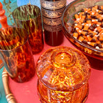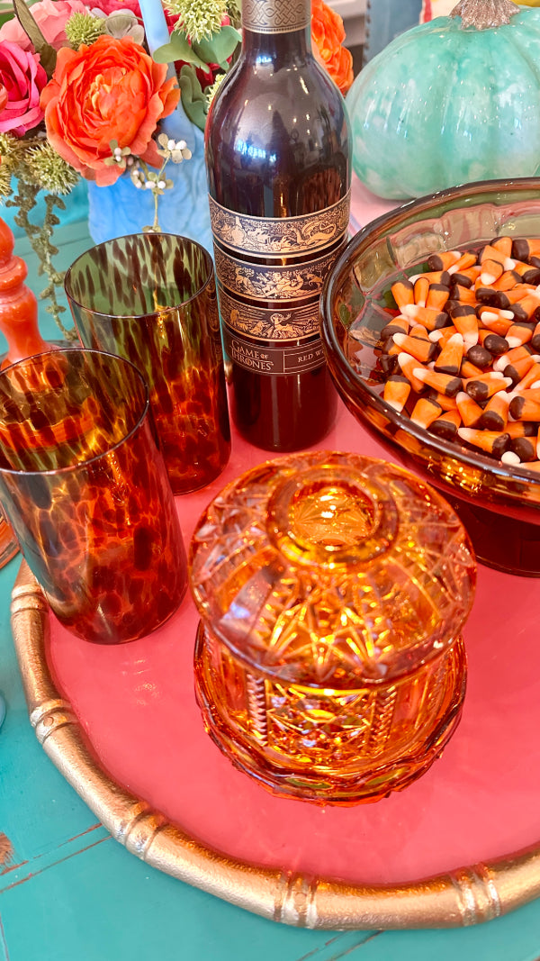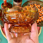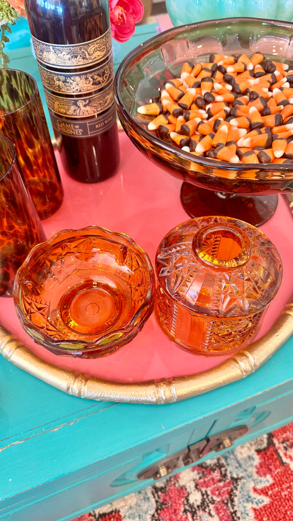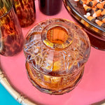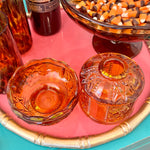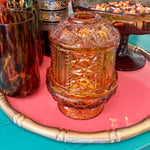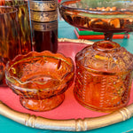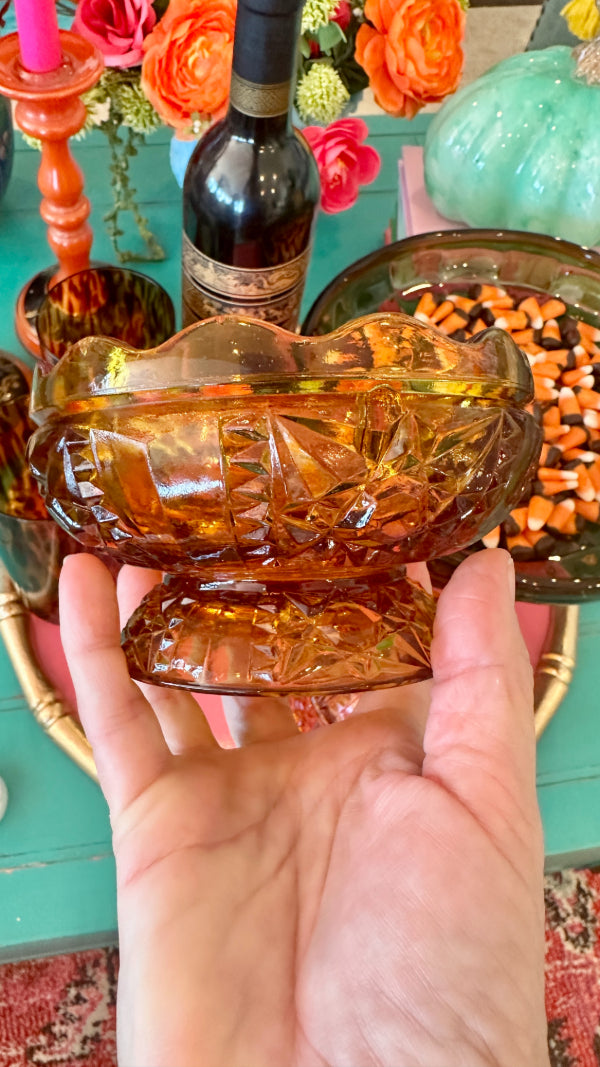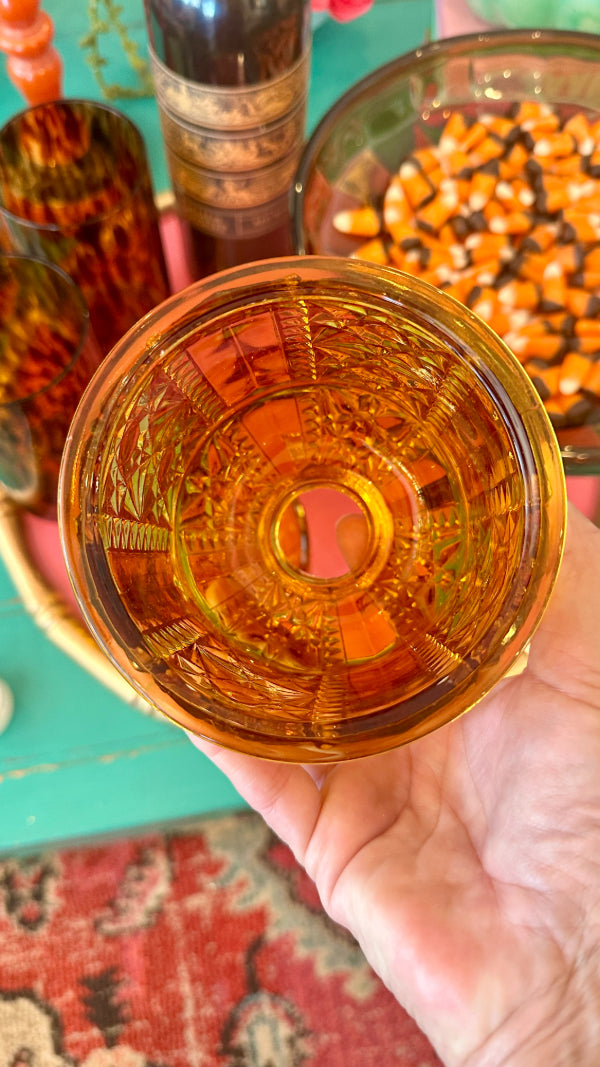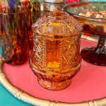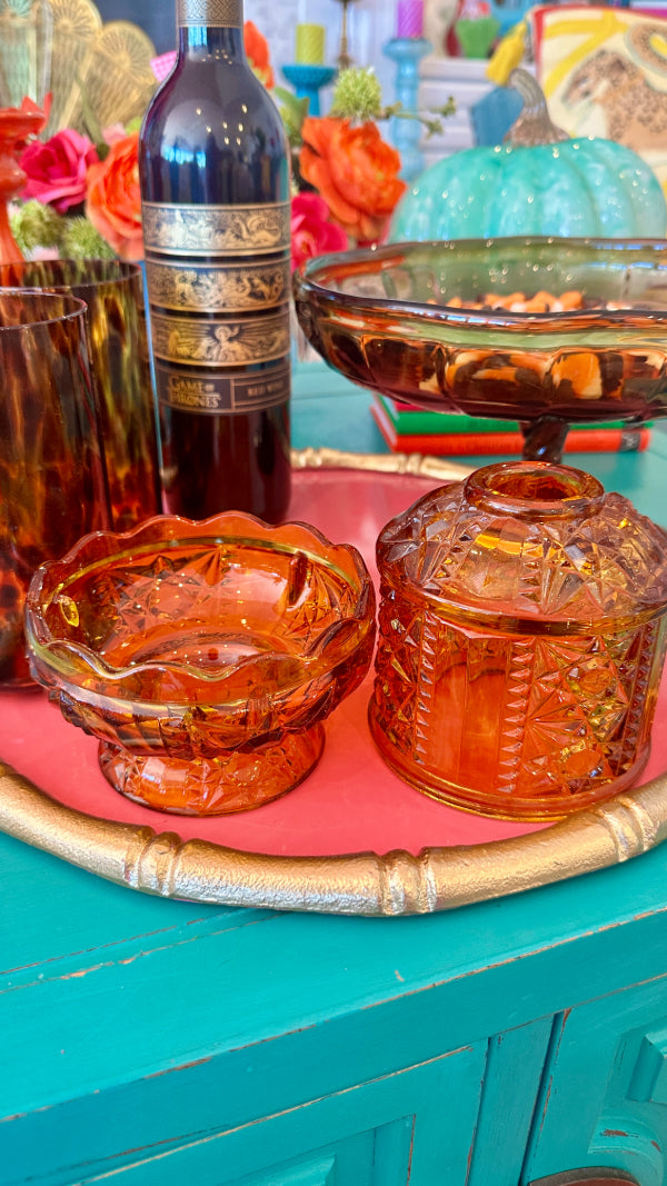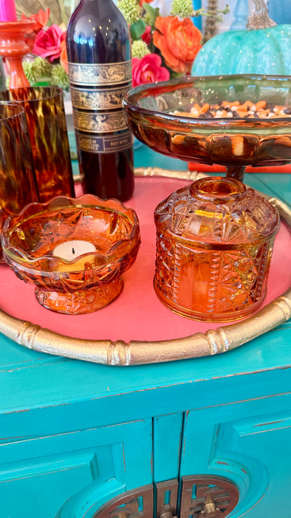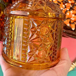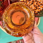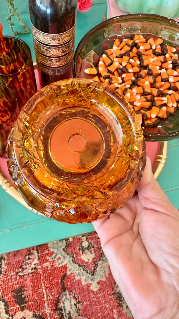 Illuminate your space with the warm glow of this Vintage Indiana Glass Fairy Lamp in rich amber glass. Featuring the classic Stars and Bars pattern, this timeless piece captures the beauty of mid-century glass craftsmanship. The amber hue casts a cozy, golden light—perfect for creating a nostalgic ambiance on a mantel, bedside table, or holiday display. A beloved collectible that blends charm, function, and vintage elegance in one luminous piece.
