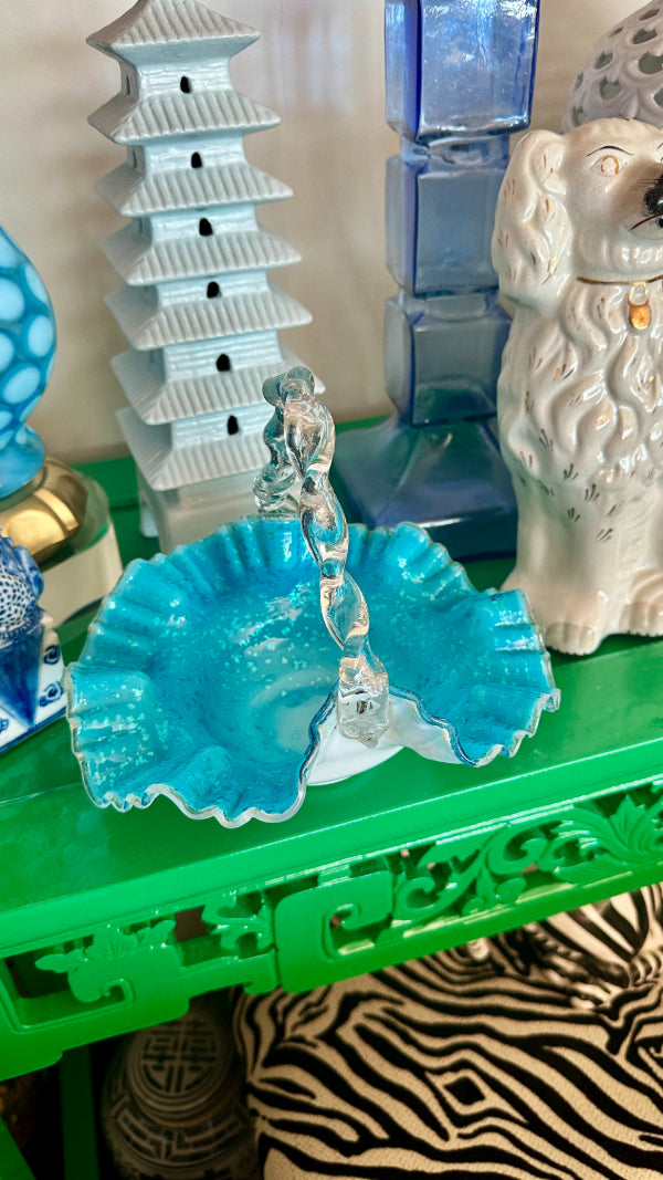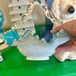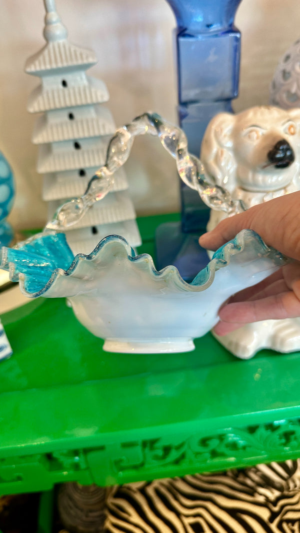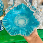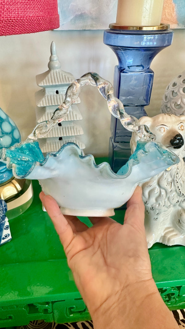 Antique Bride's Bowl, Blue Handled, Handblown, Irridescent, Rare