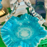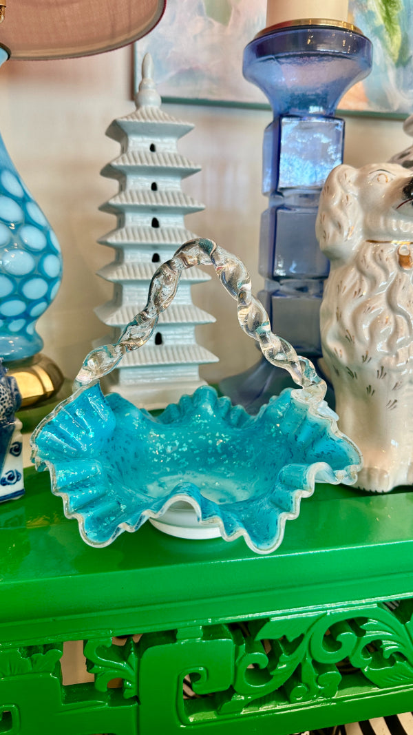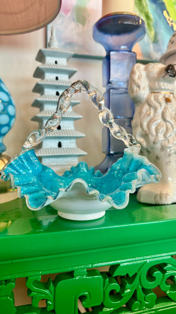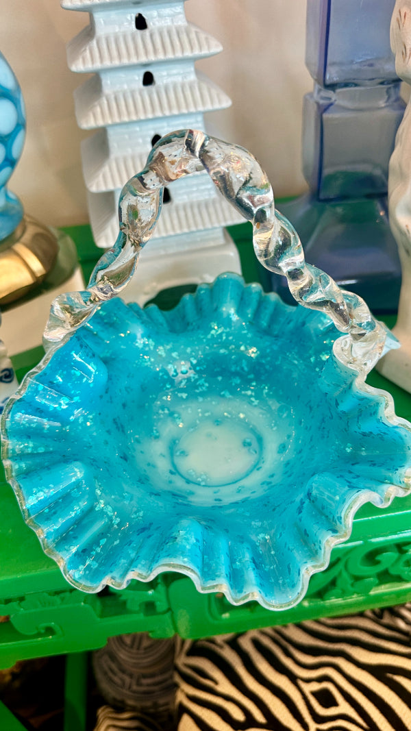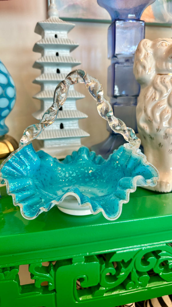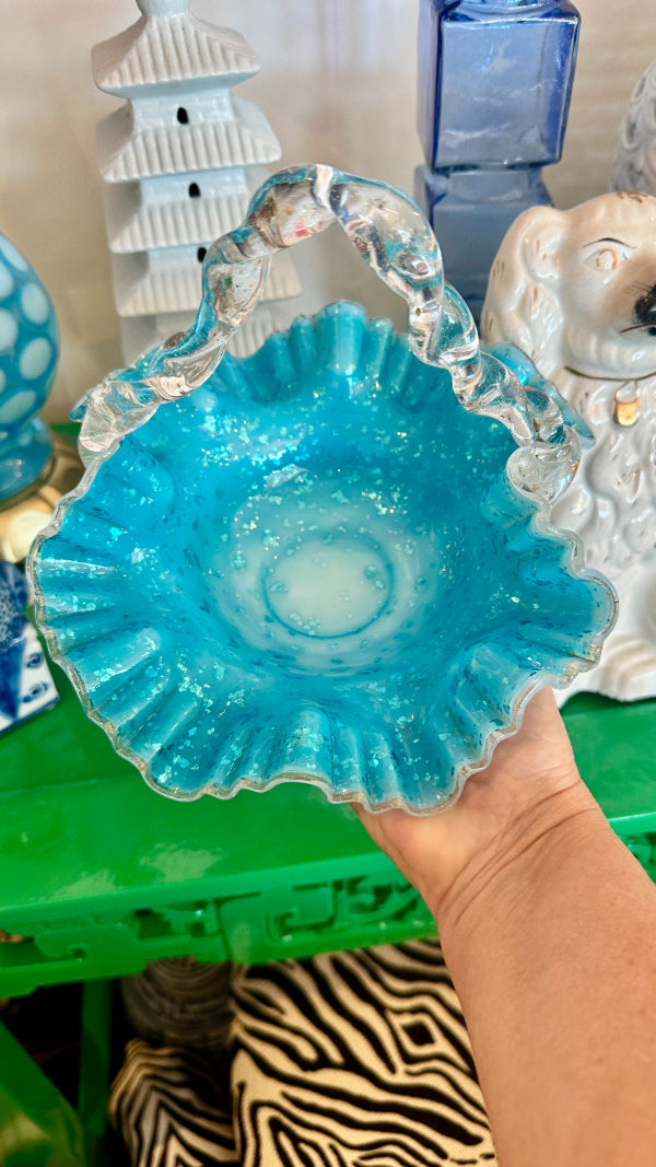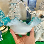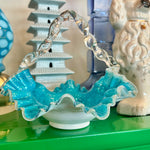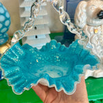 Discover timeless elegance with this Vintage Fenton Bride’s Bowl, a rare handmade piece featuring graceful blue glass and delicately applied handles. Fenton’s renowned craftsmanship shines through in the exquisite detailing and rich translucent color, making this bowl a stunning centerpiece for display or collection. Elegant and unique, this vintage treasure embodies the artistry and charm of classic American glassmaking—a true heirloom-quality find for collectors and décor enthusiasts alike.