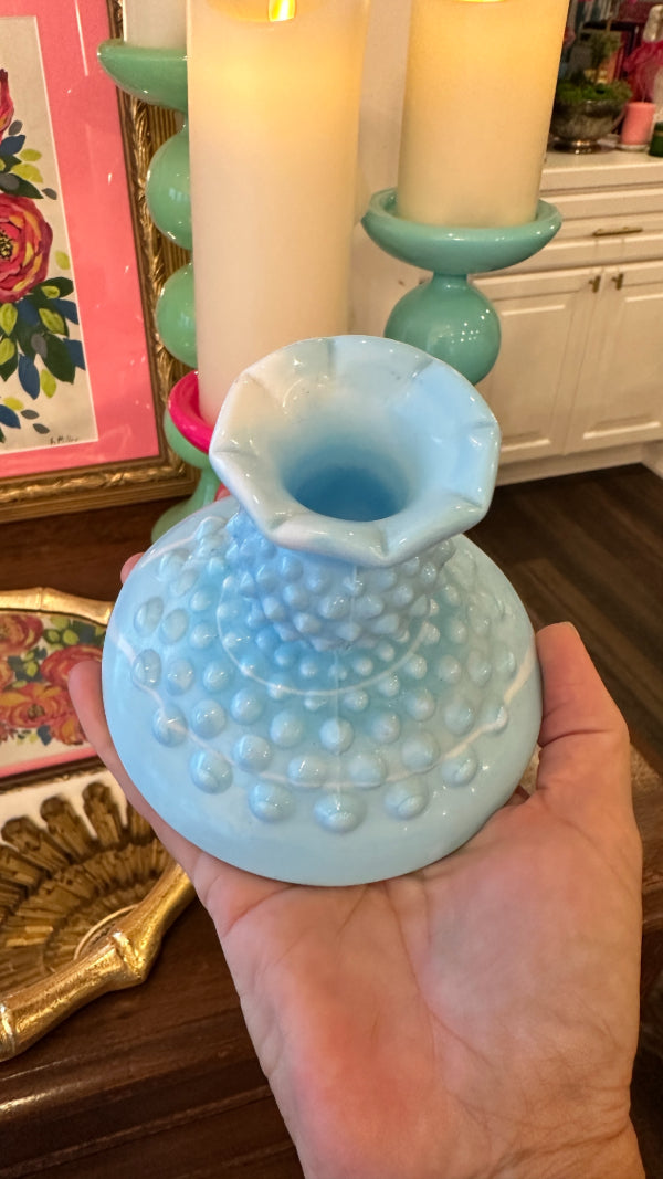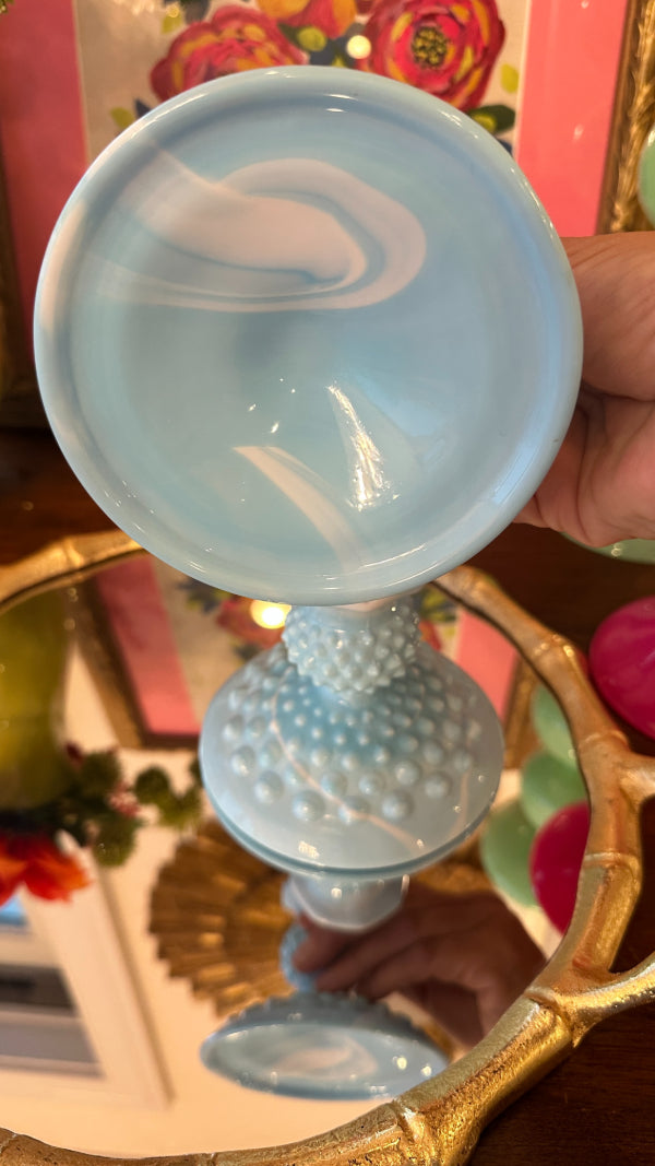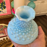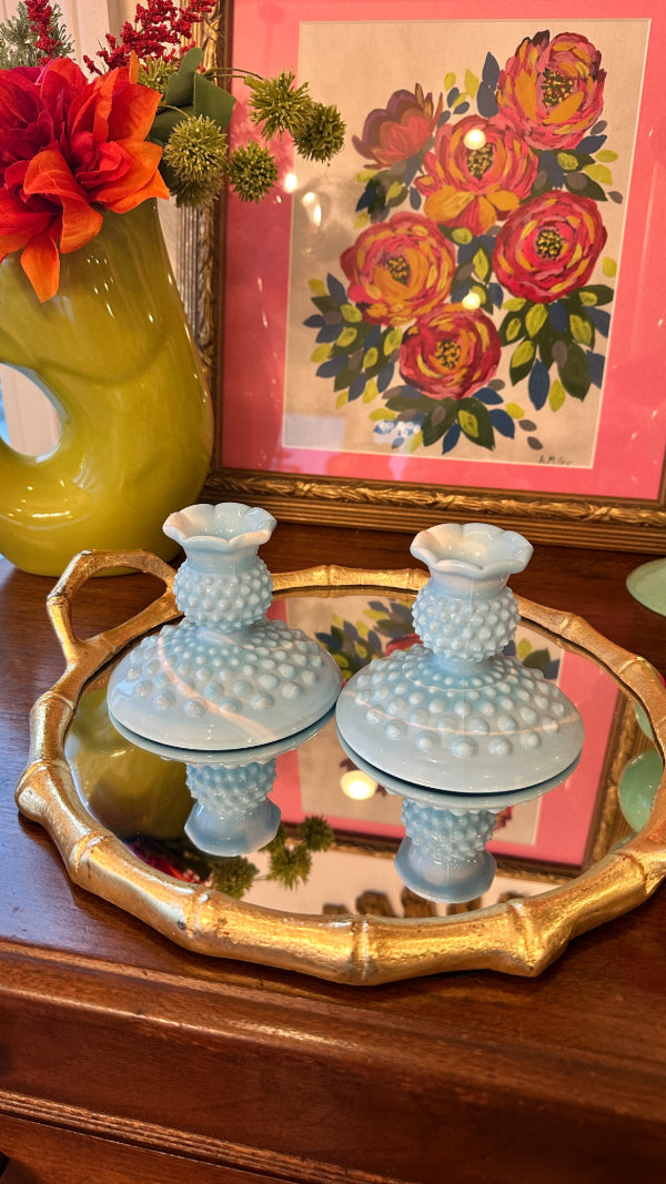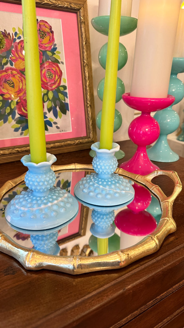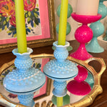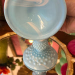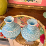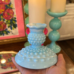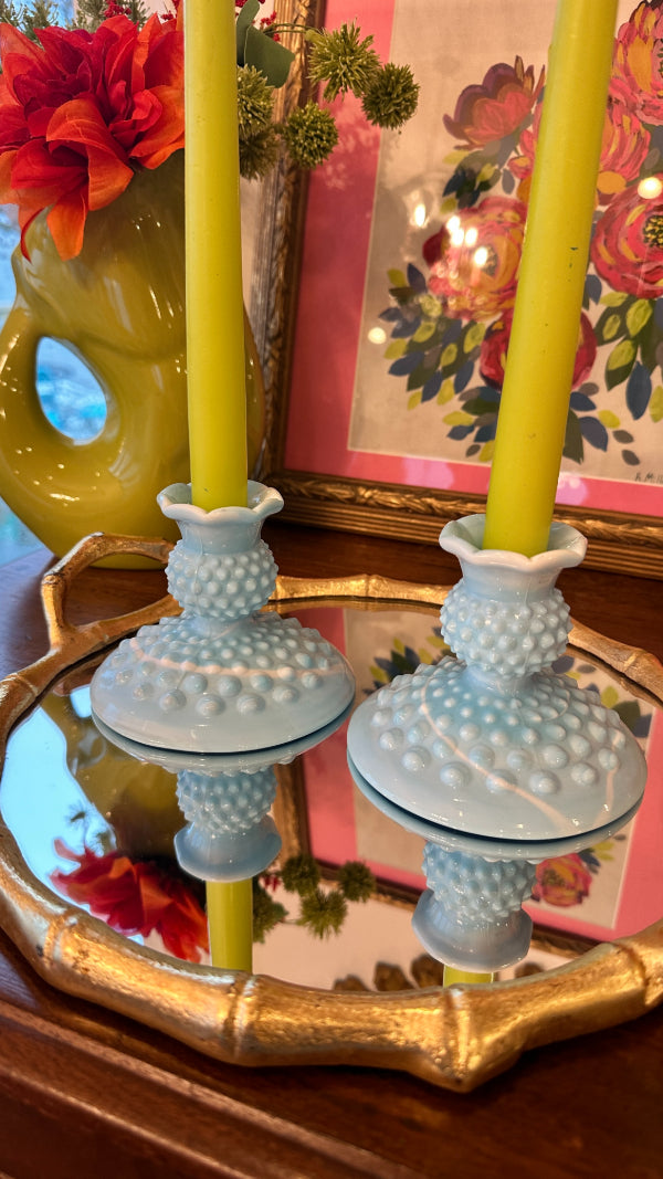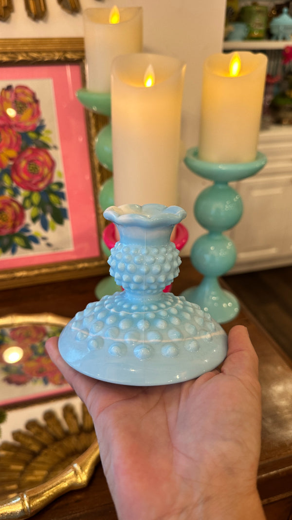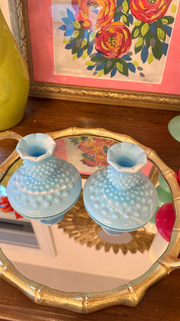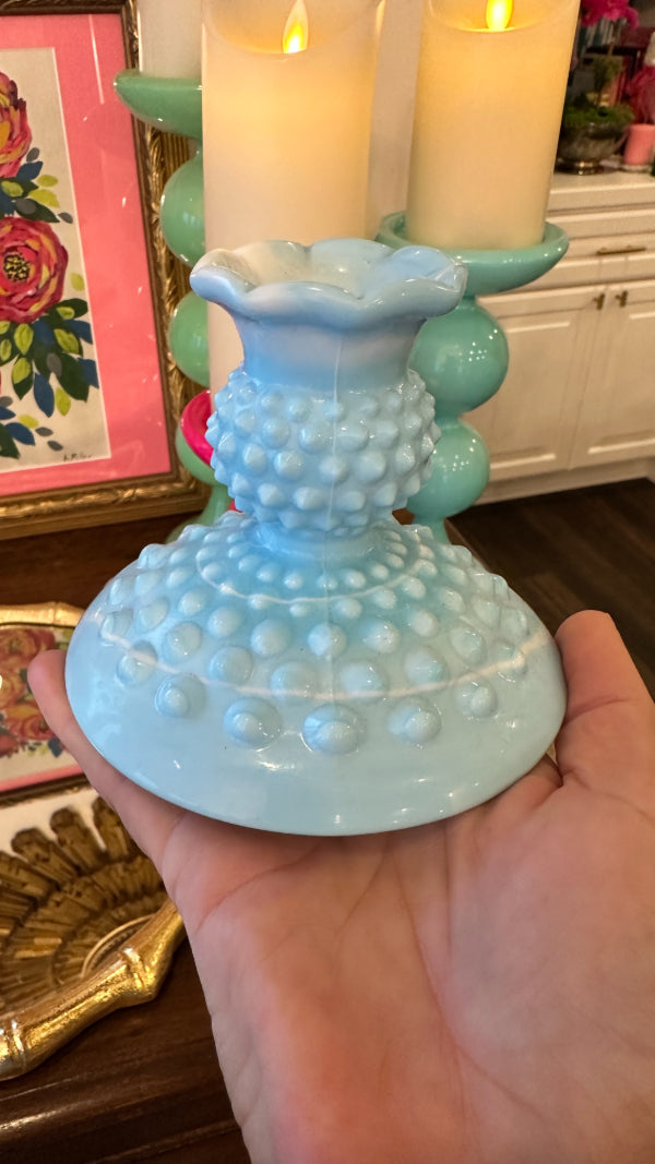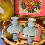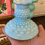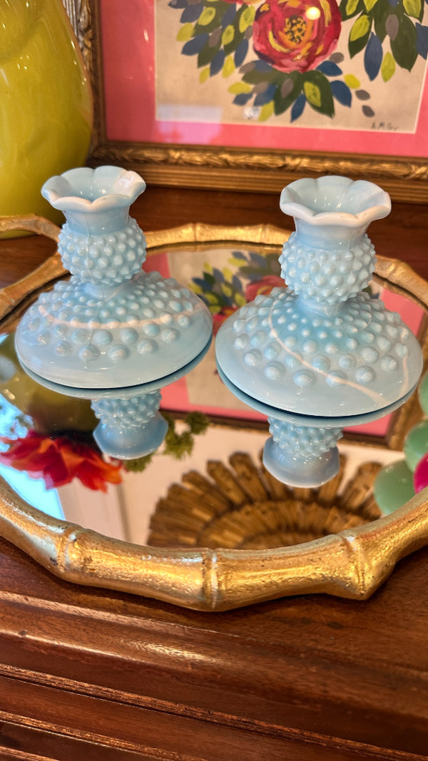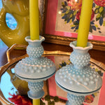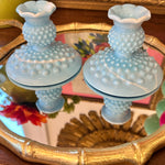 Vintage Fenton Glass Candle Holders, Pair, Slag Glass, Hobnail, Blue and White