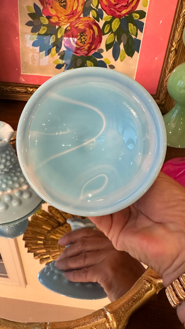 Bring timeless charm to your home with this stunning pair of vintage Fenton Glass candle holders. Crafted in beautiful blue and white slag glass, these pieces showcase Fenton’s signature hobnail pattern and expert craftsmanship. Each holder features rich swirls of color that make every piece unique. Perfect for anyone looking to add an elegant, nostalgic touch to their décor, these candle holders embody the artistry and quality of classic Fenton glass.