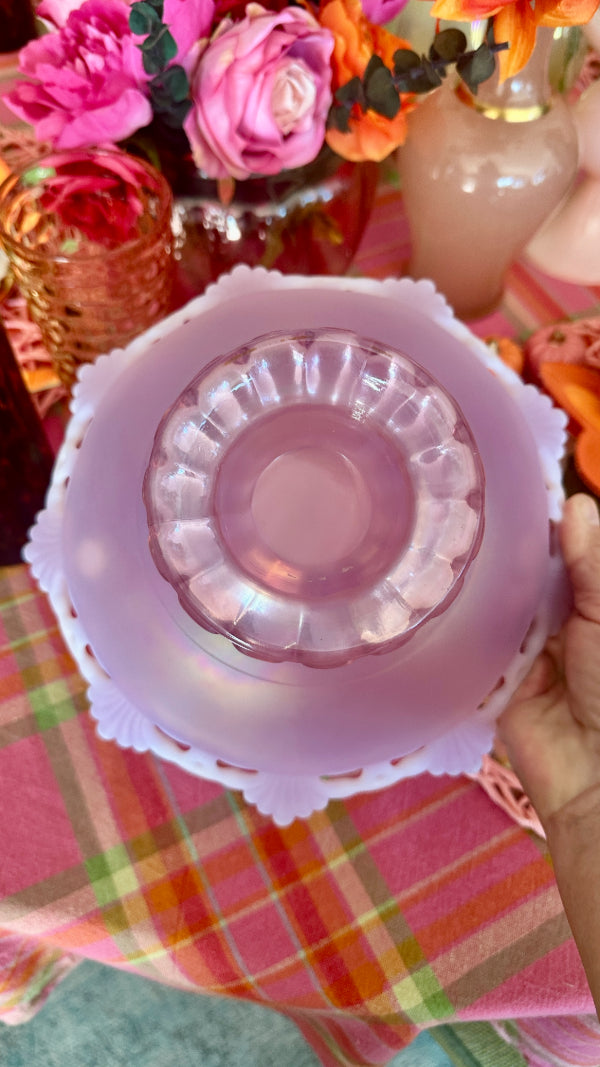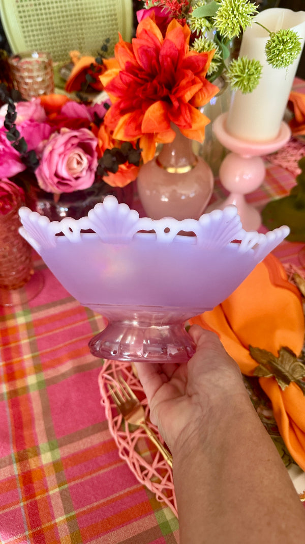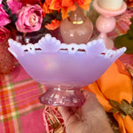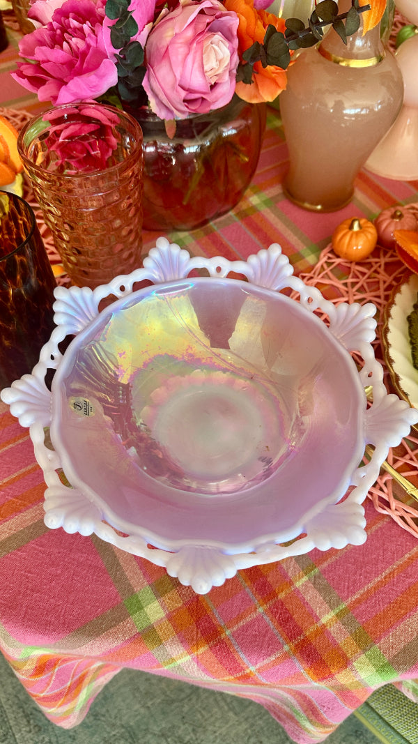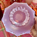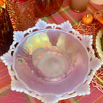 Embrace the delicate beauty of this Vintage Fenton Opalescent Rose Bowl, featuring the elegant Magnolia and Lily of the Valley pattern. Expertly handcrafted by Fenton Art Glass, this exquisite piece displays a soft opalescent glow that shimmers beautifully in the light. The intricate floral design and gently crimped rim add a touch of romance and sophistication, making it a stunning centerpiece or collectible for any vintage glass enthusiast. A timeless example of Fenton’s renowned craftsmanship and artistry.