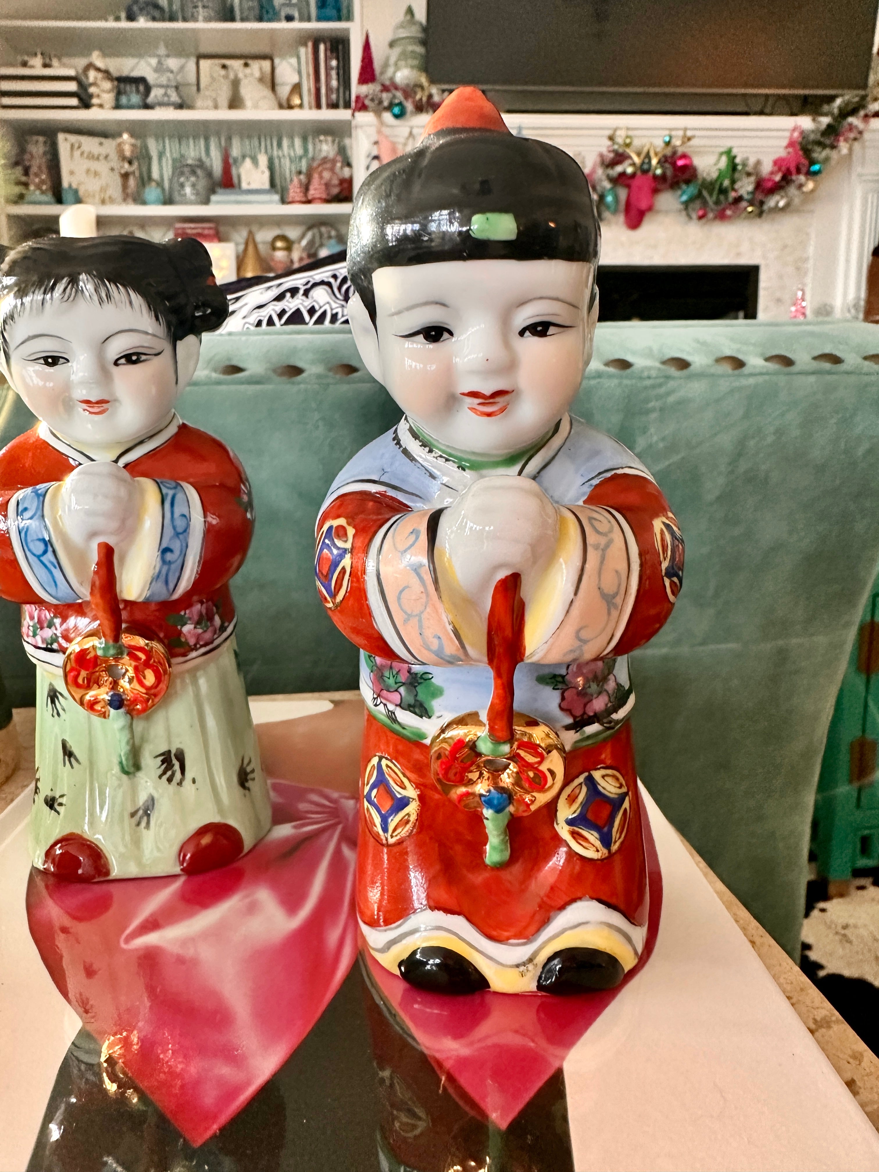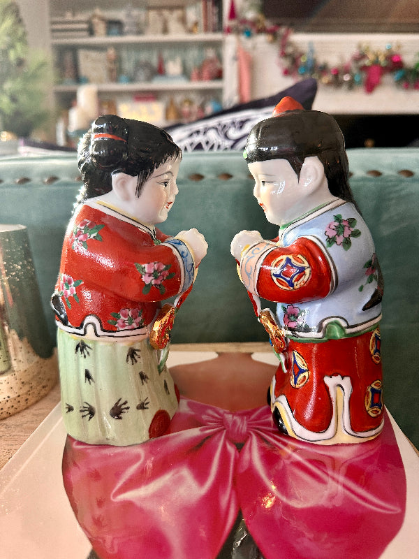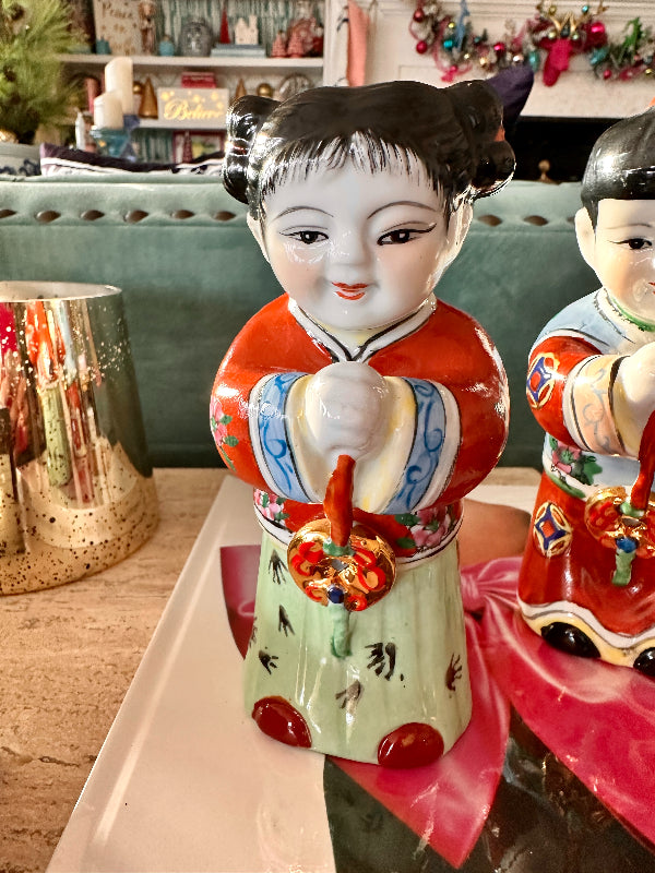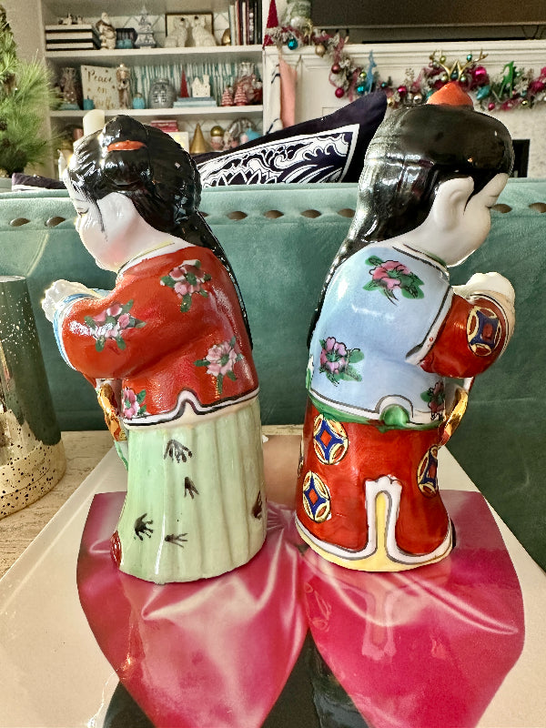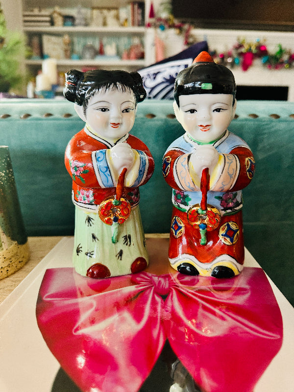 These figures, also known as "Golden Boy" and "Jade Girl" are holding lucky gold coins which represent prosperity. They are dressed in colorful, traditional garb. Each are slightly bent over appearing to bow to each other or to the Emperor. Great vintage condition. Perfect to display or to gift. Bring prosperity to your home with this beautiful pair.
