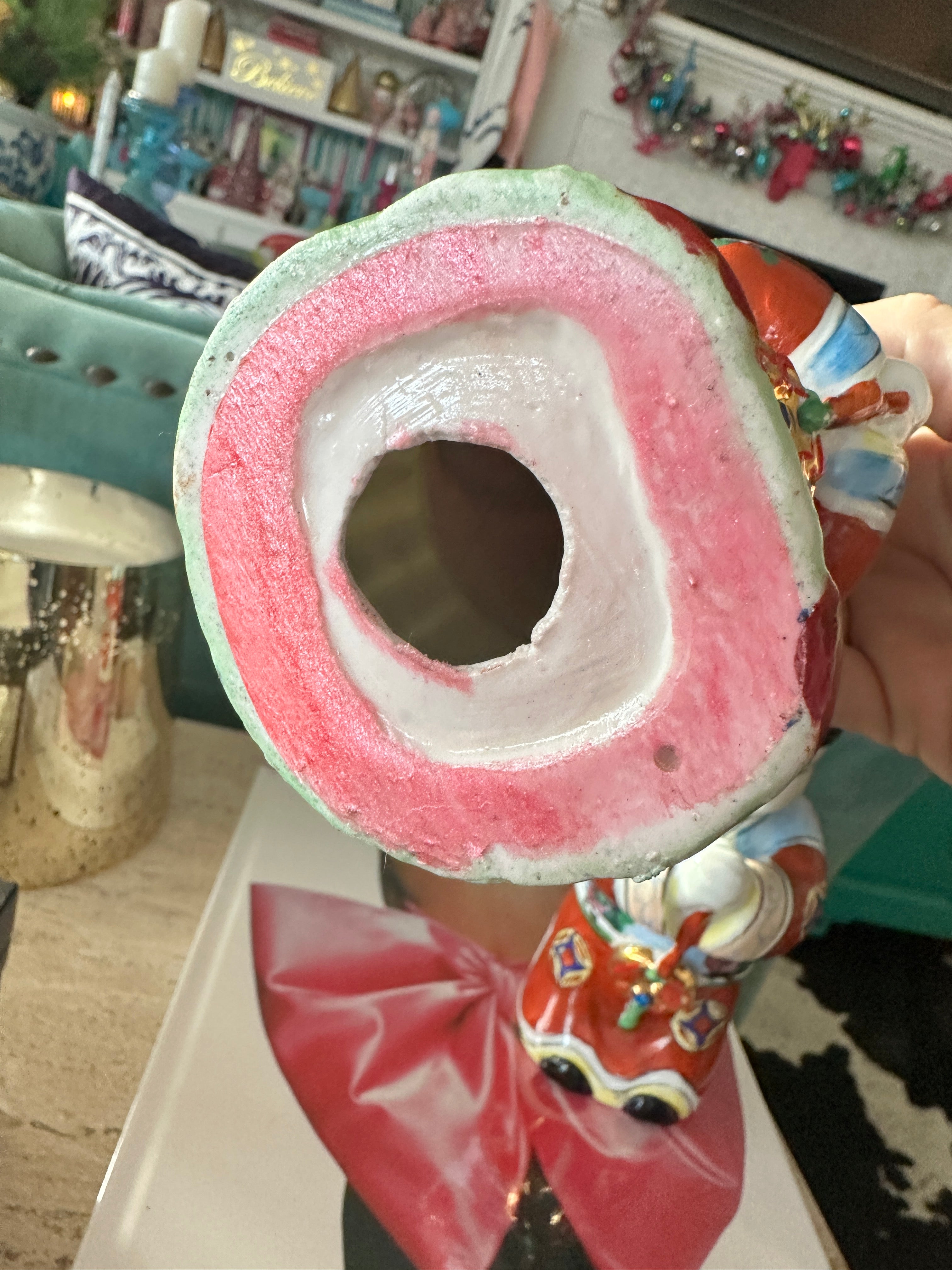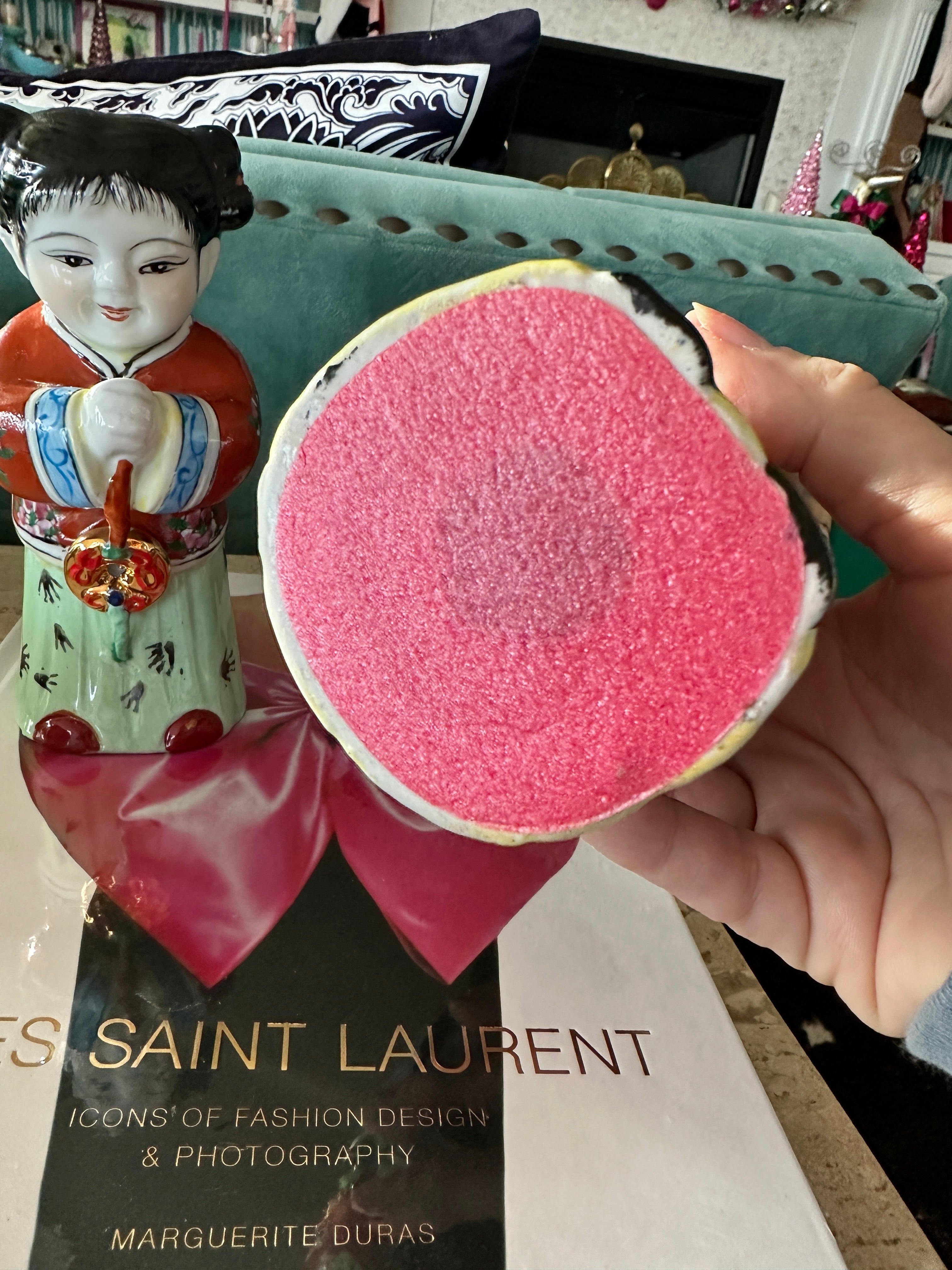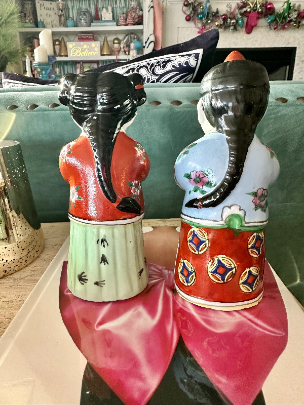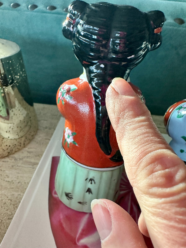 These figures, also known as "Golden Boy" and "Jade Girl" are holding lucky gold coins which represent prosperity. They are dressed in colorful, traditional garb. Each are slightly bent over appearing to bow to each other or to the Emperor. Great vintage condition. Perfect to display or to gift. Bring prosperity to your home with this beautiful pair.