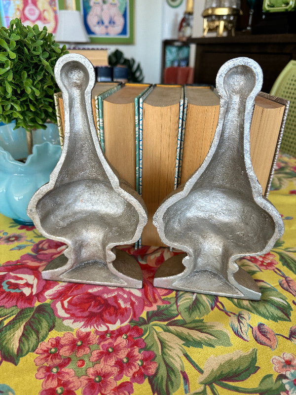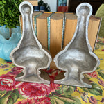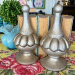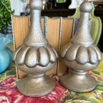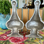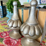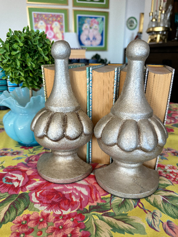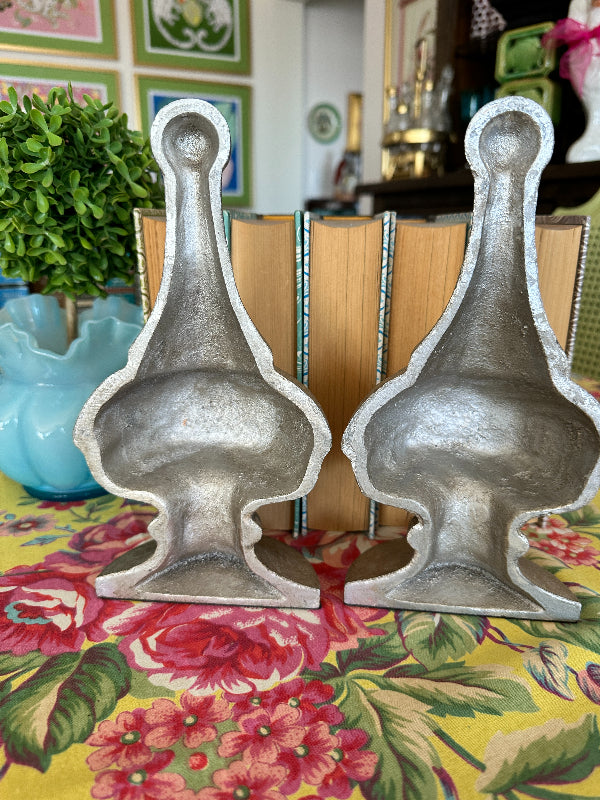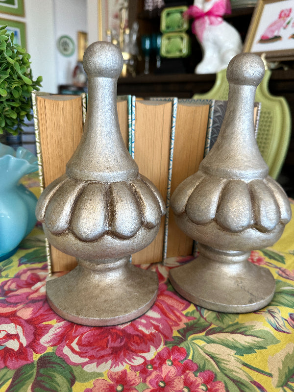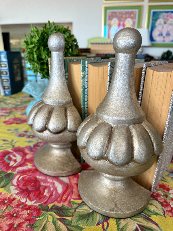 These "heavy metal" bookends have a lovely silver tone and a classic finial shape. They add a touch of tradition to your shelf or table. They would be fun to paint in a bright color. They are a nice and generous size so they really stand out. Great vintage condition.