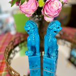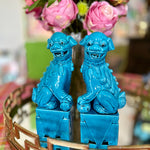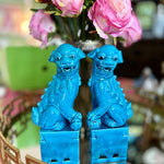 Traditional Chinese Foo Dogs make a wonderful accessory for libraries, living rooms, or foyers. This lovely pair features a blue finish. Each figure sits on a large pedestal. They are bearing their teeth and have black eyes. Made of fine porcelain with a lovely glaze. Each is handmade so there are slight differences in each one. Great vintage condition no chips or cracks.