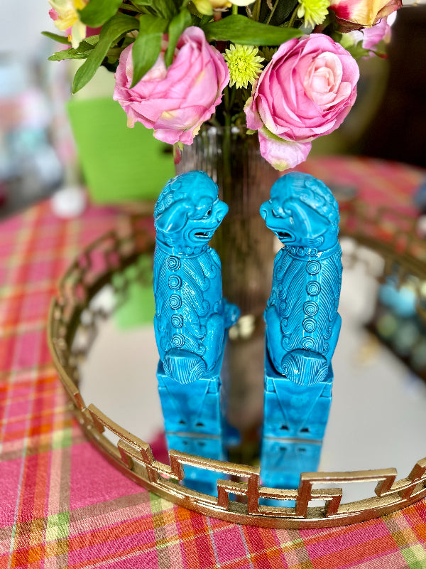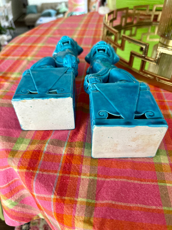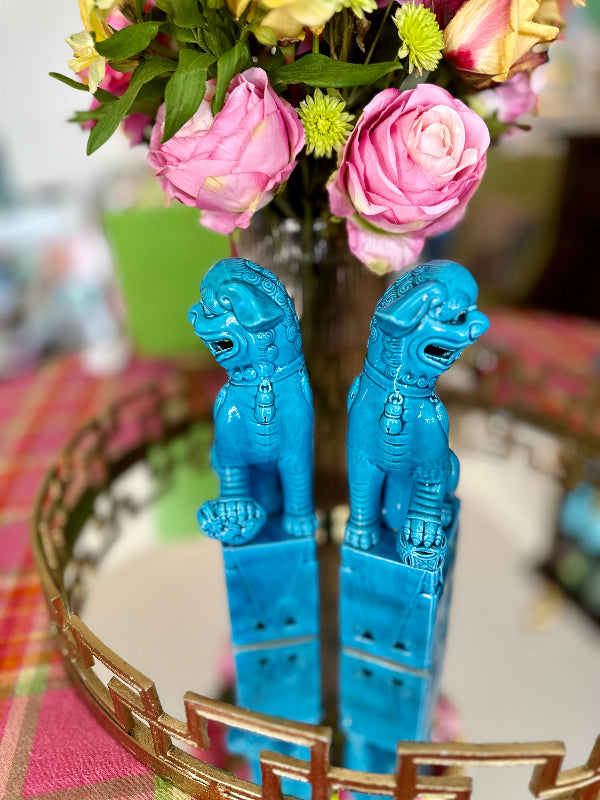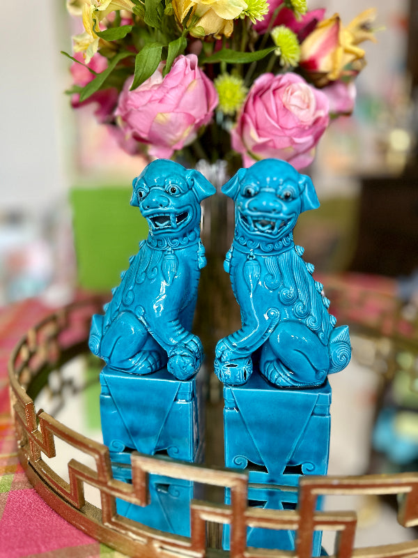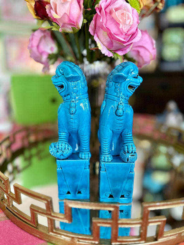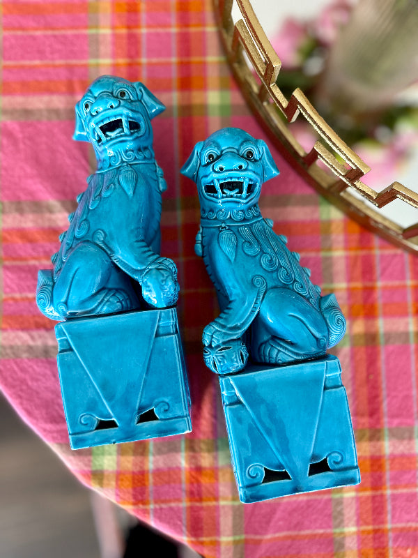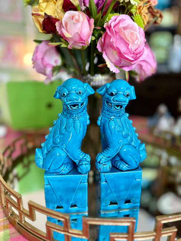 Traditional Chinese Foo Dogs make a wonderful accessory for libraries, living rooms, or foyers. This lovely pair features a blue finish. Each figure sits on a large pedestal. They are bearing their teeth and have black eyes. Made of fine porcelain with a lovely glaze. Each is handmade so there are slight differences in each one. Great vintage condition no chips or cracks.