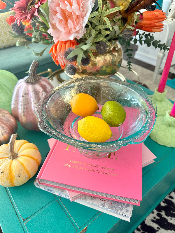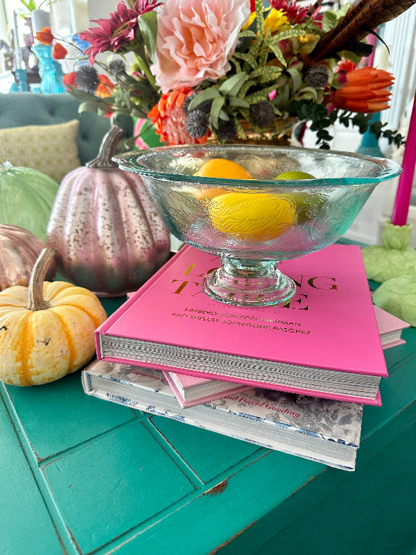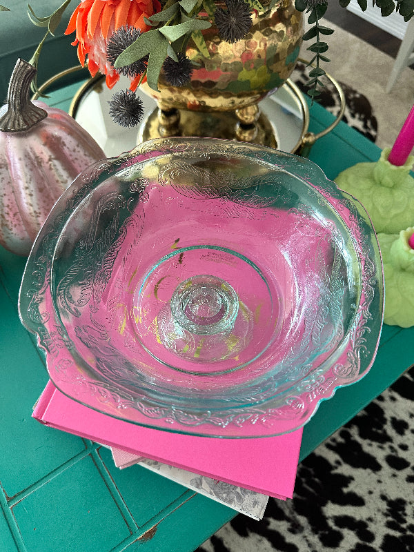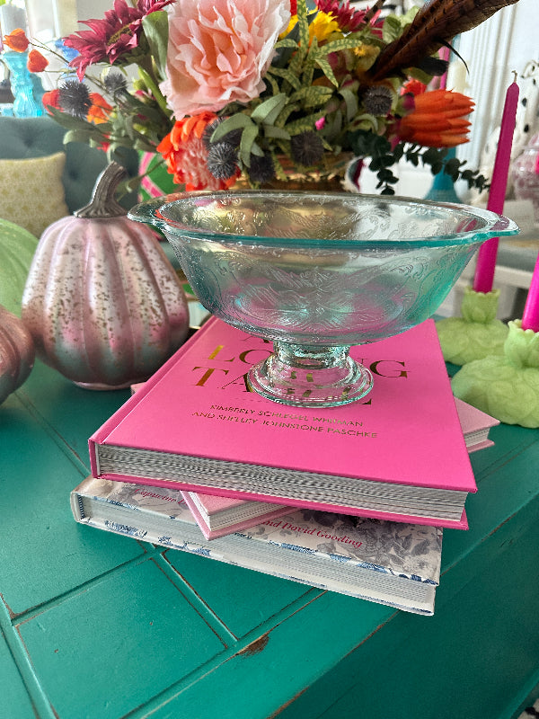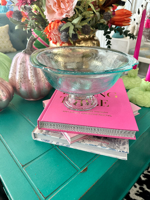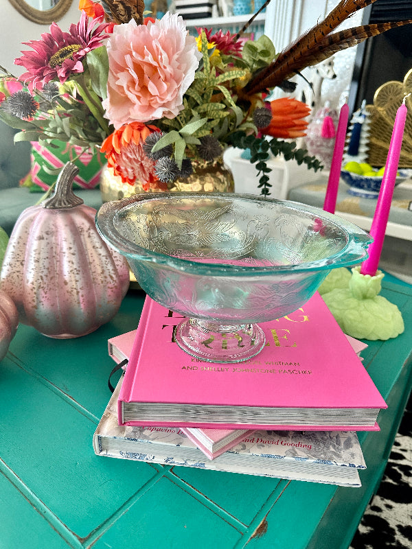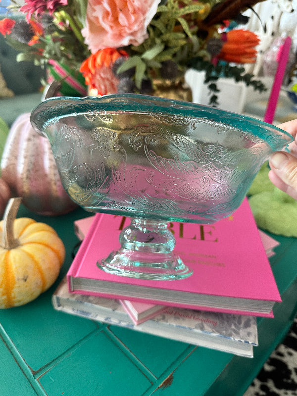 This gorgeous pedestal fruit bowl has a lovely embossed pattern. The aqua colored glass makes a statement. Perfect for fruit, for a floral arrangement or centerpiece filled with anything from pumpkins to ornaments. Makes a lovely gift as well. Pristine vintage conditon.
