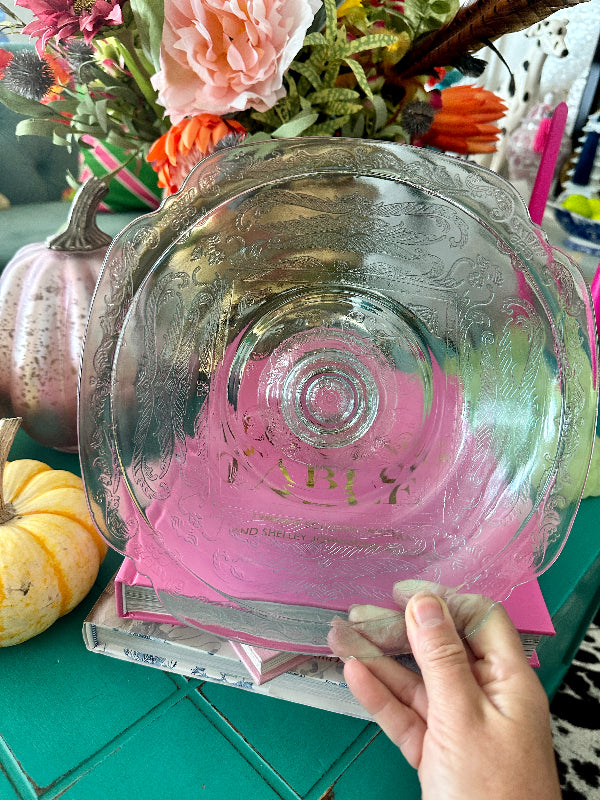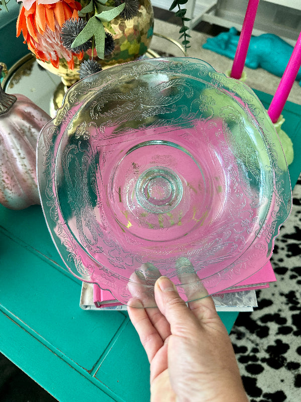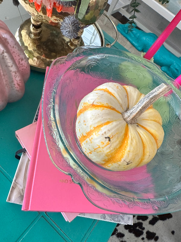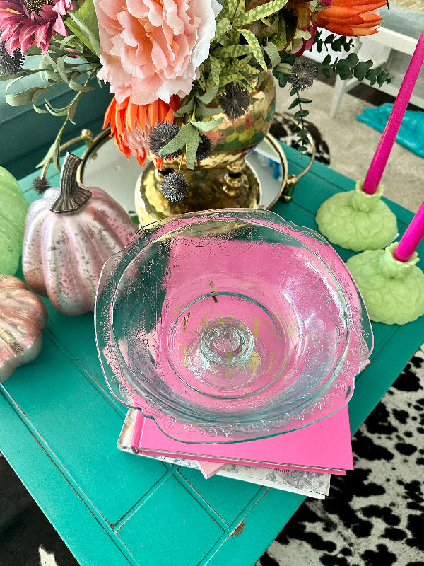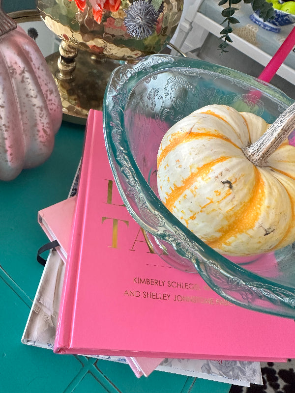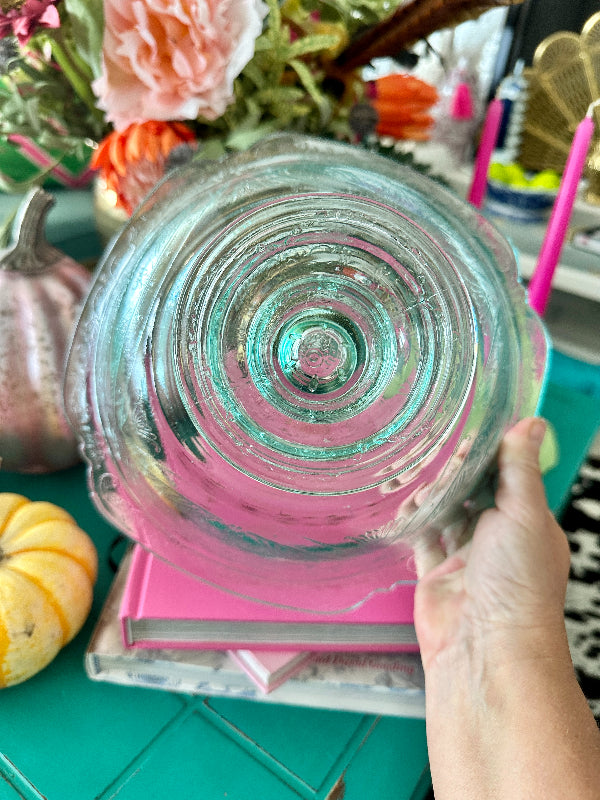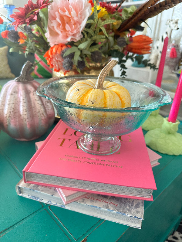 This gorgeous pedestal fruit bowl has a lovely embossed pattern. The aqua colored glass makes a statement. Perfect for fruit, for a floral arrangement or centerpiece filled with anything from pumpkins to ornaments. Makes a lovely gift as well. Pristine vintage conditon.