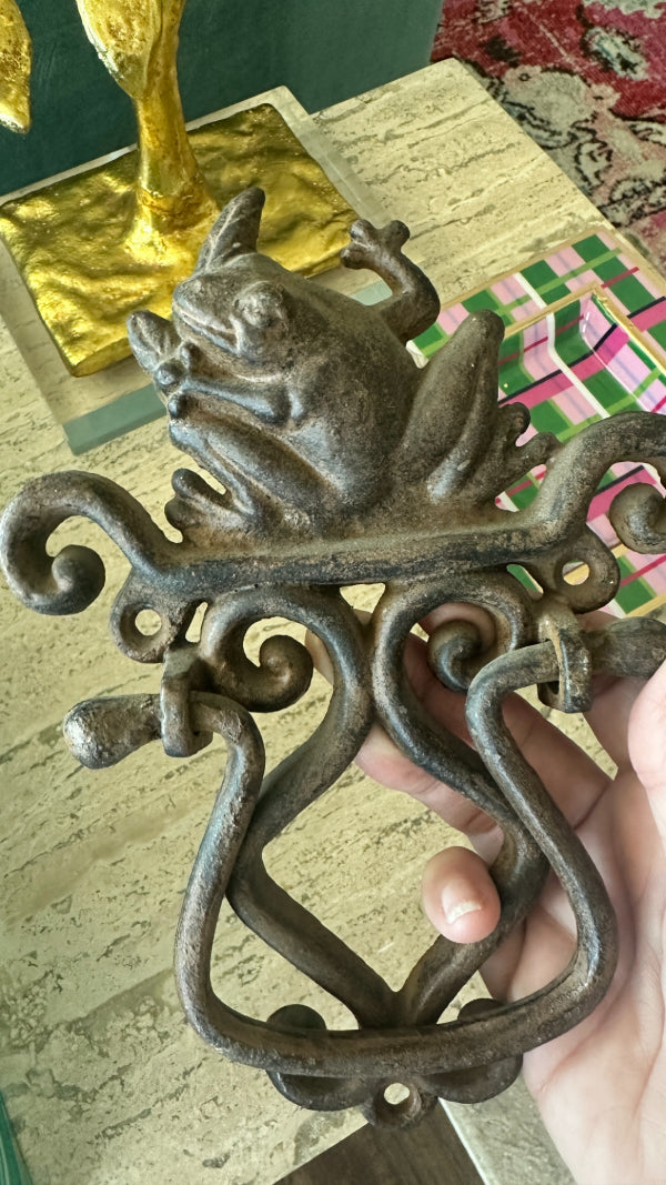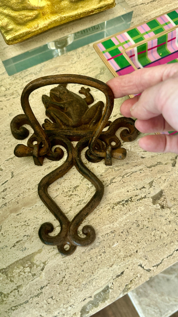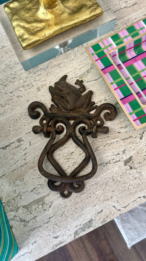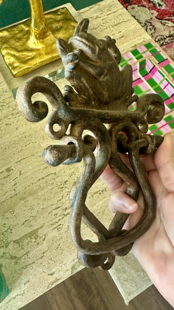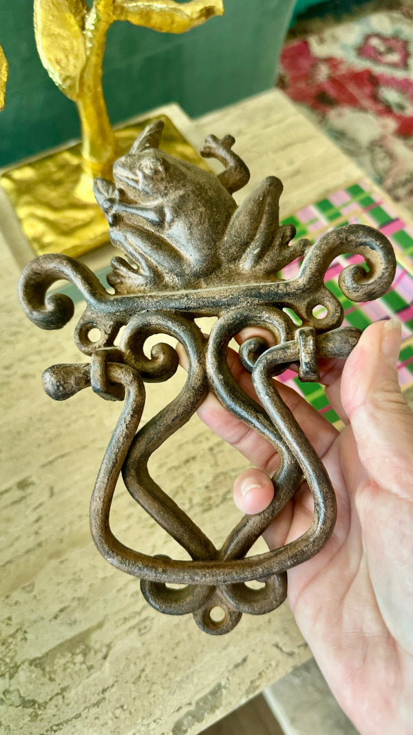 Add whimsical charm to your entryway with this vintage frog door knocker. Crafted with character and detail, it’s a playful yet classic accent perfect for garden-themed decor or unique home accents. Perfect for a garden gate or back door.