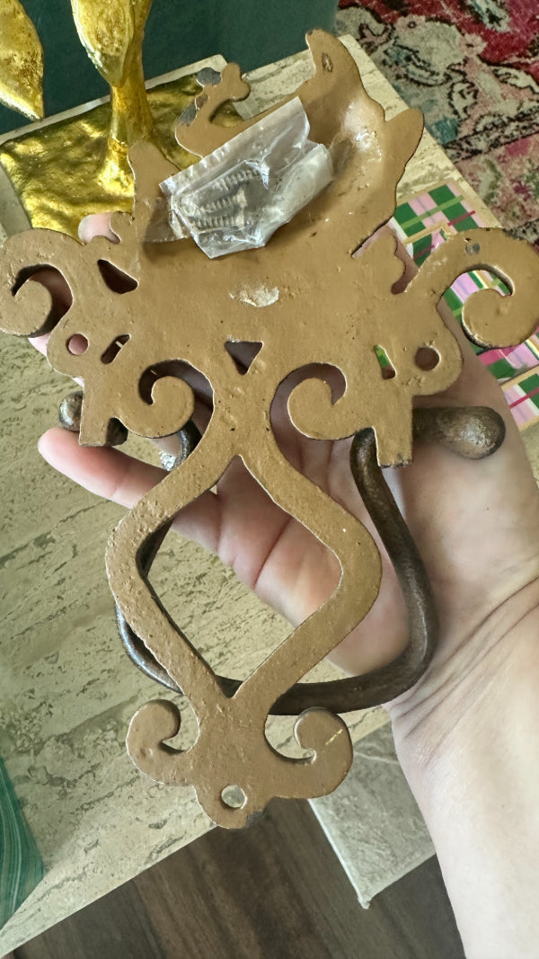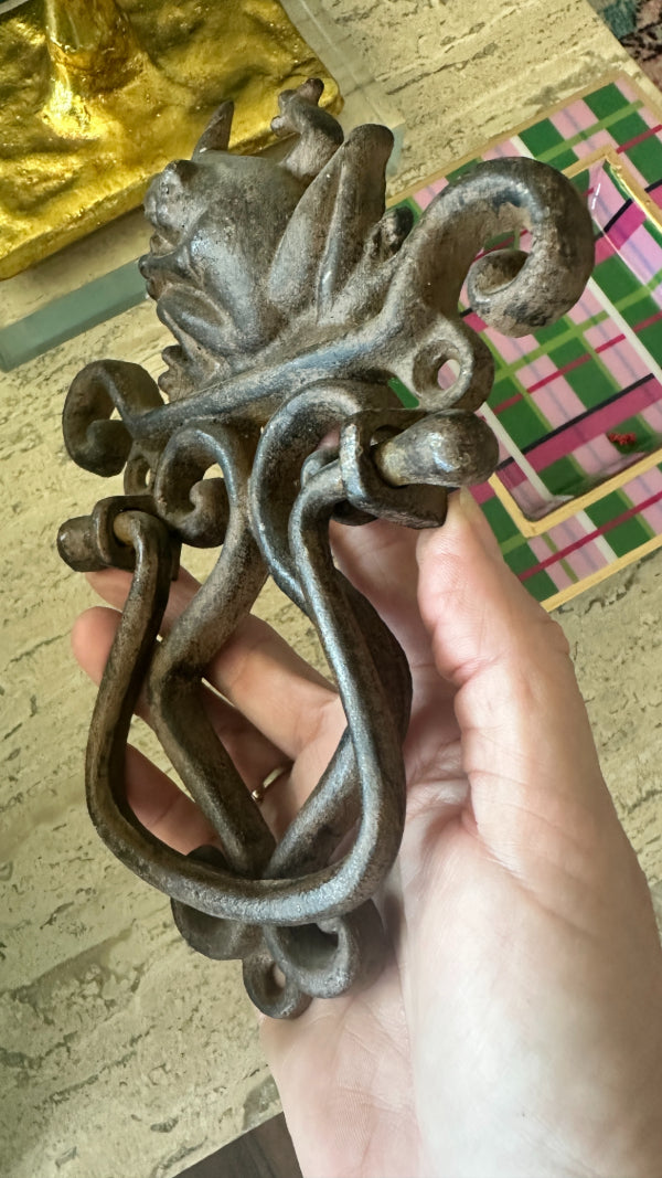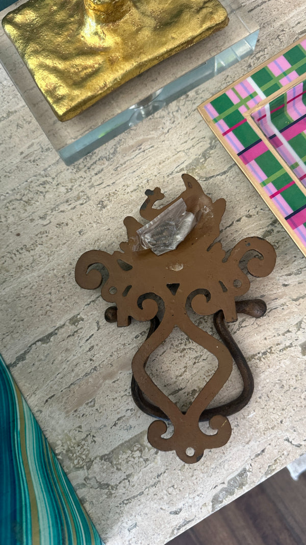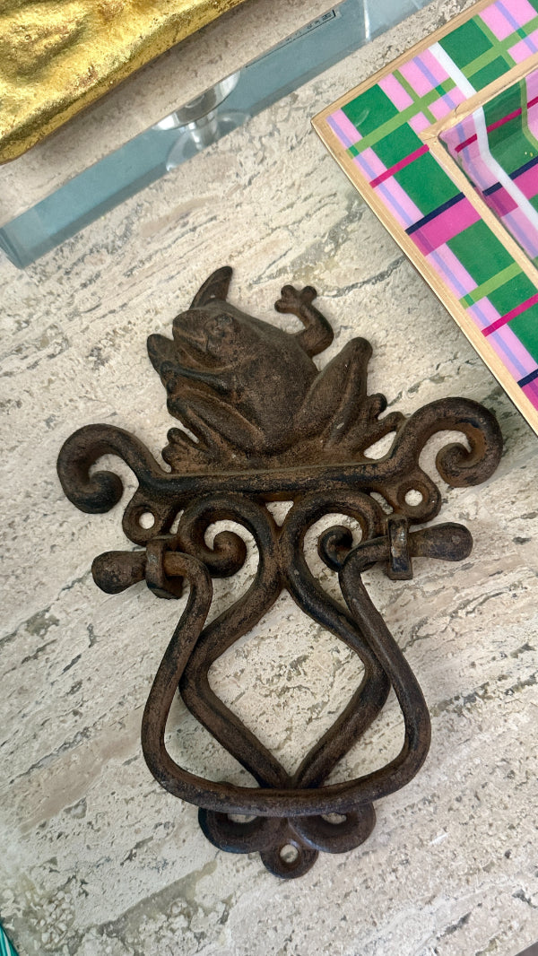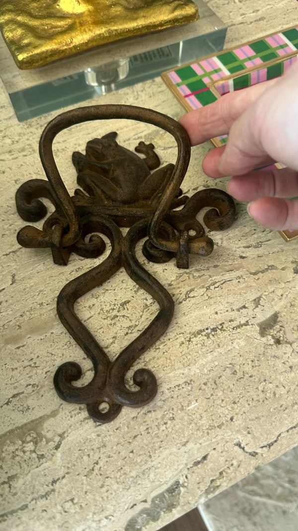 Add whimsical charm to your entryway with this vintage frog door knocker. Crafted with character and detail, it’s a playful yet classic accent perfect for garden-themed decor or unique home accents. Perfect for a garden gate or back door.